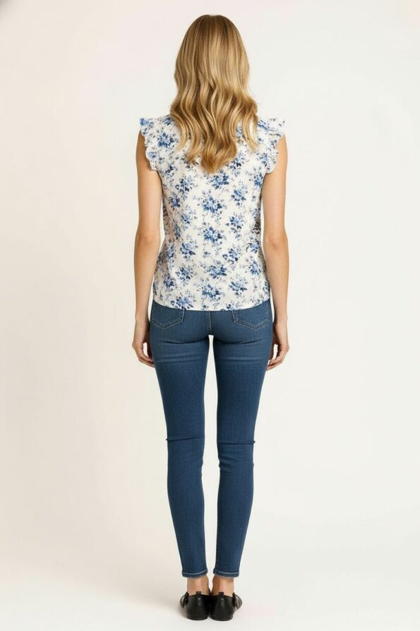 Blusa de manga corta con ligero frunce en los hombros que aporta volumen delicado, cuello redondo con detalle de olan que enmarca el escote, abertura en forma de gota con cierre de botón que añade un toque femenino y elegante, confección en tela ligera que brinda comodidad y frescura