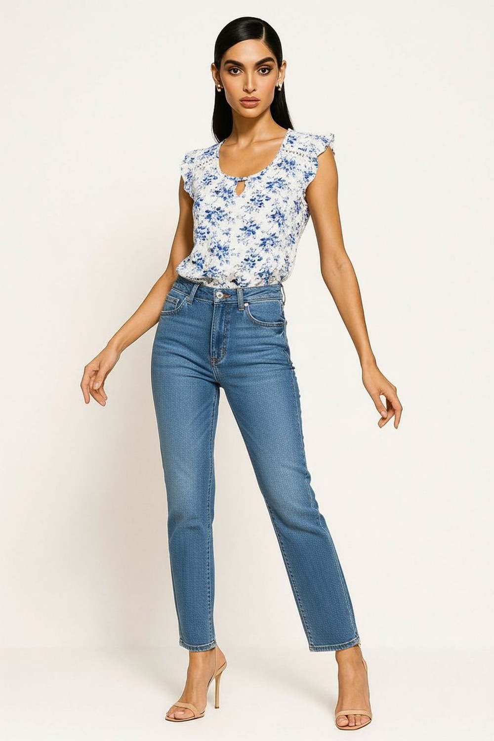Blusa sin mangas de corte recto con cuello alto fruncido y abertura posterior con botón, diseño ligero con caída natural que estiliza la parte superior, confección en tela suave de textura ligera que brinda frescura y comodidad prolongada