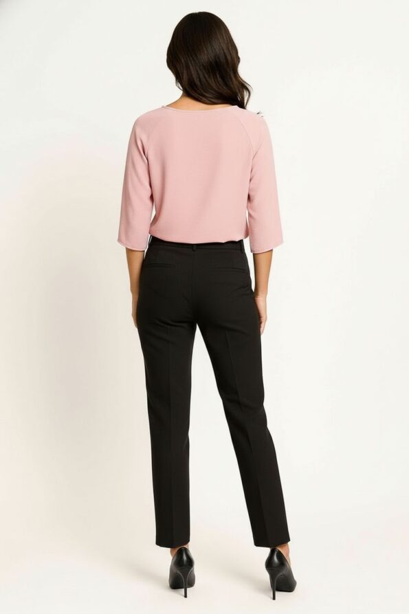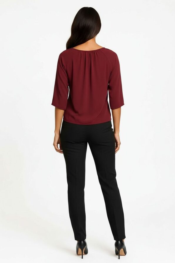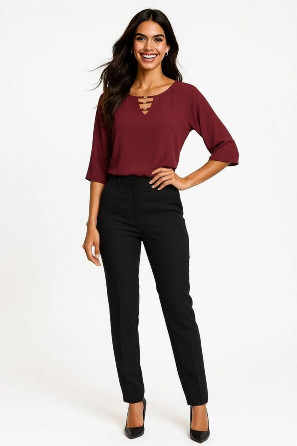 Blusa con escote redondo decorado con tres herrajes metálicos al frente que aportan un toque contemporáneo, manga tres cuartos con caída natural que brinda comodidad, corte recto que favorece distintos tipos de silueta, confección en tejido ligero con textura suave que aporta frescura y movimiento al vestir