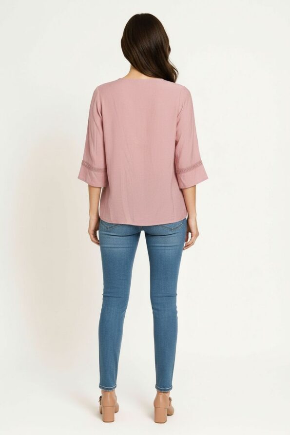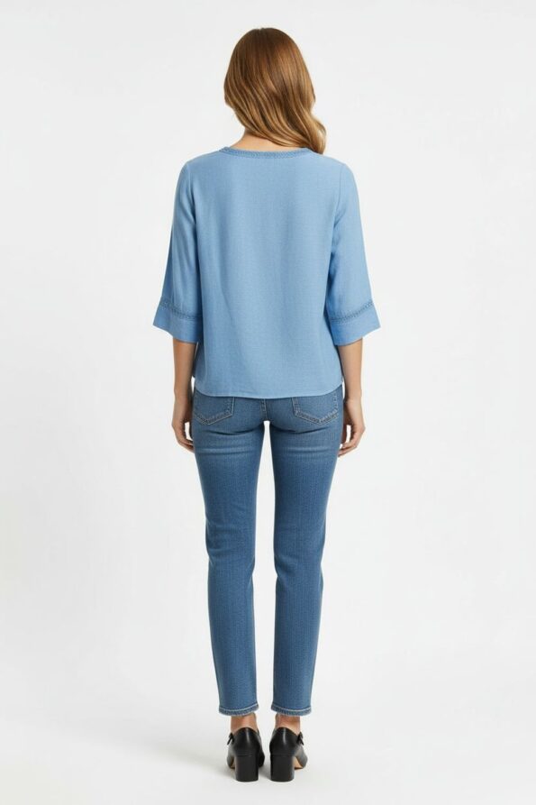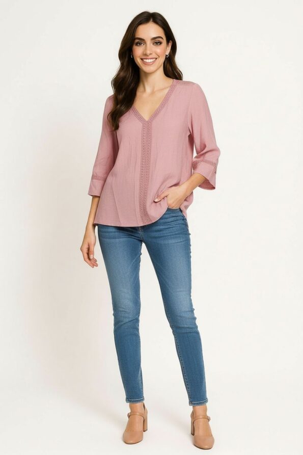 Blusa de manga tres cuartos con escote en V adornado con aplicaciones decorativas que aportan un toque elegante, corte recto que garantiza comodidad, caída fluida que acompaña el movimiento, confeccionada en tejido ligero de textura suave que brinda frescura y estilo para el día a día