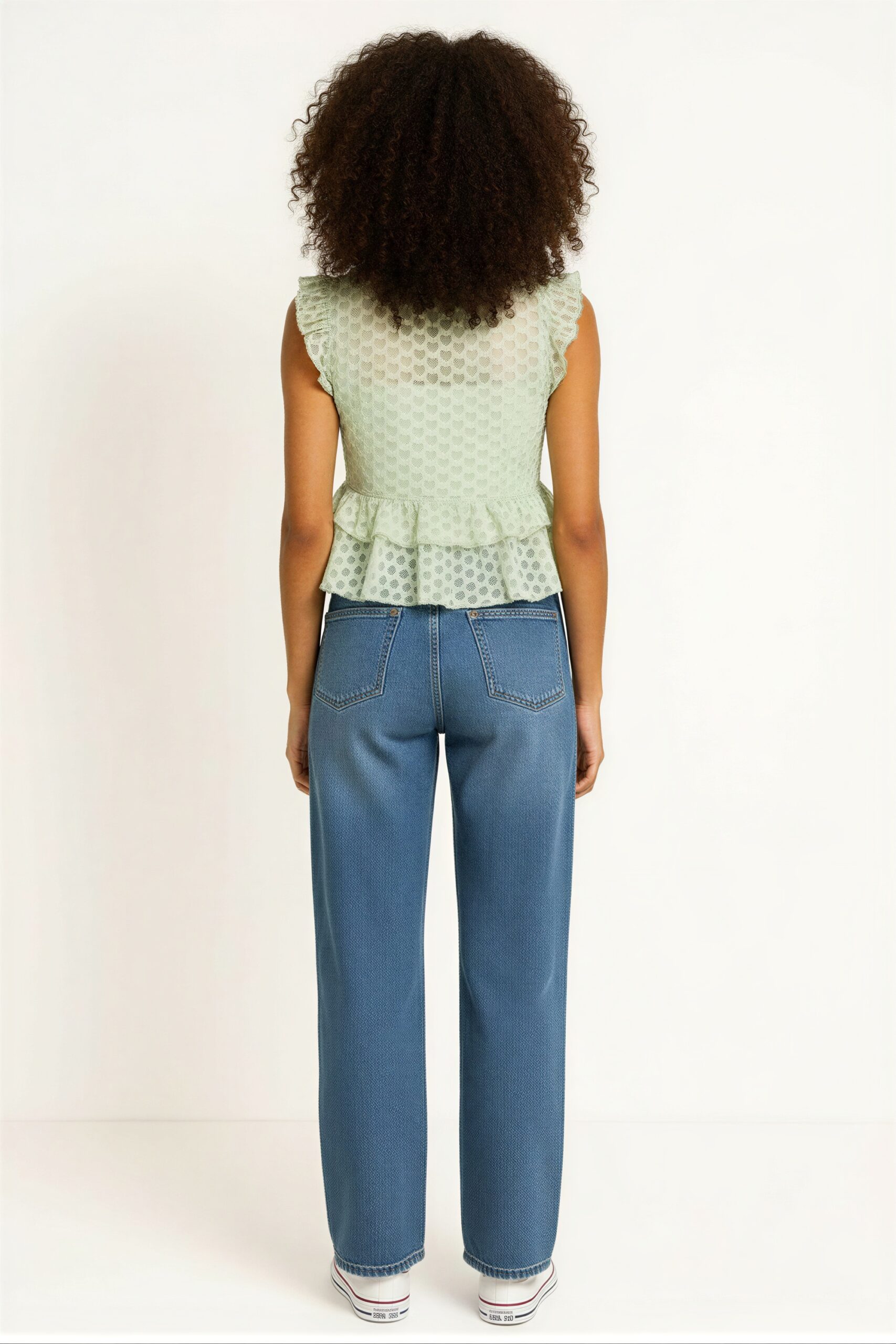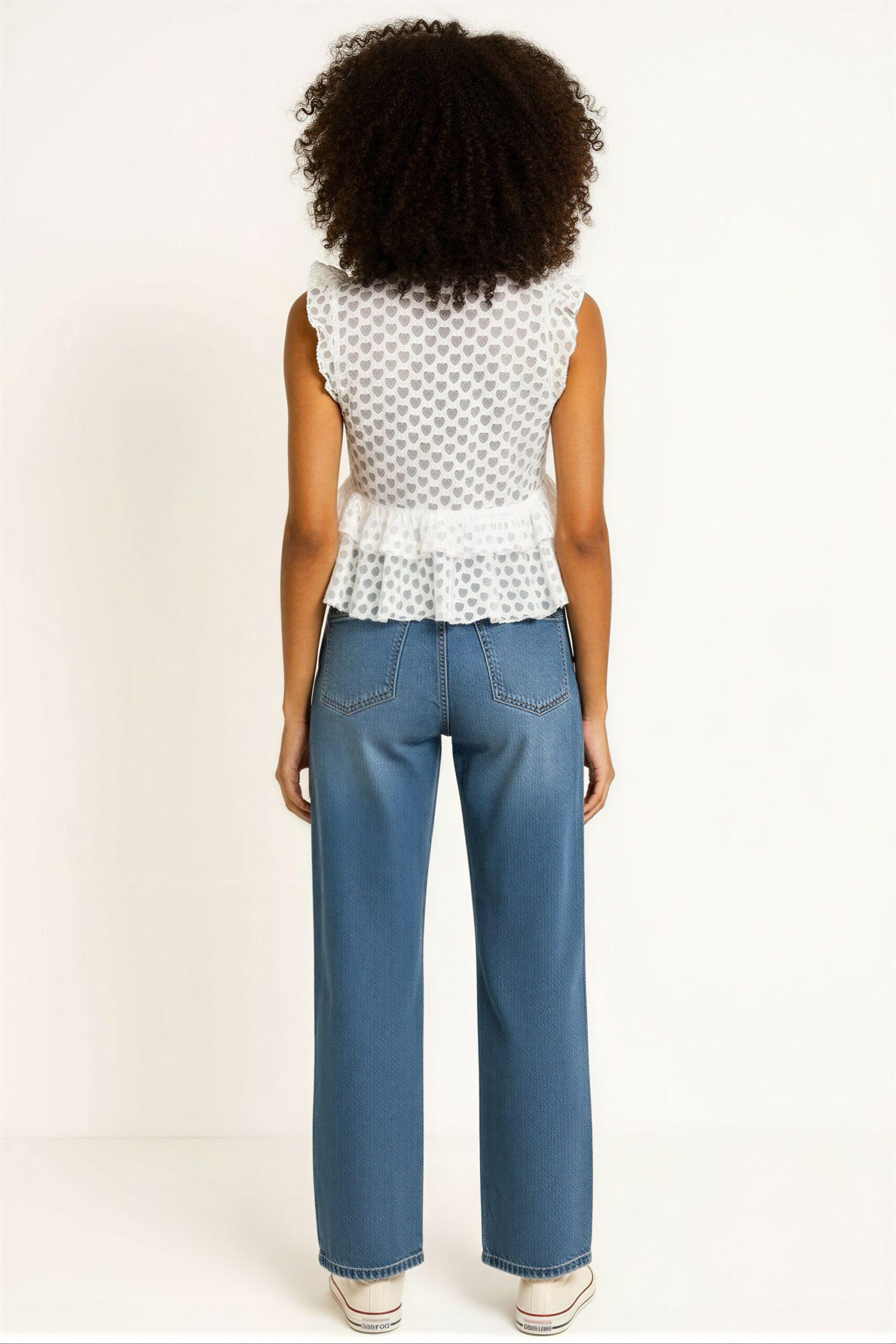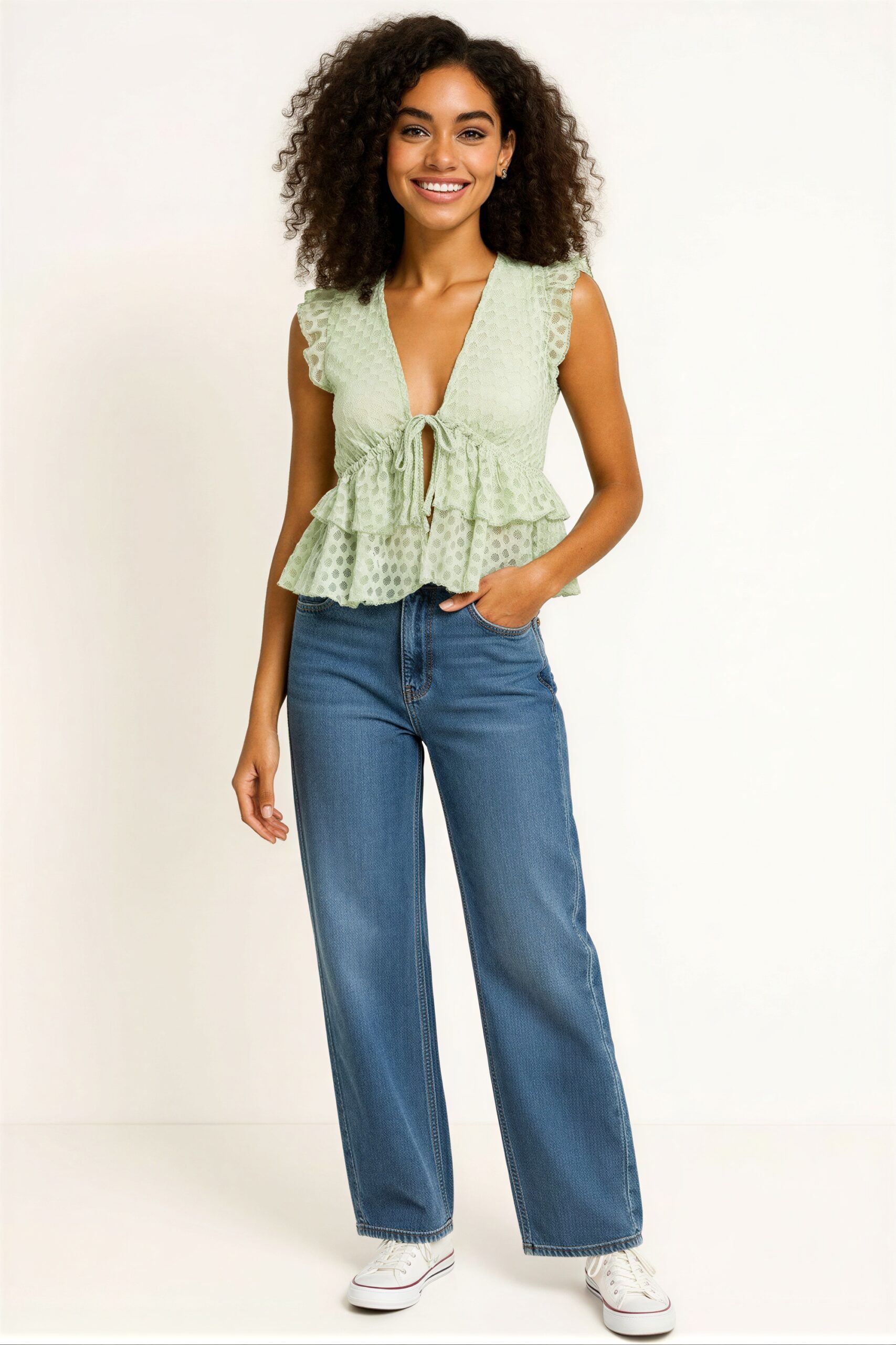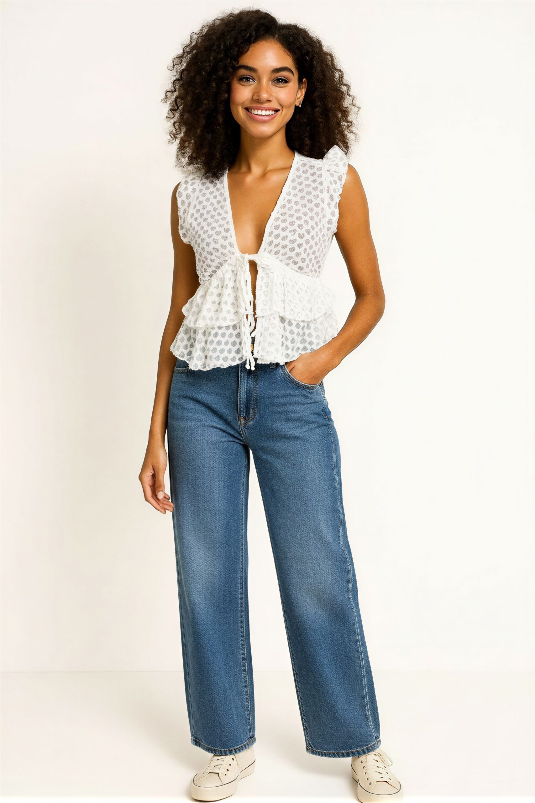 Blusa con aplicación de encaje, escote pronunciado, detalle de jareta al frente, ajuste ligero, tela suave con textura, confección delicada