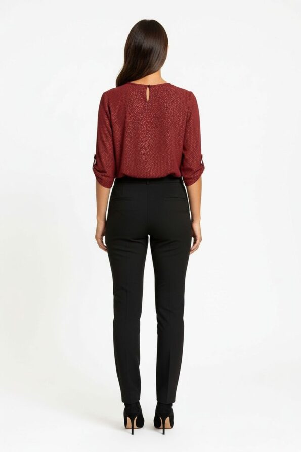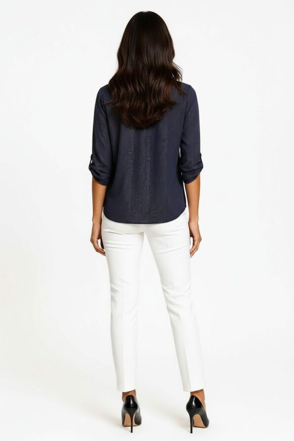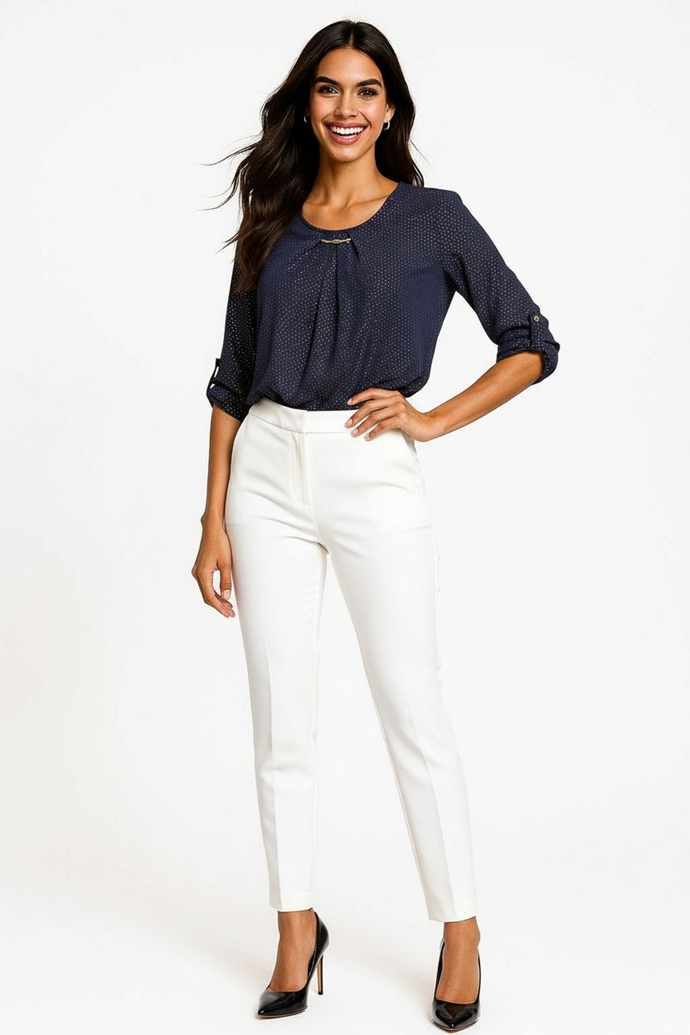Blusa de caída ligera con escote redondo adornado con herraje metálico que aporta un toque elegante, pinza frontal que favorece el ajuste y define la figura, manga tres cuartos con trabilla ajustable que brinda practicidad, confección en tejido fluido que ofrece comodidad y estilo sofisticado