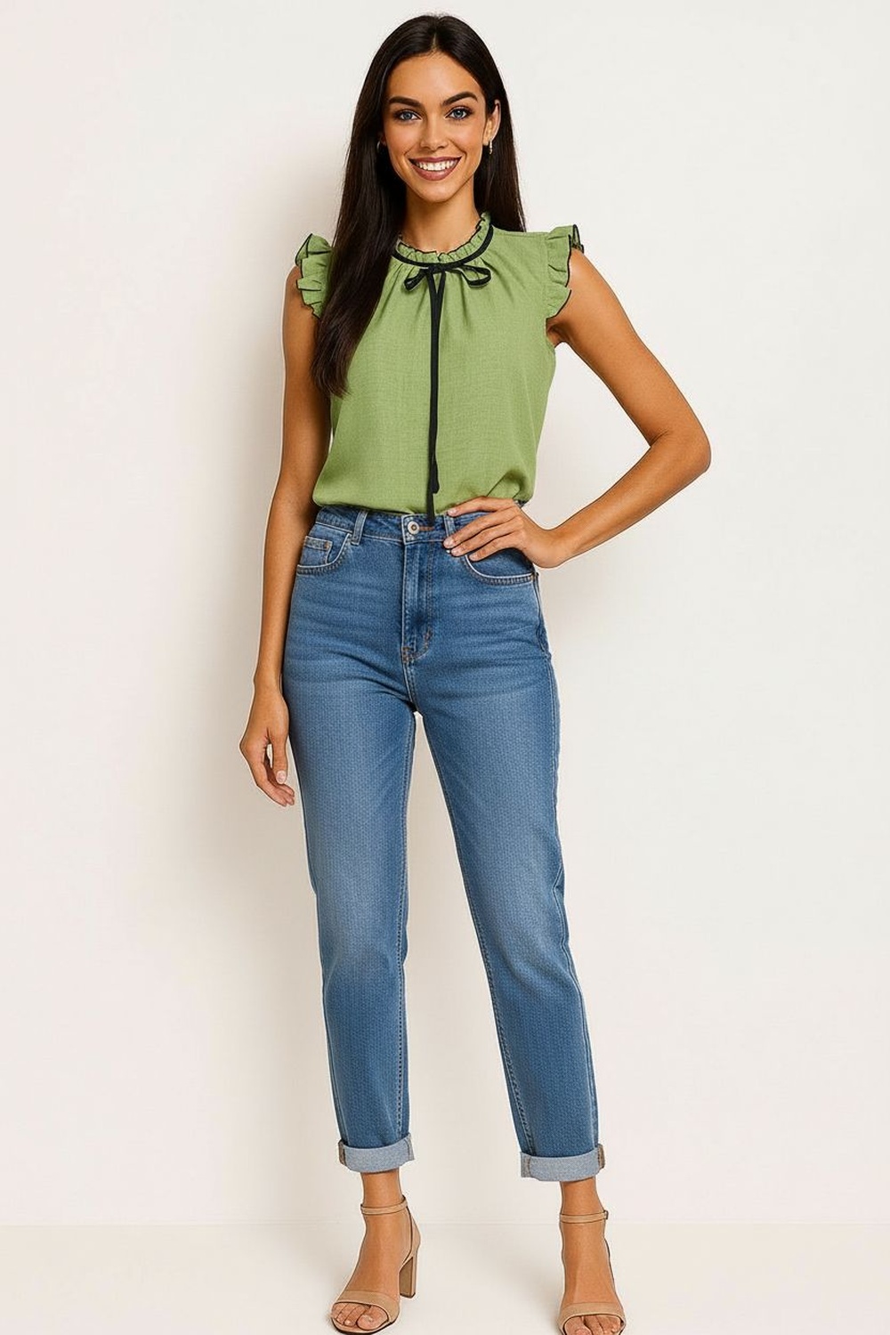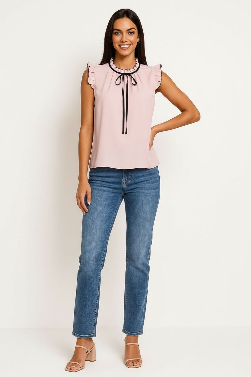 Blusa sin mangas cuello fruncido con jareta para ajustar detalle de lazo frontal silueta recta terminación redondeada confección ligera
