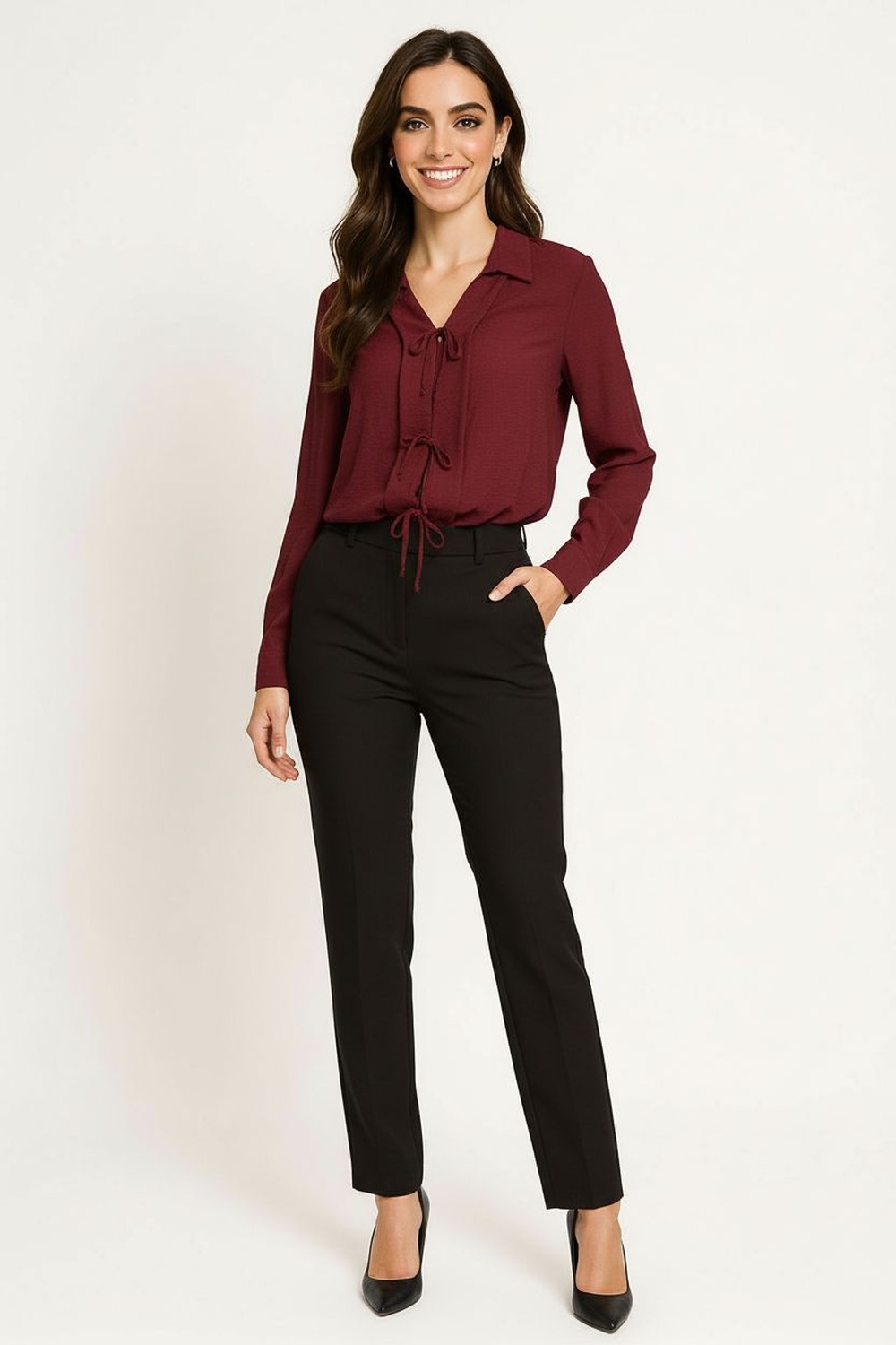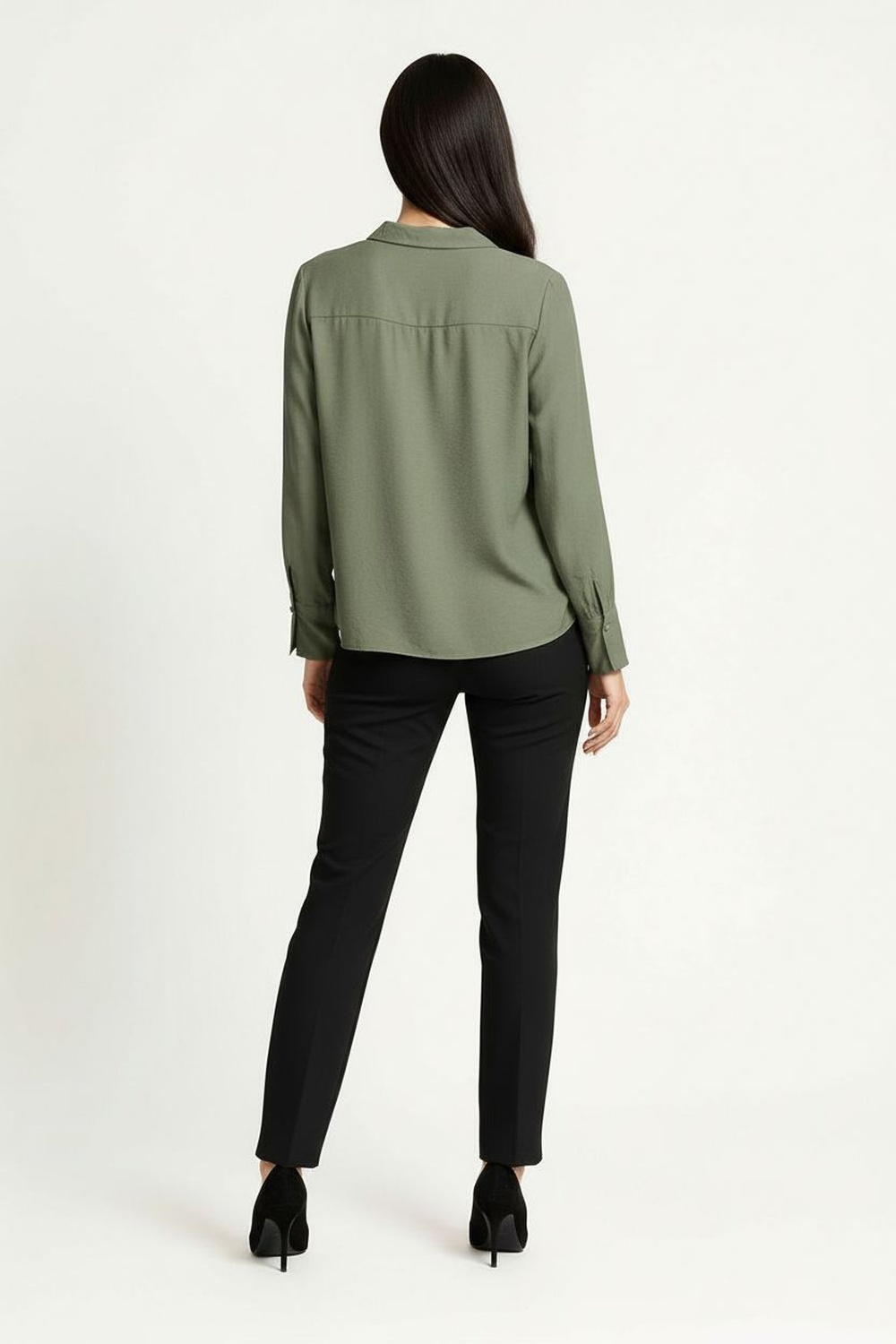 Blusa de manga larga con cuello camisero estructurado, jaretas frontales ajustables que permiten definir la silueta, confección ligera con caída fluida, largo a la cadera que favorece movilidad y mantiene un toque moderno
