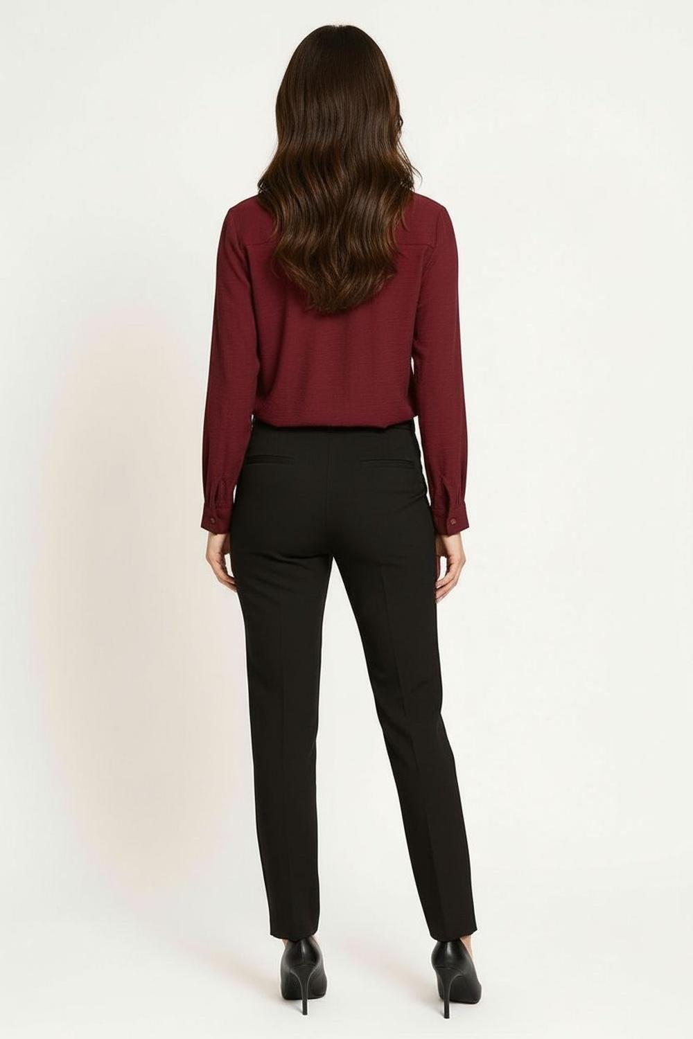 Pantalón de tiro medio con estructura semielástica que aporta confort, corte acampanado que equilibra la silueta y brinda movimiento, cinco bolsillos funcionales con acabado resistente, pretina con trabillas y cierre frontal clásico que asegura ajuste firme