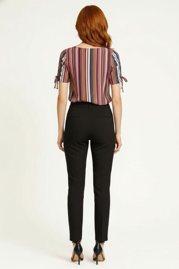 Blusa de manga corta con hombro ligeramente abullonado que aporta volumen y estilo, escote redondo con detalles de lazos frontales que permiten un ajuste femenino y delicado, corte con ligera amplitud en la parte baja que forma volantes favoreciendo la silueta y aportando movimiento, confección en tejido ligero que ofrece frescura y comodidad