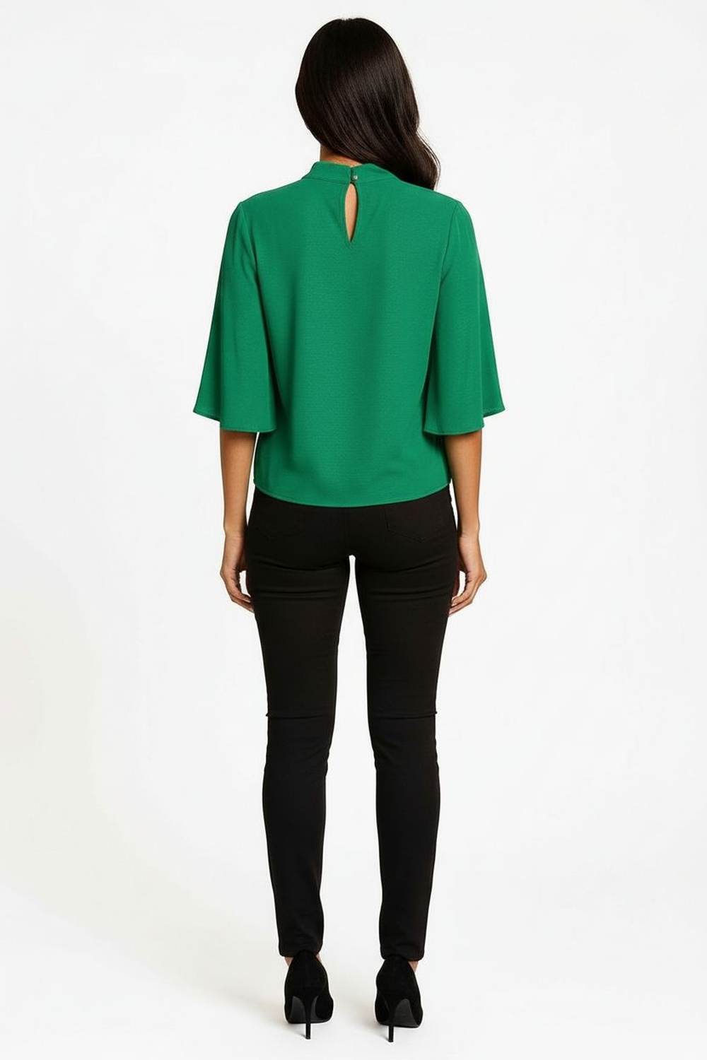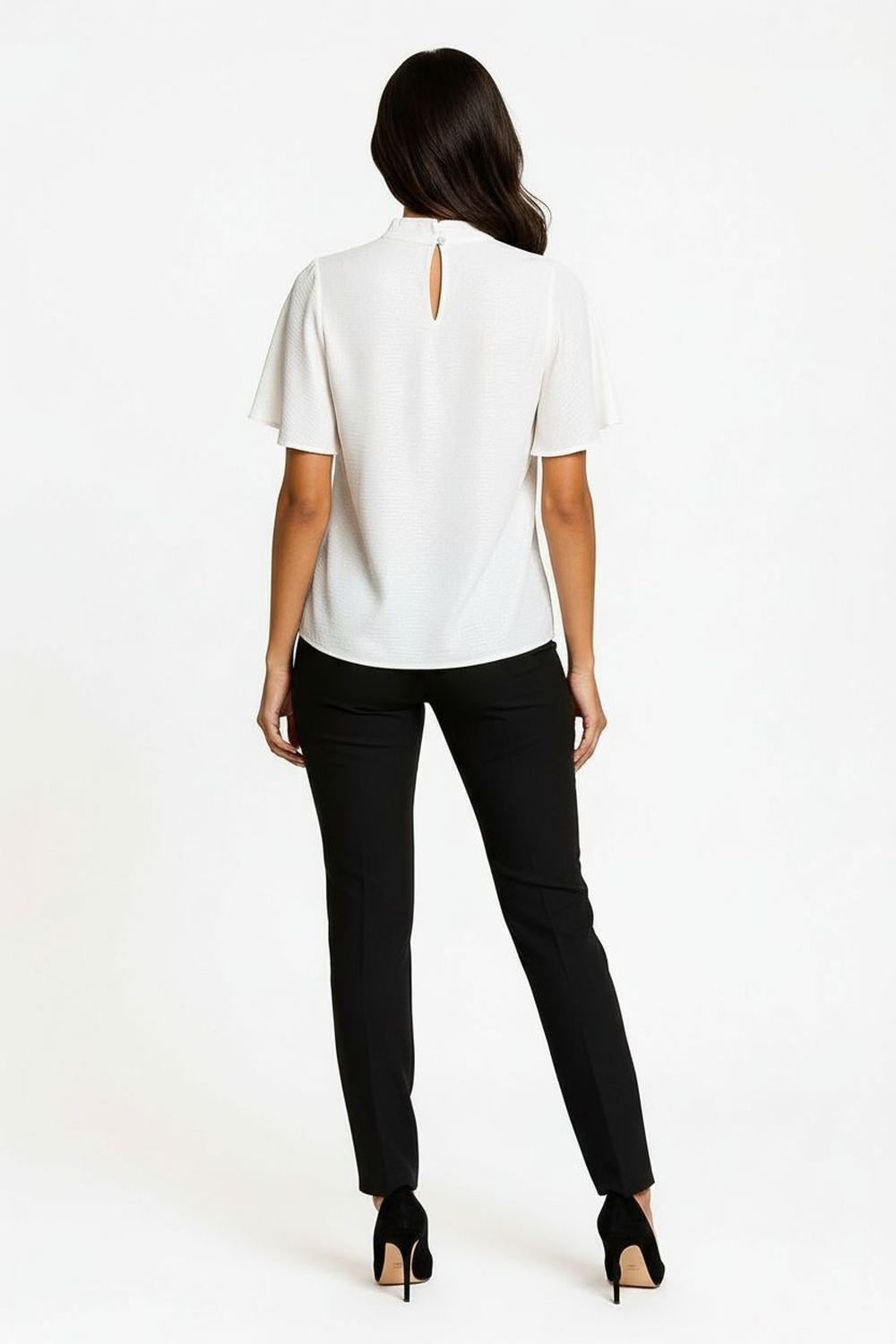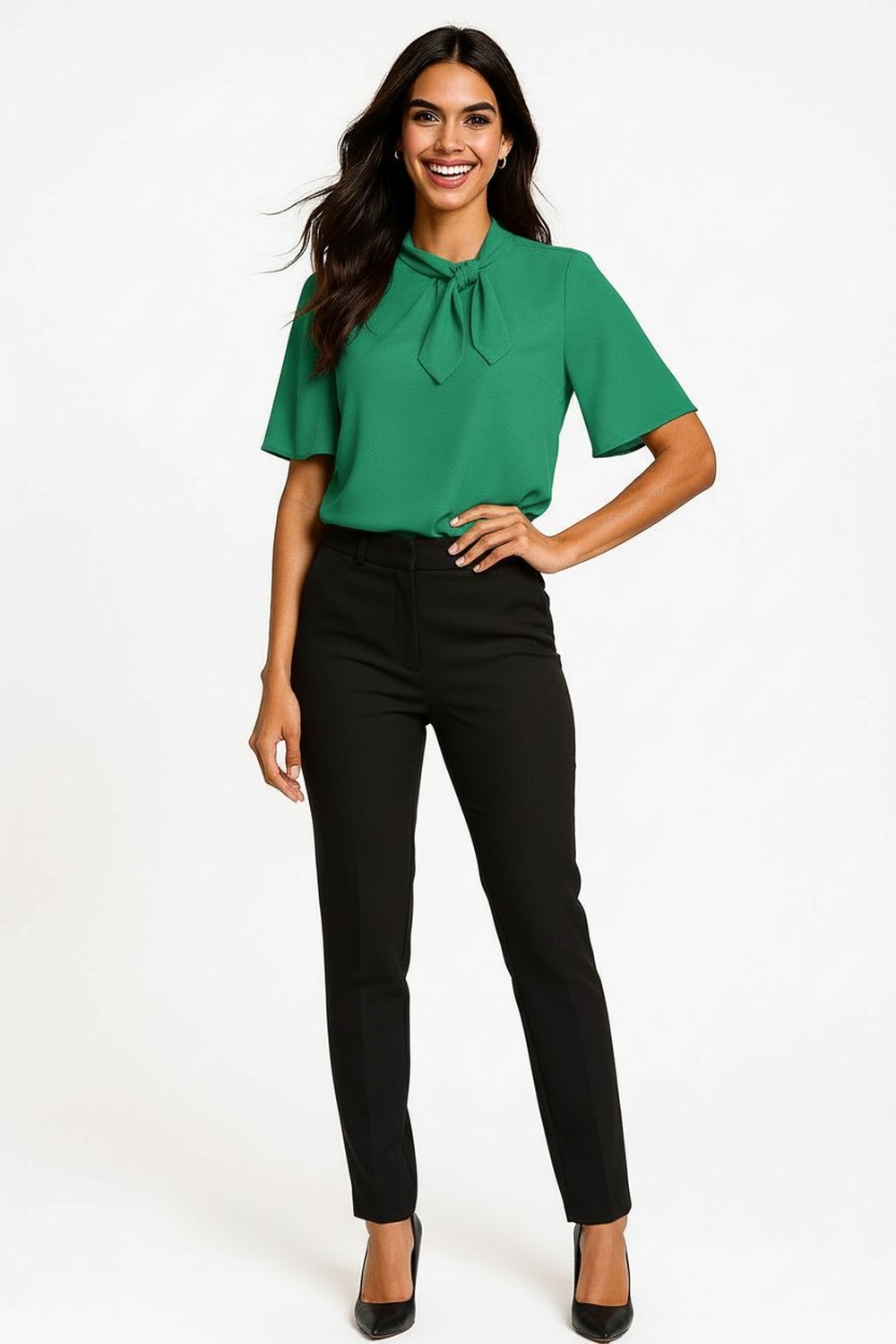 Blusa de tejido suave con cuello alto adornado con lazo lateral, manga corta amplia que aporta caída elegante, diseño fluido que otorga comodidad y acabado con textura ligera