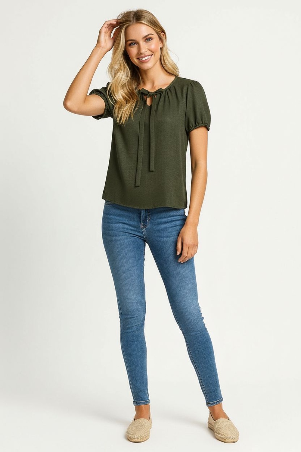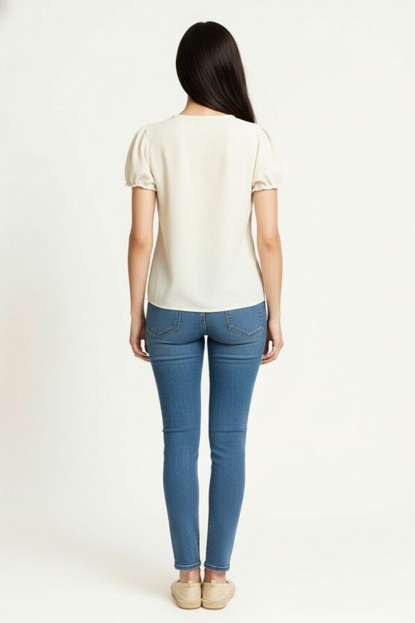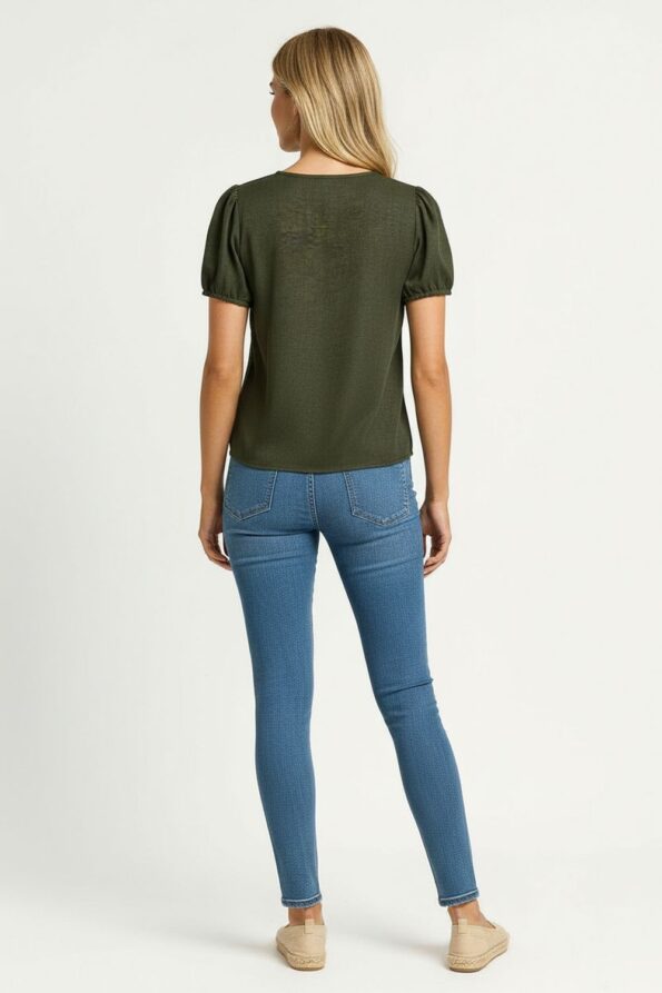 Blusa con escote redondo y lazo frontal que añade un detalle femenino y elegante, manga corta con ligero frunce que aporta volumen sutil, corte recto que se adapta a diferentes figuras, confección en tela ligera con textura suave que ofrece comodidad y una caída natural que realza el diseño