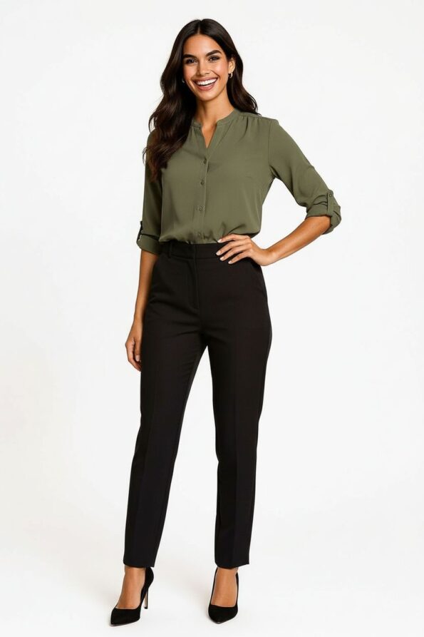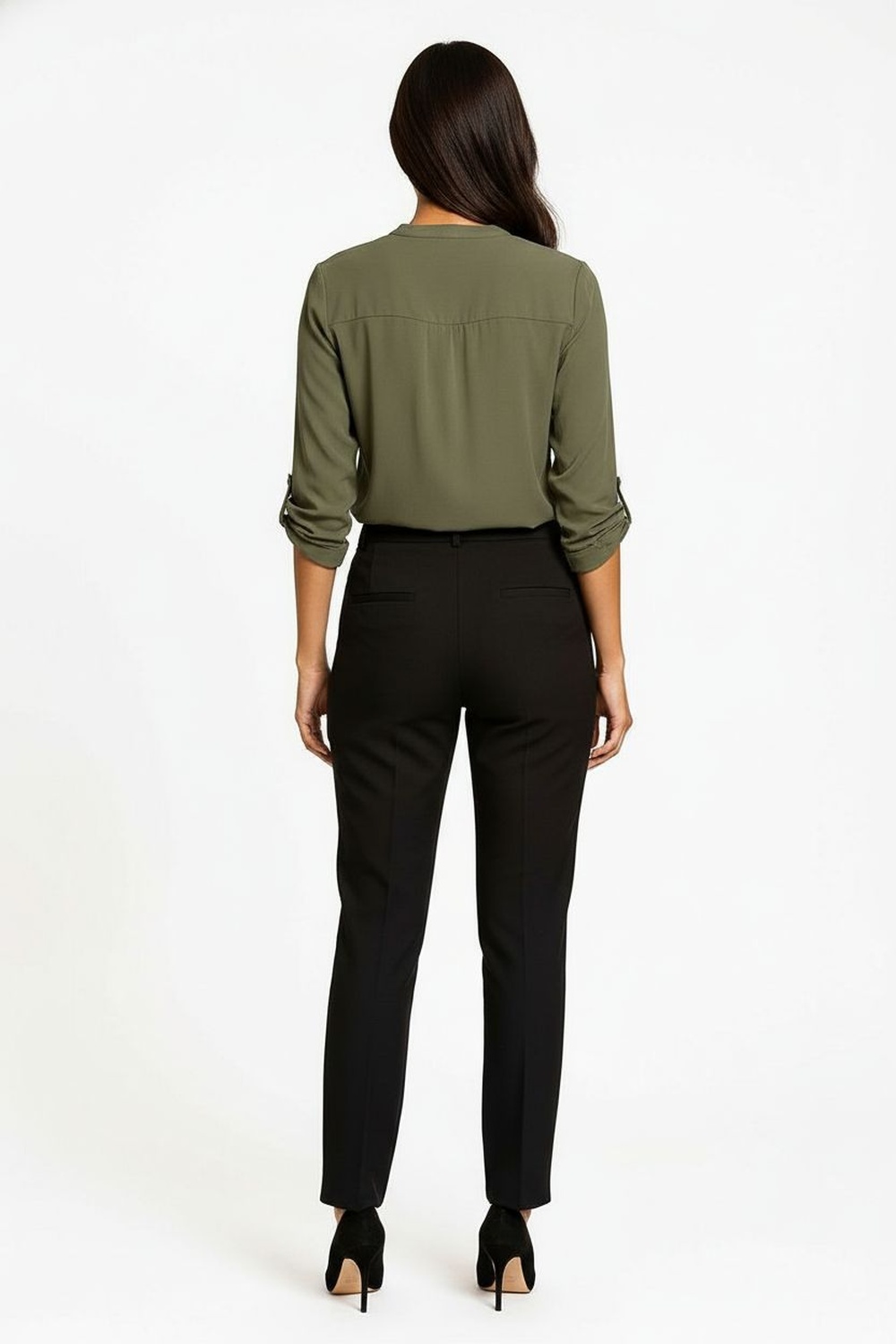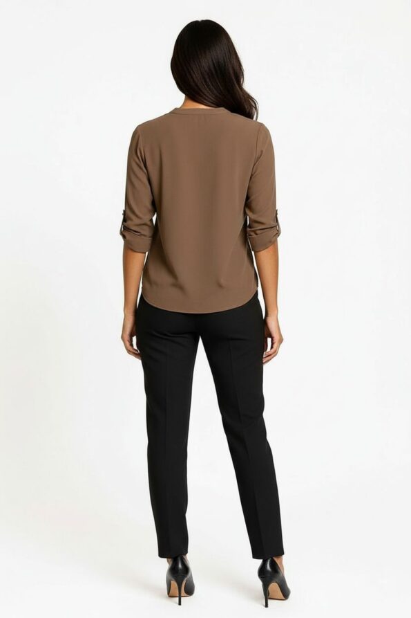 Blusa con cuello mao y escote en V que aporta un toque moderno y versátil, charreteras en los hombros que añaden detalle estructurado, manga larga con ajuste mediante botón para llevarse doblada o extendida, confección en tejido ligero de caída suave que brinda comodidad y elegancia en cualquier ocasión
