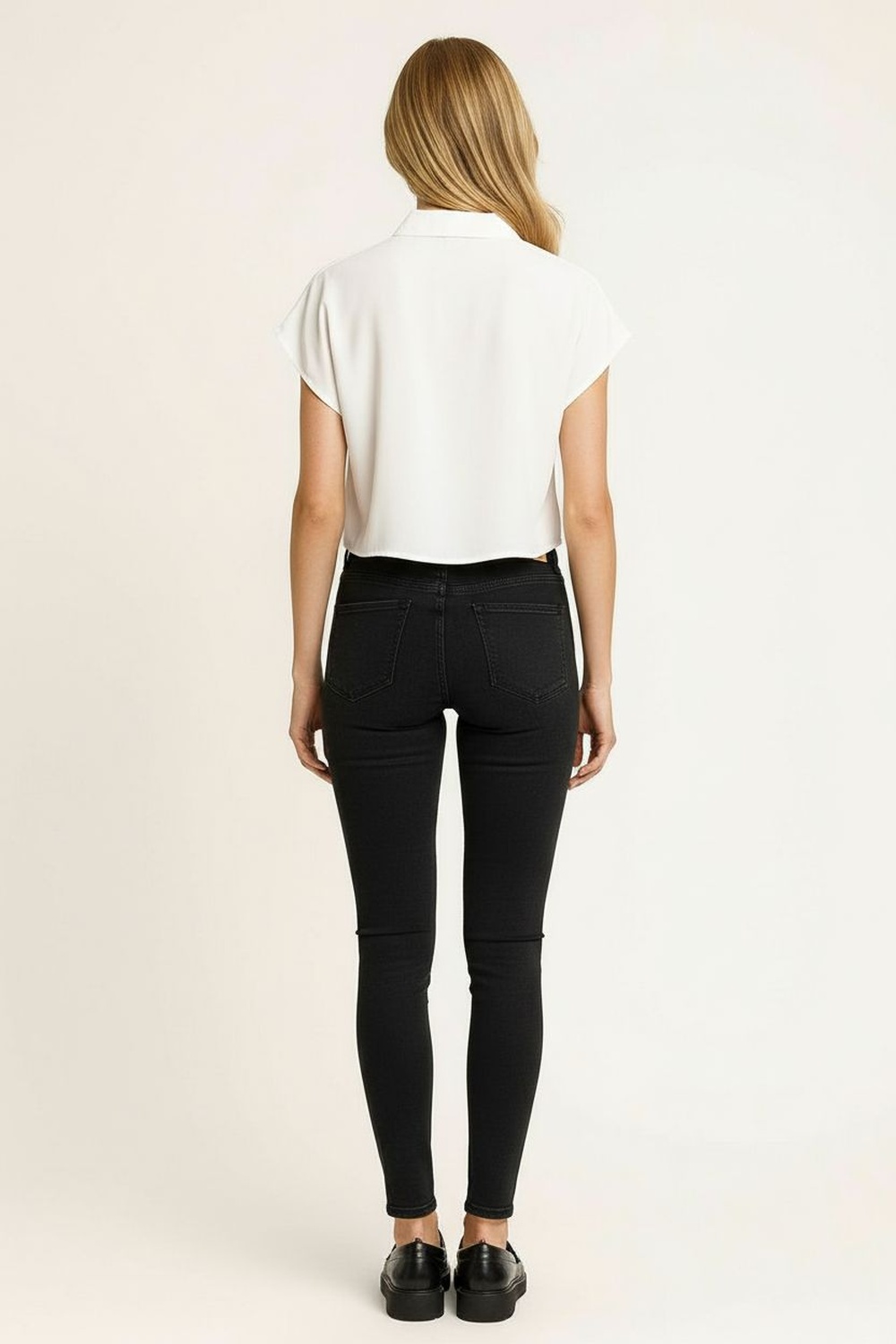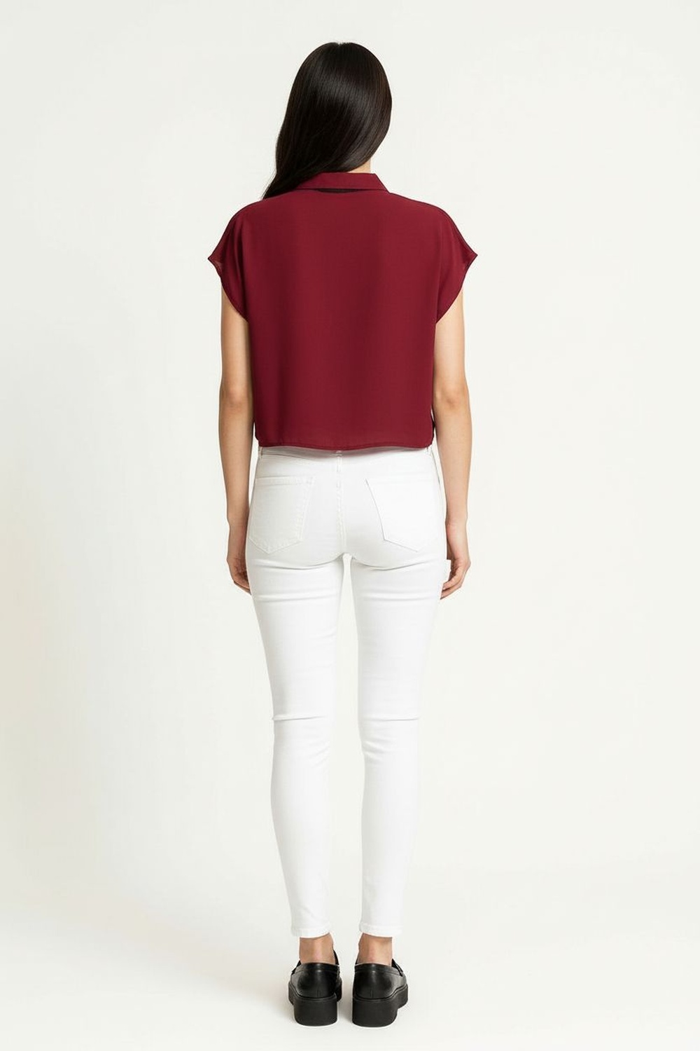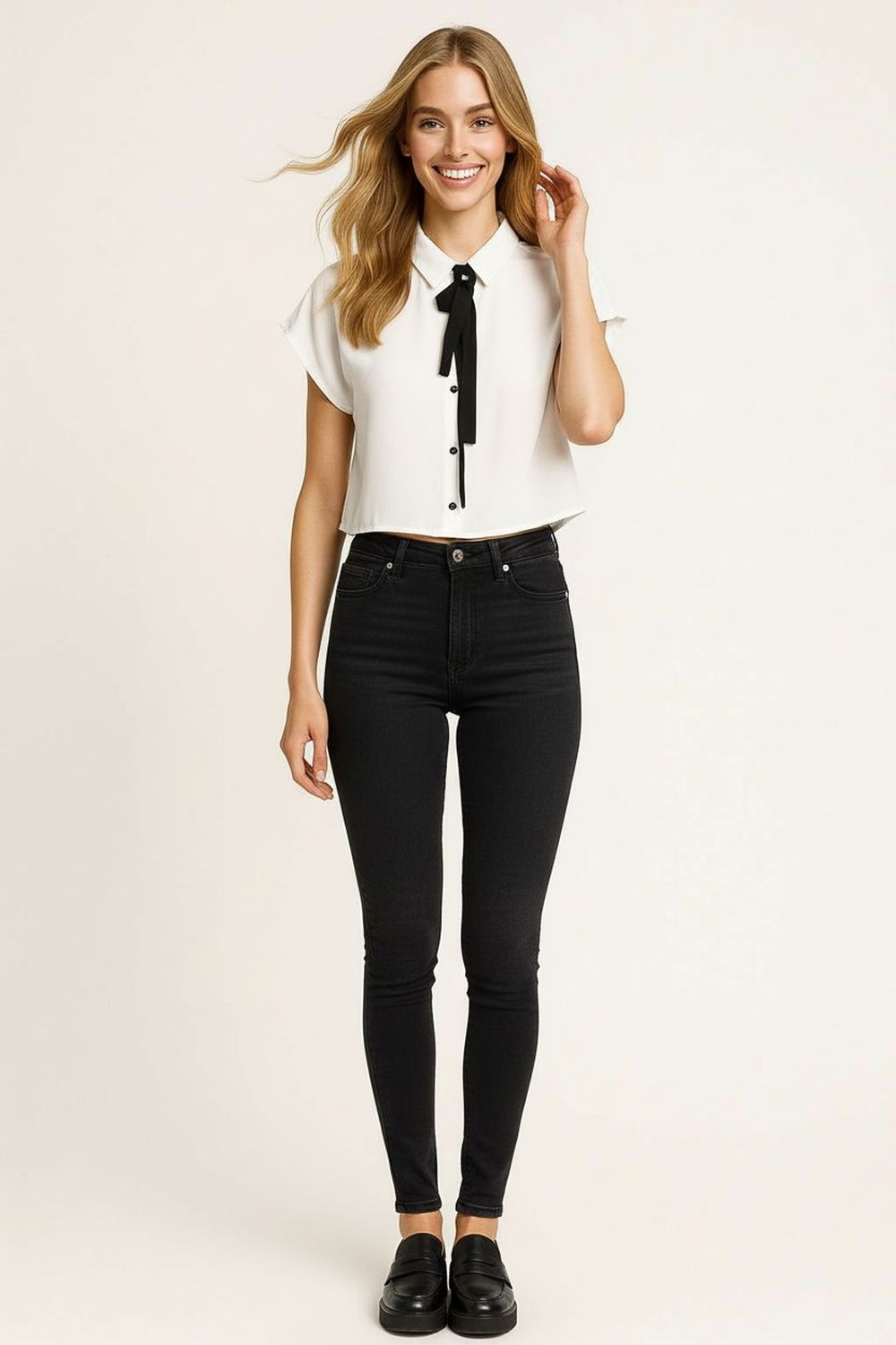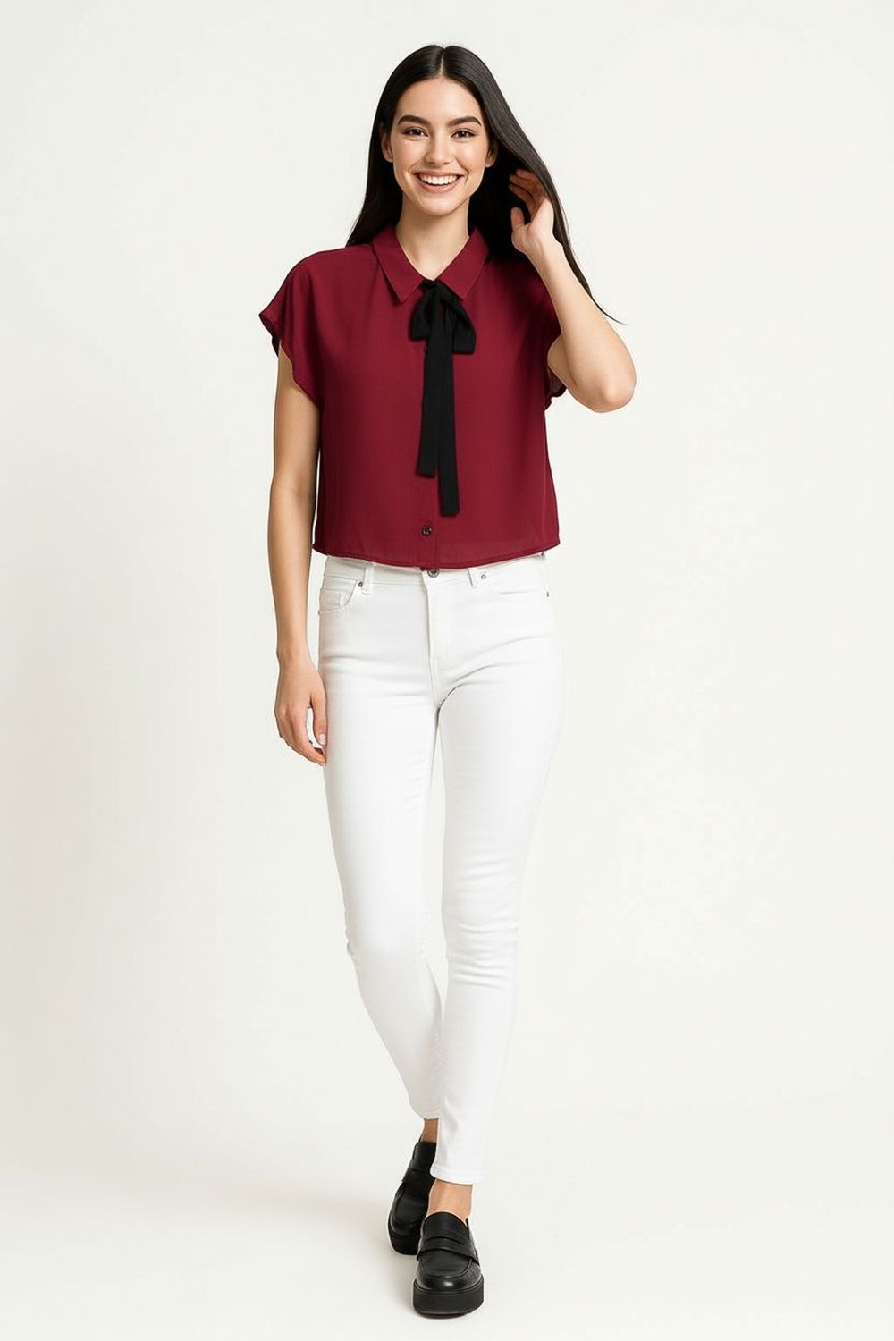Blusa camisera corta con cuello clásico y moño decorativo al frente que aporta un detalle elegante, manga corta fluida con caída ligera, confección en tejido suave que ofrece frescura y comodidad durante el uso, terminación inferior recta que aporta versatilidad