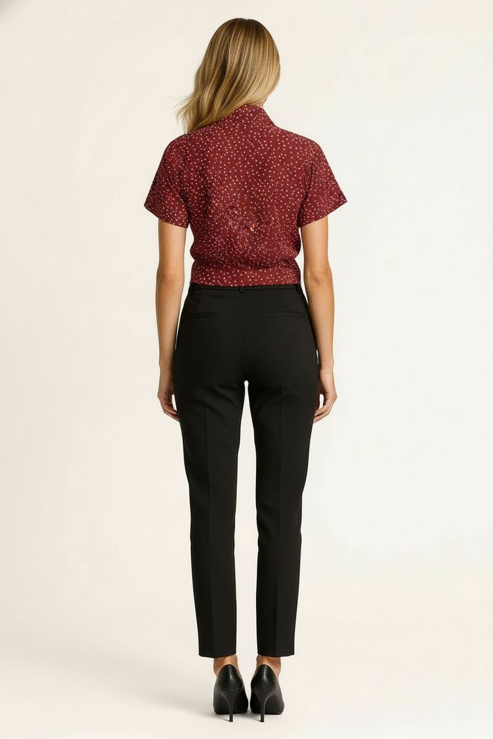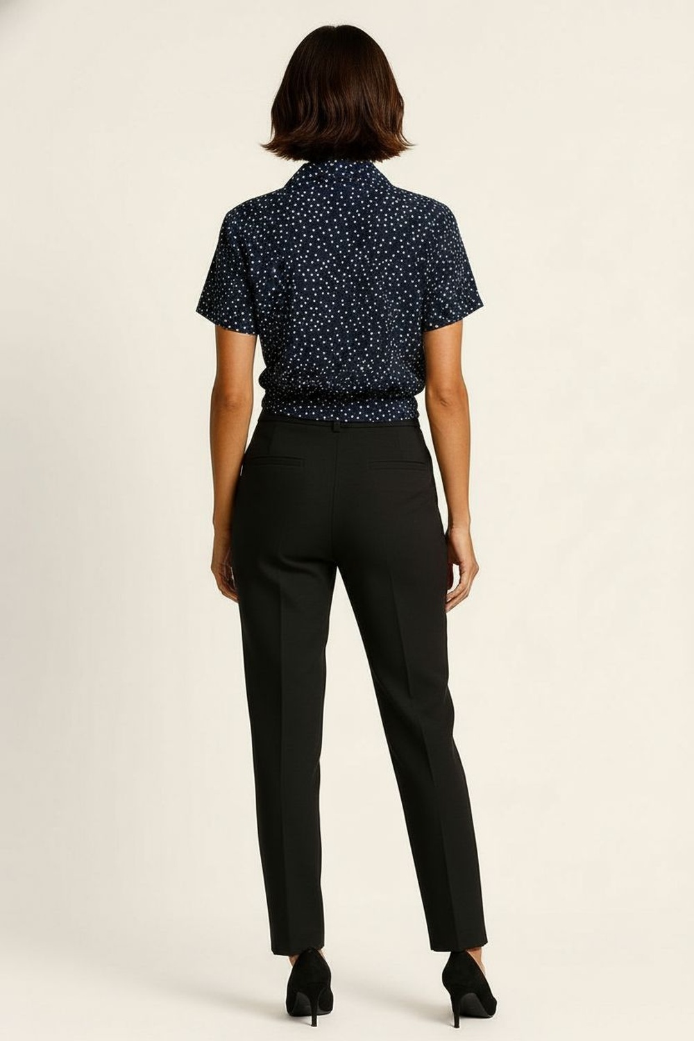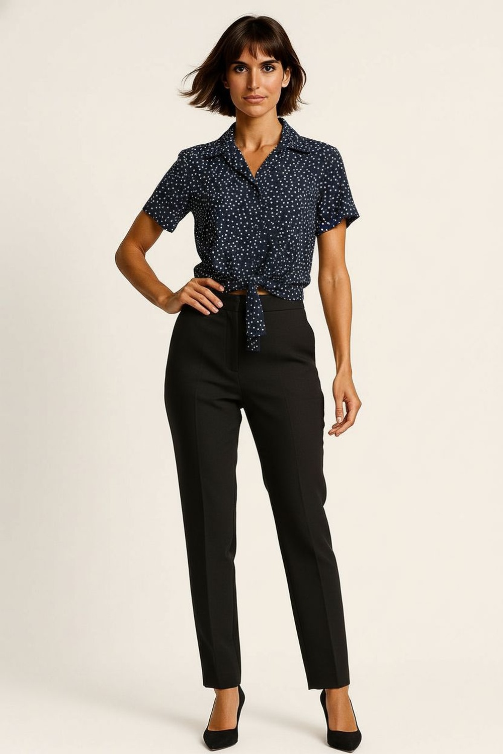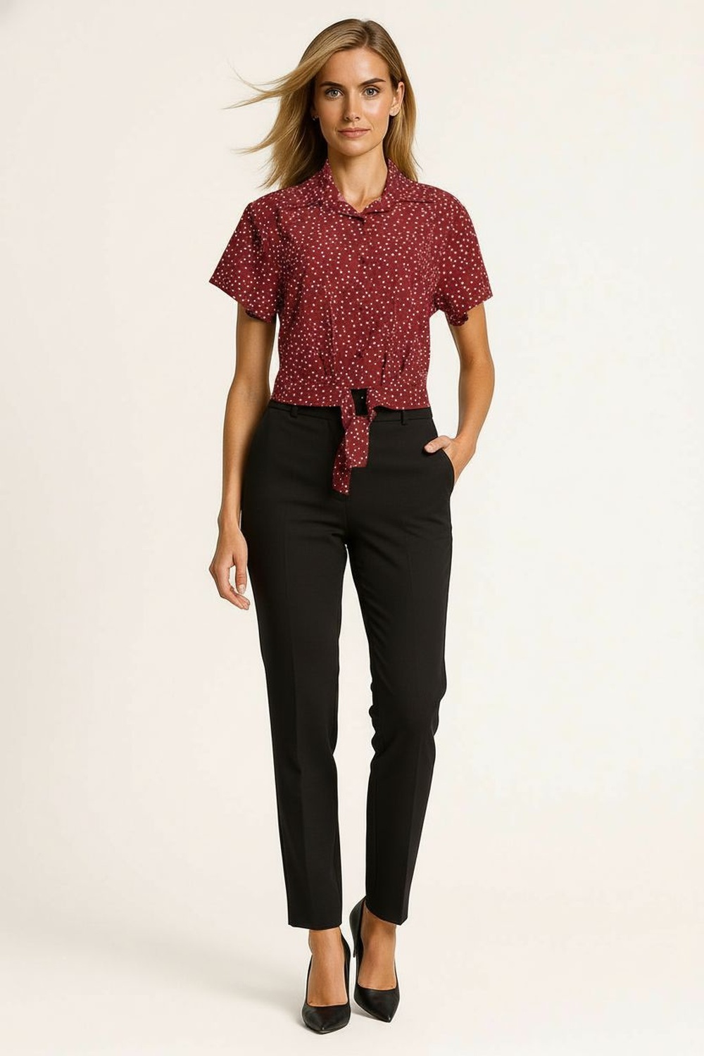 Blusa de manga corta con cuello camisero clásico, cierre de botones al frente que facilita el ajuste, amarre en la parte baja que define la silueta y aporta un toque moderno, confeccionada en tejido ligero que brinda frescura y confort en cada uso