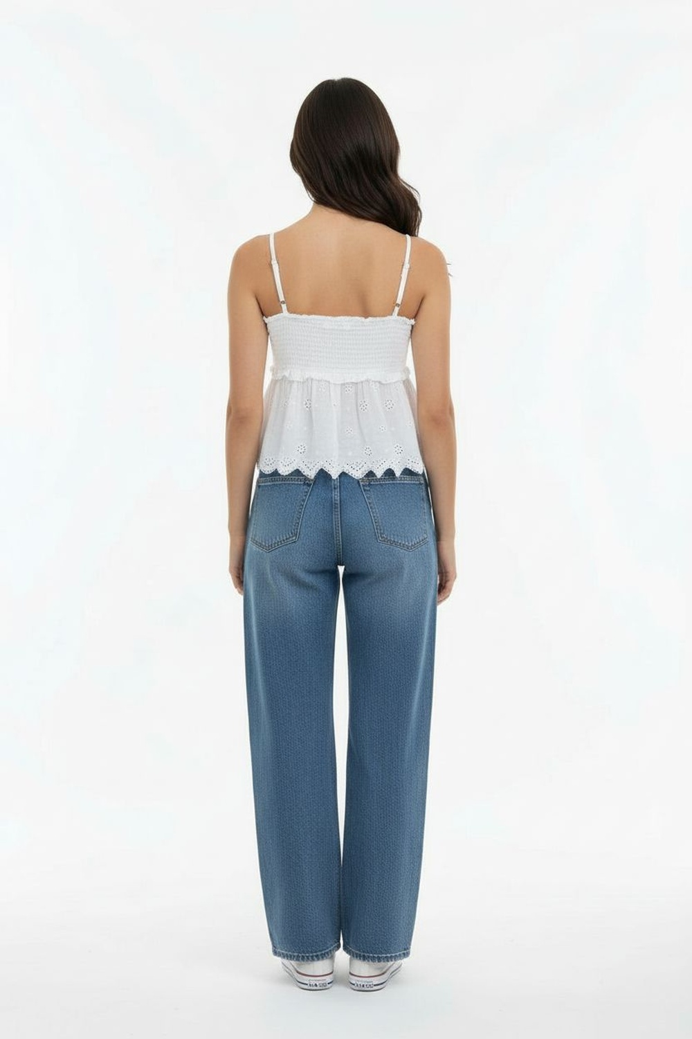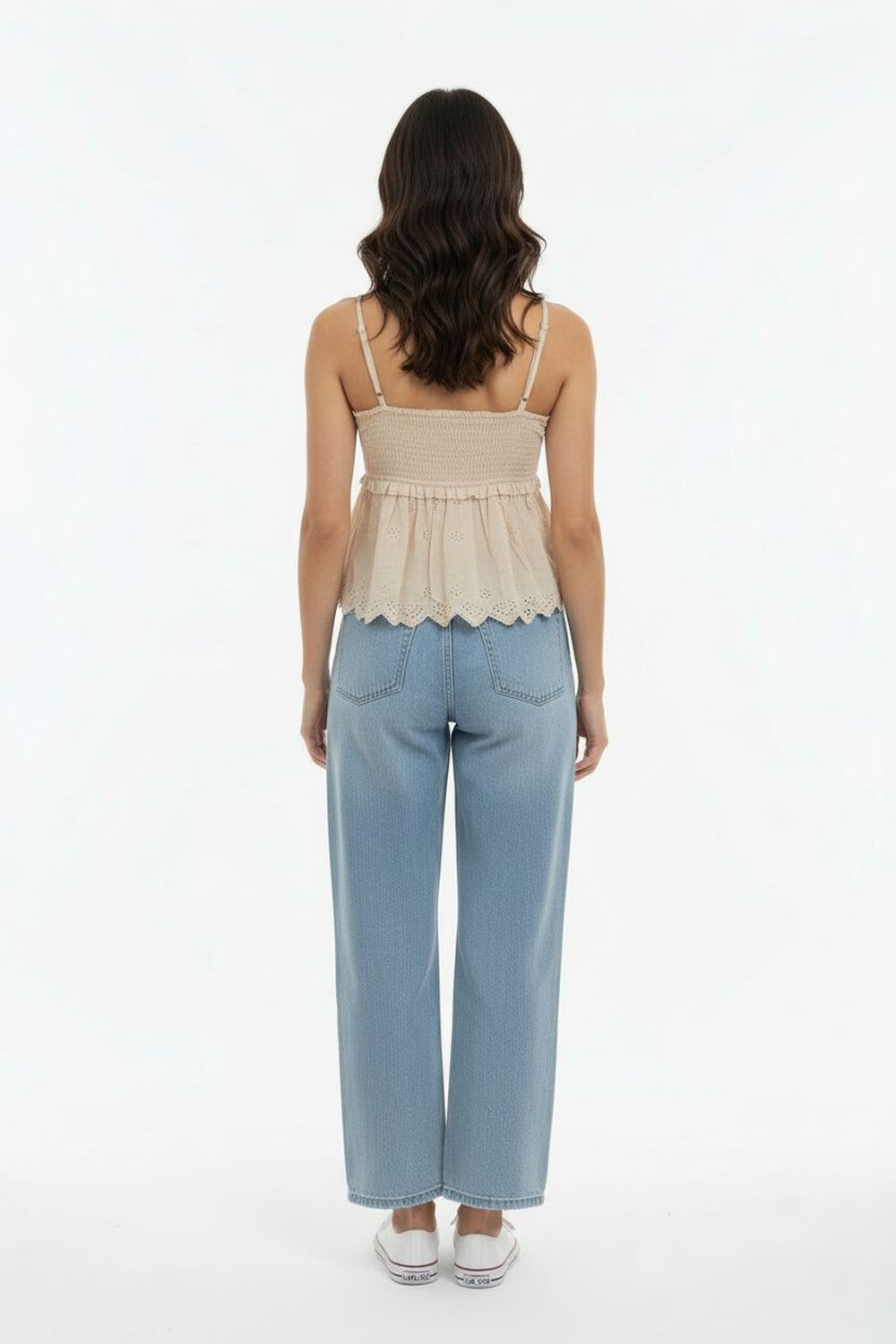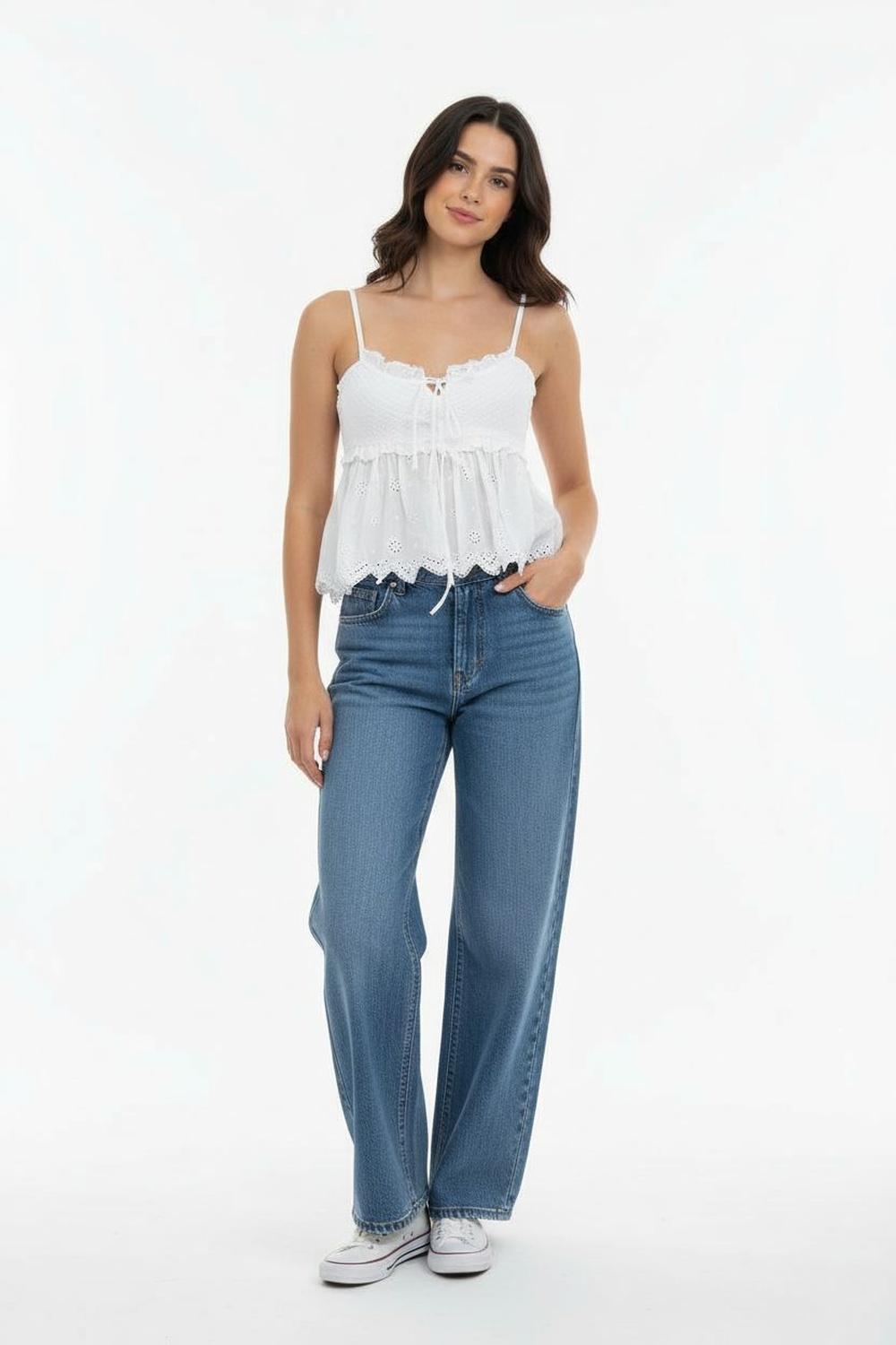 Blusa con tirantes delgados, escote con detalle de ajuste frontal, panel superior con smock, corte debajo del busto con caída ligera, terminación inferior con olanes y textura ligera