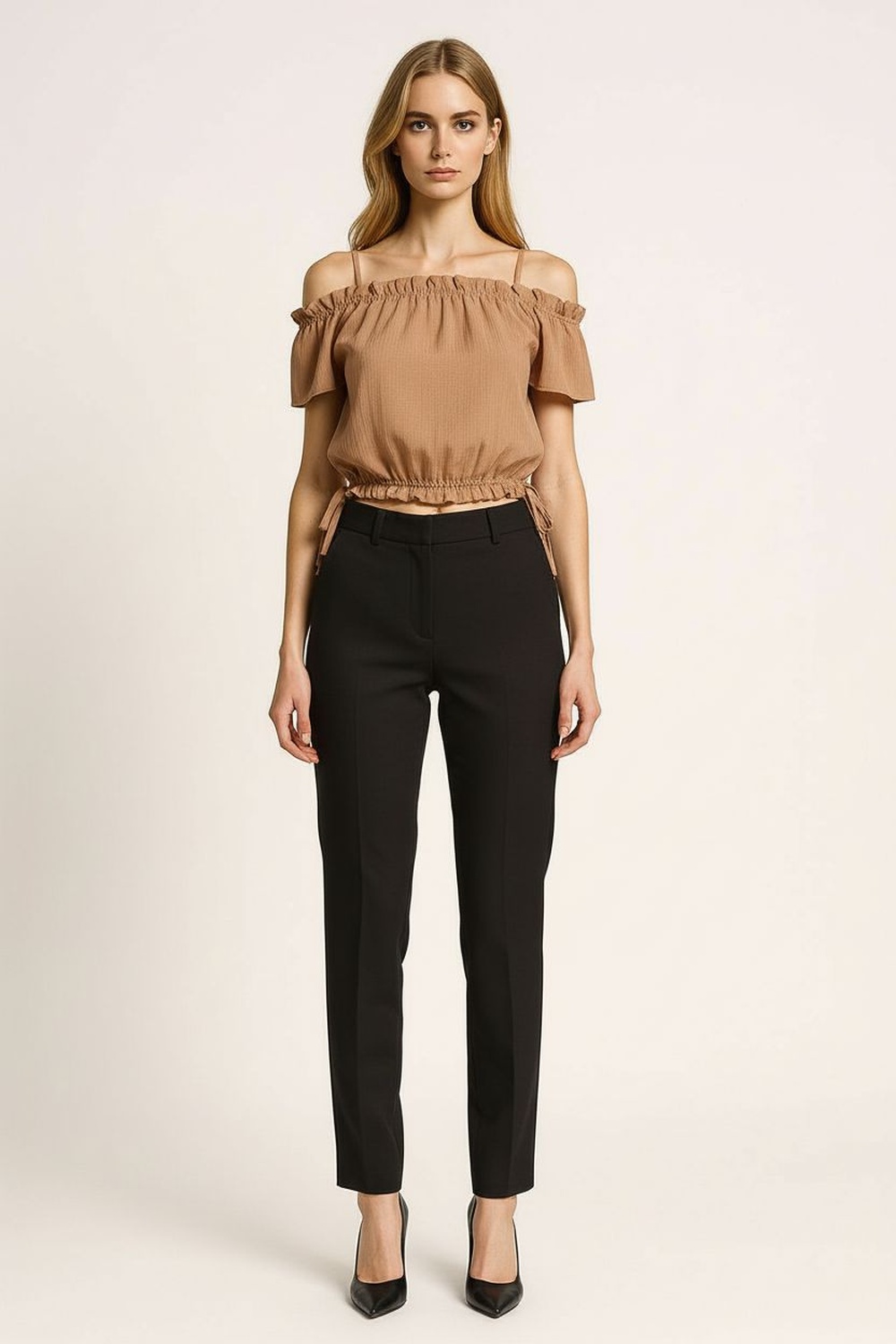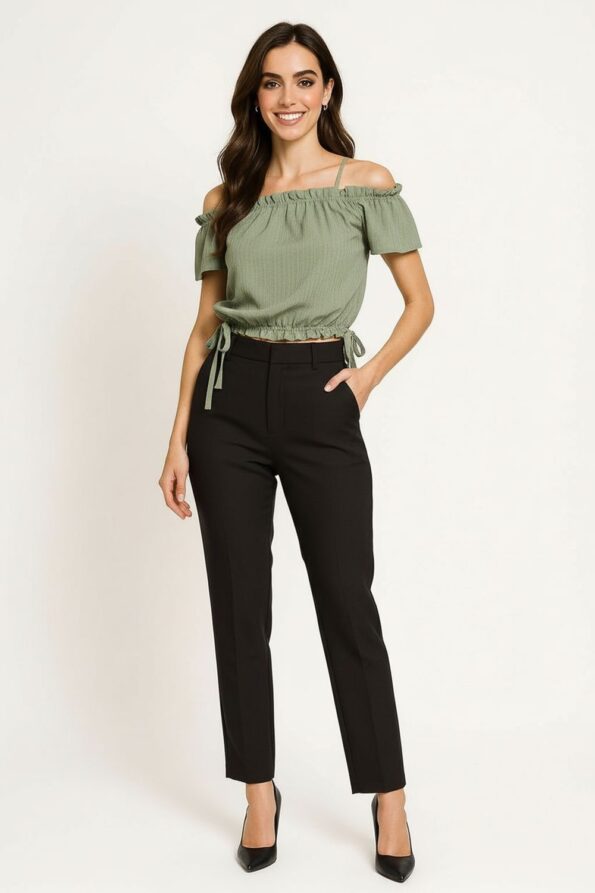 Blusa con tirantes delgados ajustables y diseño de escote tipo campesino, elástico superior que permite un ajuste cómodo y seguro, mangas cortas con caída suave que aportan un toque femenino, jareta lateral con cintas que permiten ajustar el largo y crear un efecto fruncido, confección en tejido ligero con textura suave que ofrece frescura y confort