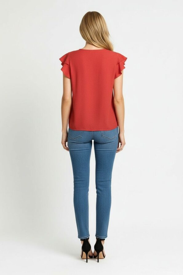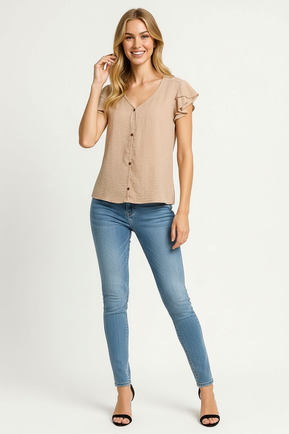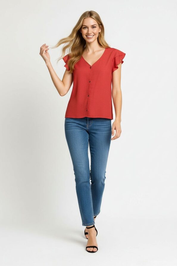 Blusa de manga corta con detalle de volantes en hombros que aportan movimiento y feminidad, escote en V que estiliza el cuello y realza el diseño, botonadura frontal funcional que brinda practicidad y un toque clásico, confección en tela ligera que garantiza frescura y comodidad en cada uso
