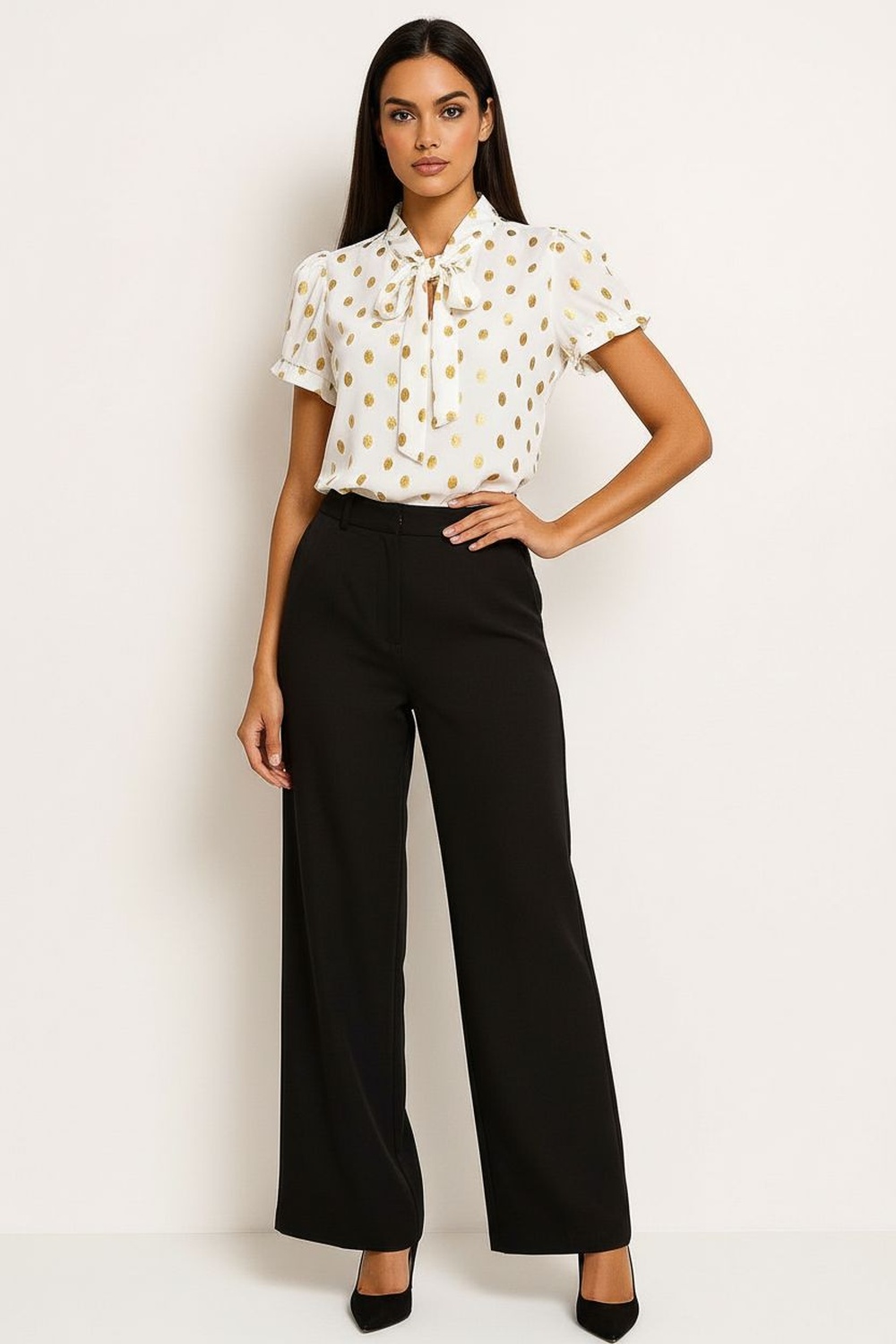 Blusa de manga corta con cuello alto y lazo tipo corbata ajustable, botonadura frontal discreta que facilita postura, corte recto con largo a la cadera que brinda versatilidad, confección en tela ligera de caída suave que aporta comodidad prolongada, detalle delicado en estructura que eleva la prenda