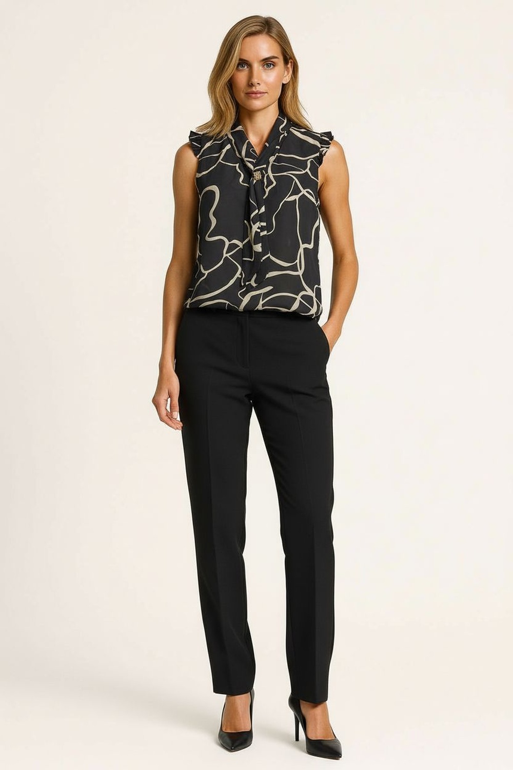 Blusa sin mangas con cuello tipo corbata integrada, escote en v con caída frontal estructurada, confección en tejido ligero de tacto suave, corte recto con ajuste relajado, hombros con detalle de olan discreto