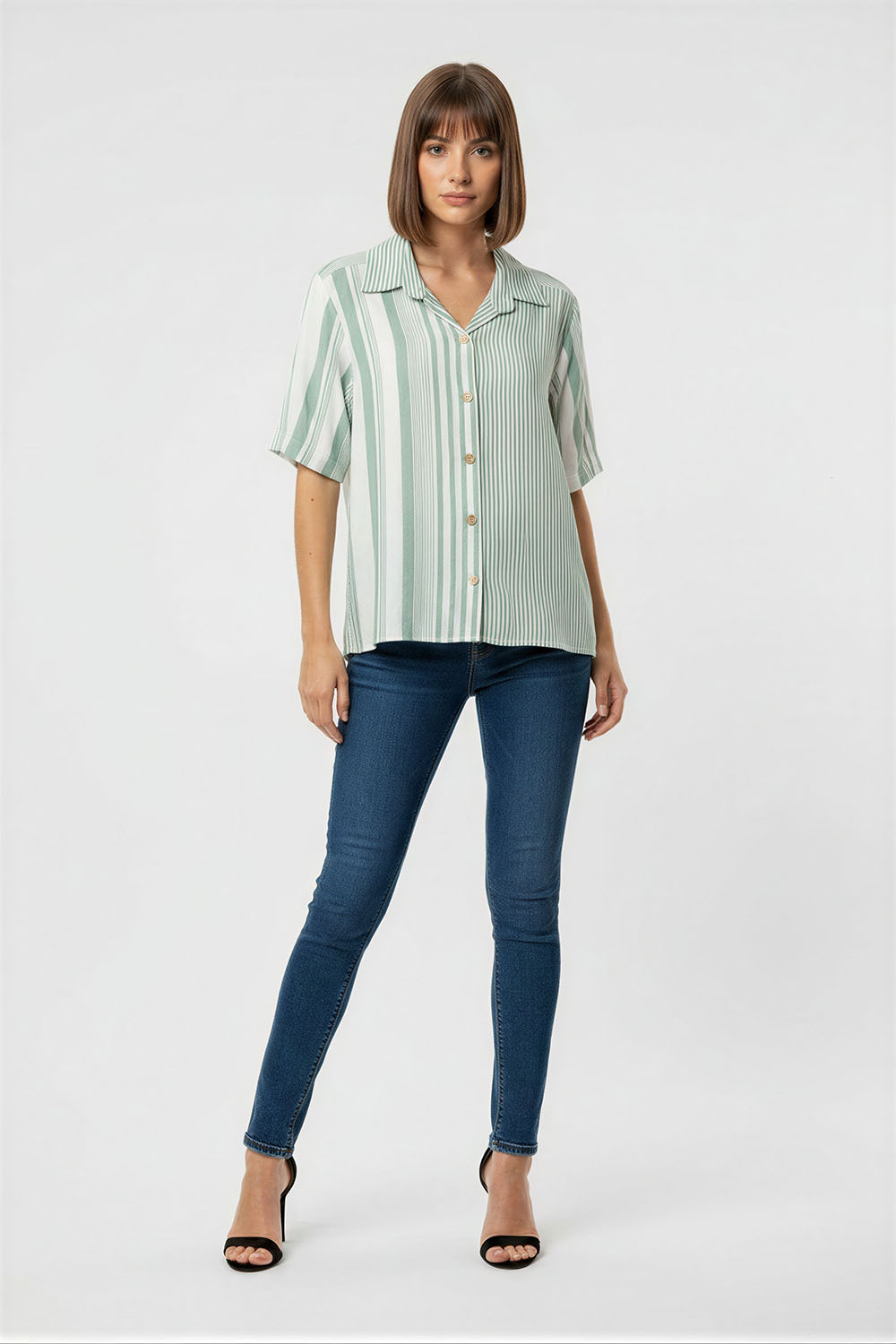 Blusa tipo camisera con cuello tradicional que aporta estructura, cierre frontal con botones que facilita su uso, manga corta que brinda frescura, corte recto que permite un ajuste cómodo, confección en tejido ligero con textura suave que favorece la transpiración y el uso diario