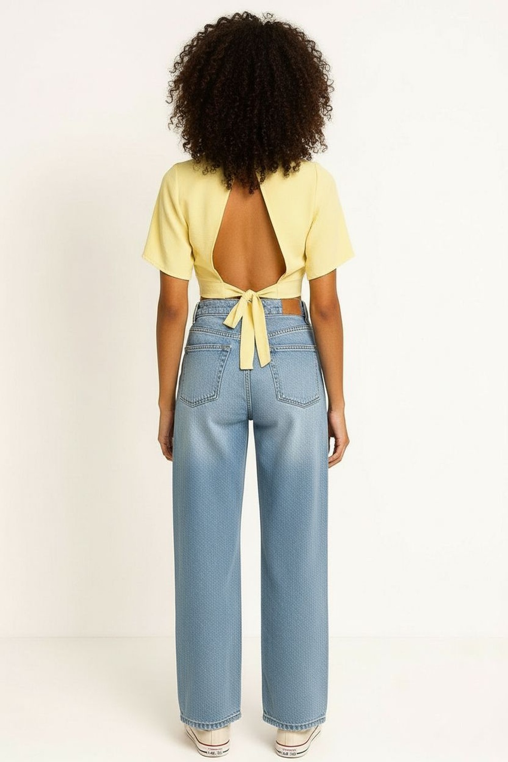 Blusa corta con escote en V, diseño cruzado al frente, manga corta, ajuste mediante amarre posterior, espalda con abertura, estructura ligera, confección cómoda