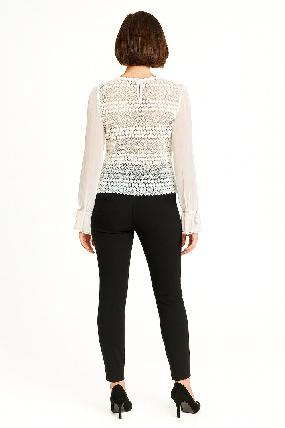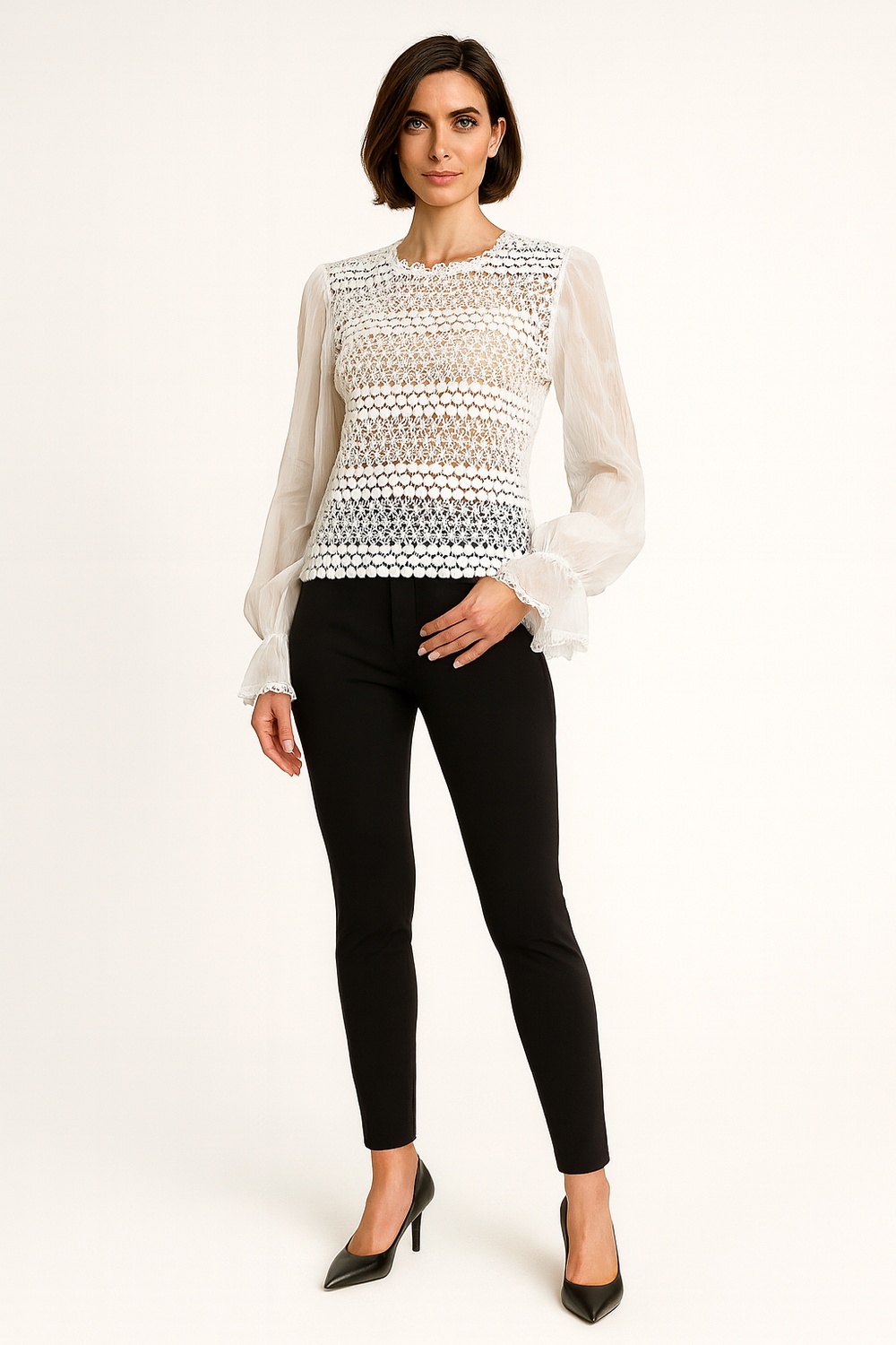 Blusa con cuerpo de tejido crochet de patrón circular, cuello redondo, mangas largas de gasa translúcida con volumen, puños ajustados con volante y cierre de botón en la espalda