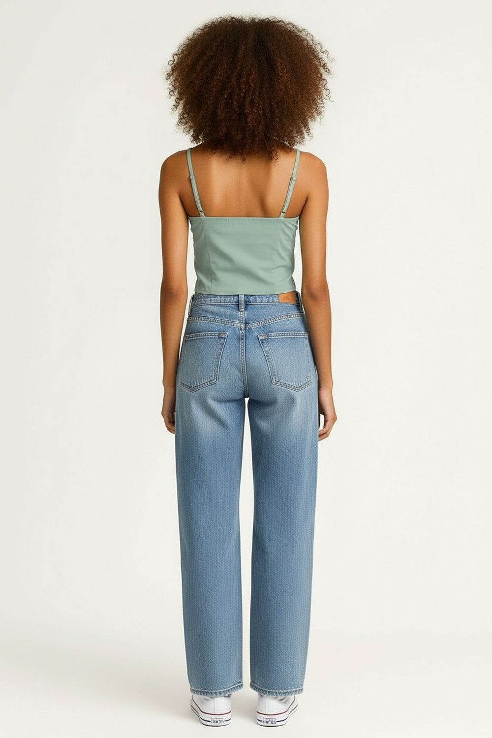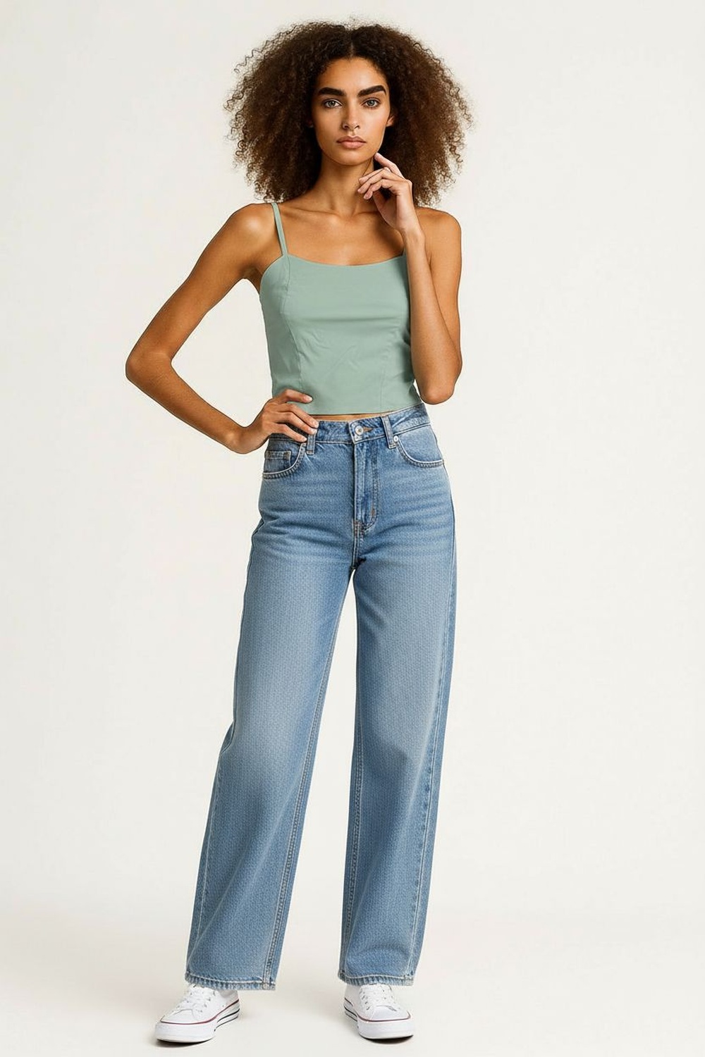 Blusa crop con tirantes delgados, escote recto, ajuste al cuerpo, cierre lateral, corte corto a la cintura, acabado limpio en bordes