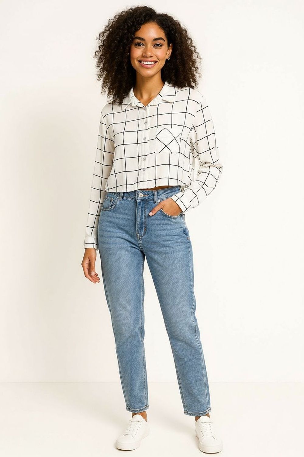 Blusa camisera corta con solapa clásica y botonadura frontal, bolsillo aplicado que agrega detalle funcional, manga larga con puño estructurado, confección en tejido suave con caída ligera que mantiene buena estructura, dobladillo recto que aporta acabado limpio
