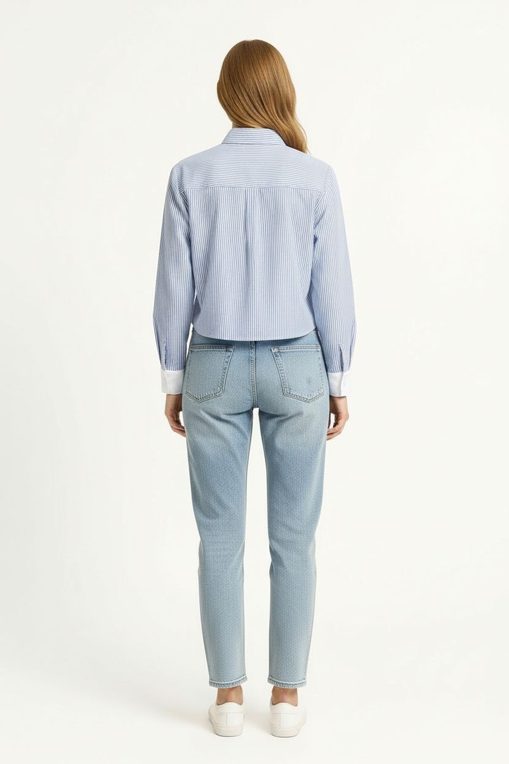 Blusa de manga larga confeccionada en tejido de rayas finas con cuello camisero y puños de contraste, botonadura frontal y estructura ligera que mantiene una caída natural, corte recto que equilibra comodidad y elegancia en un diseño atemporal