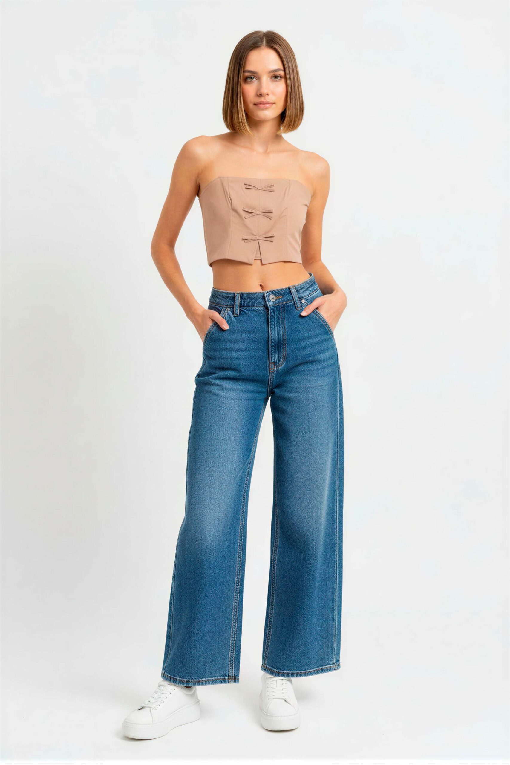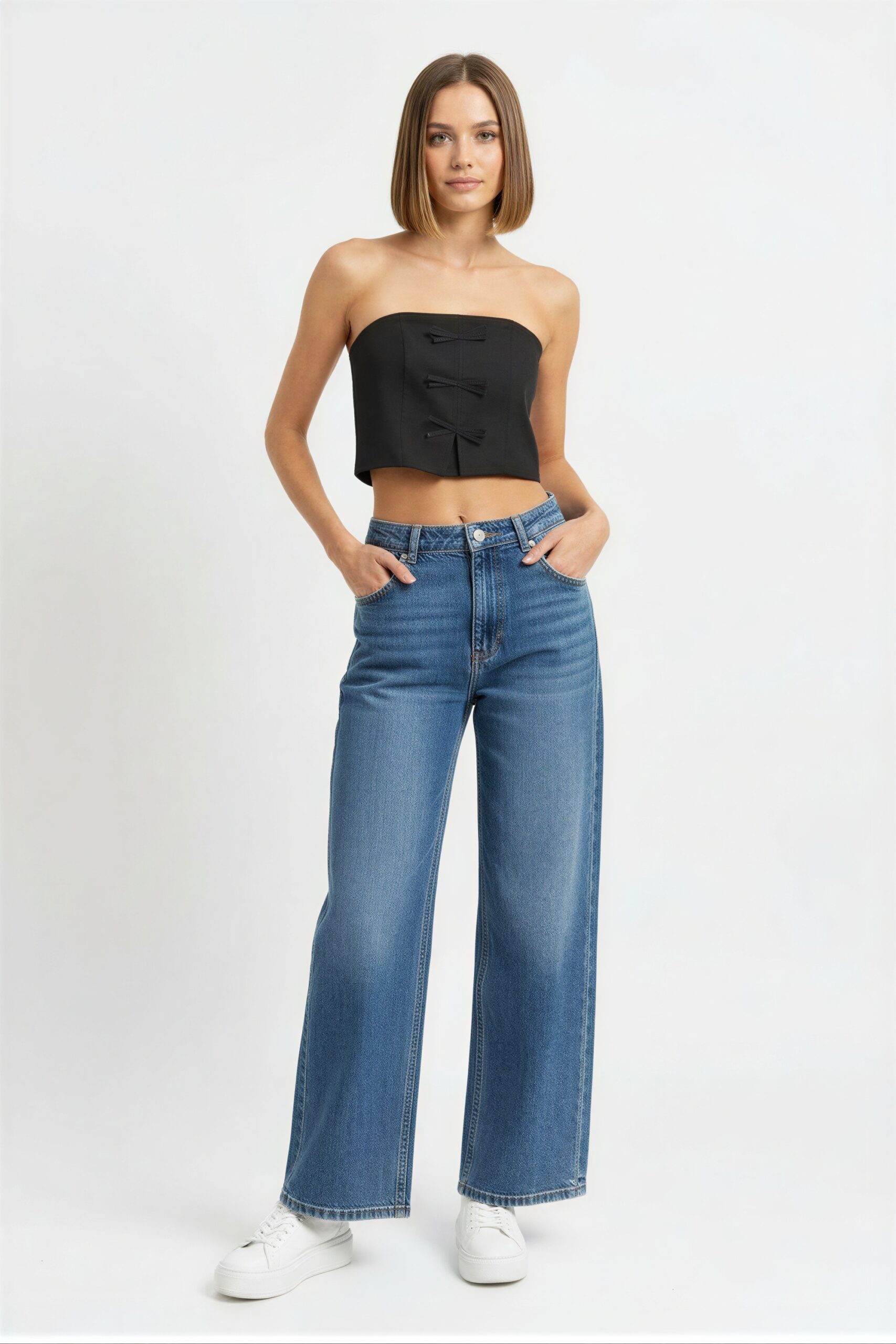 Blusa crop de tirantes con estructura firme, diseño con moños frontales decorativos, ajuste al cuerpo que resalta la silueta, acabado limpio en bordes