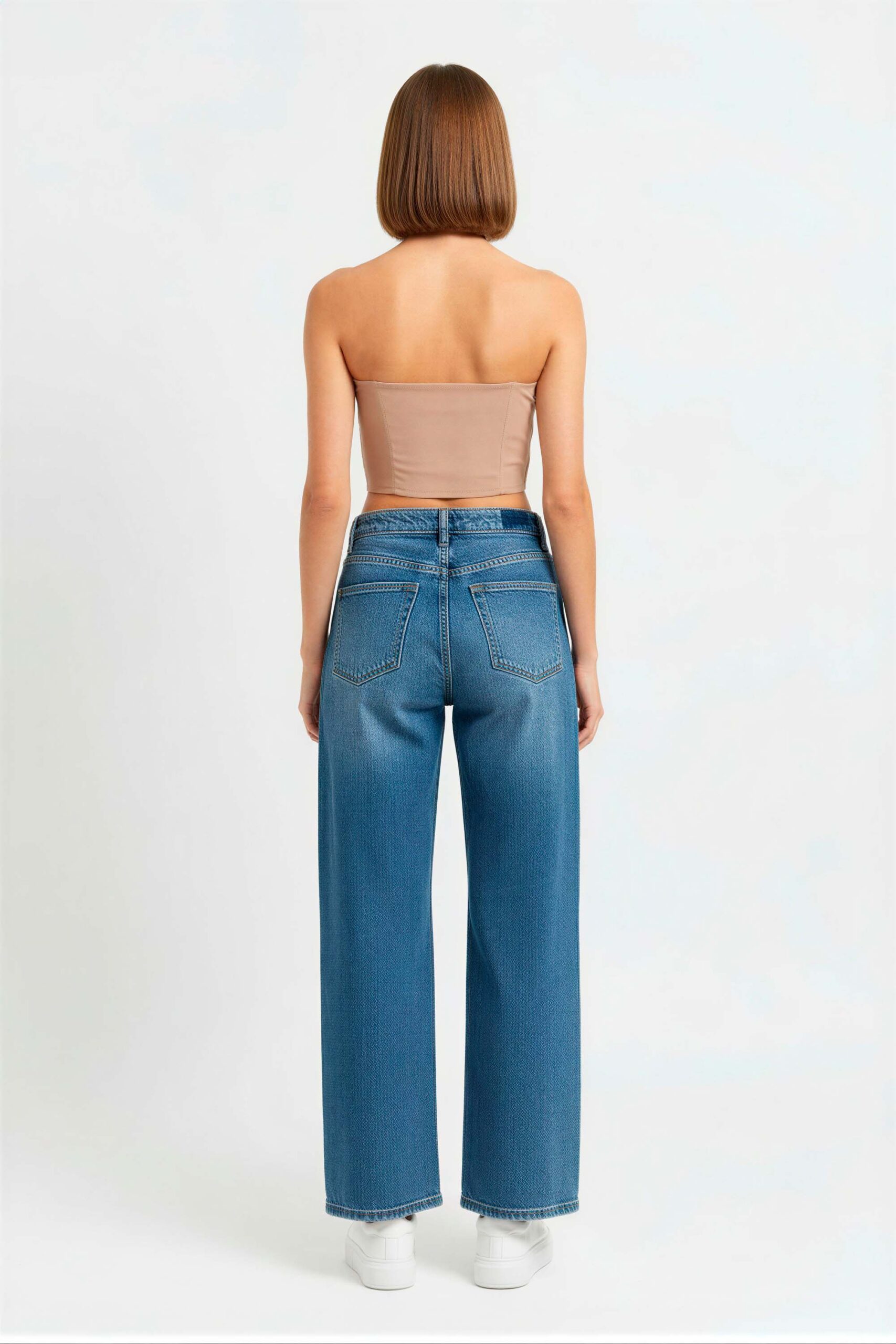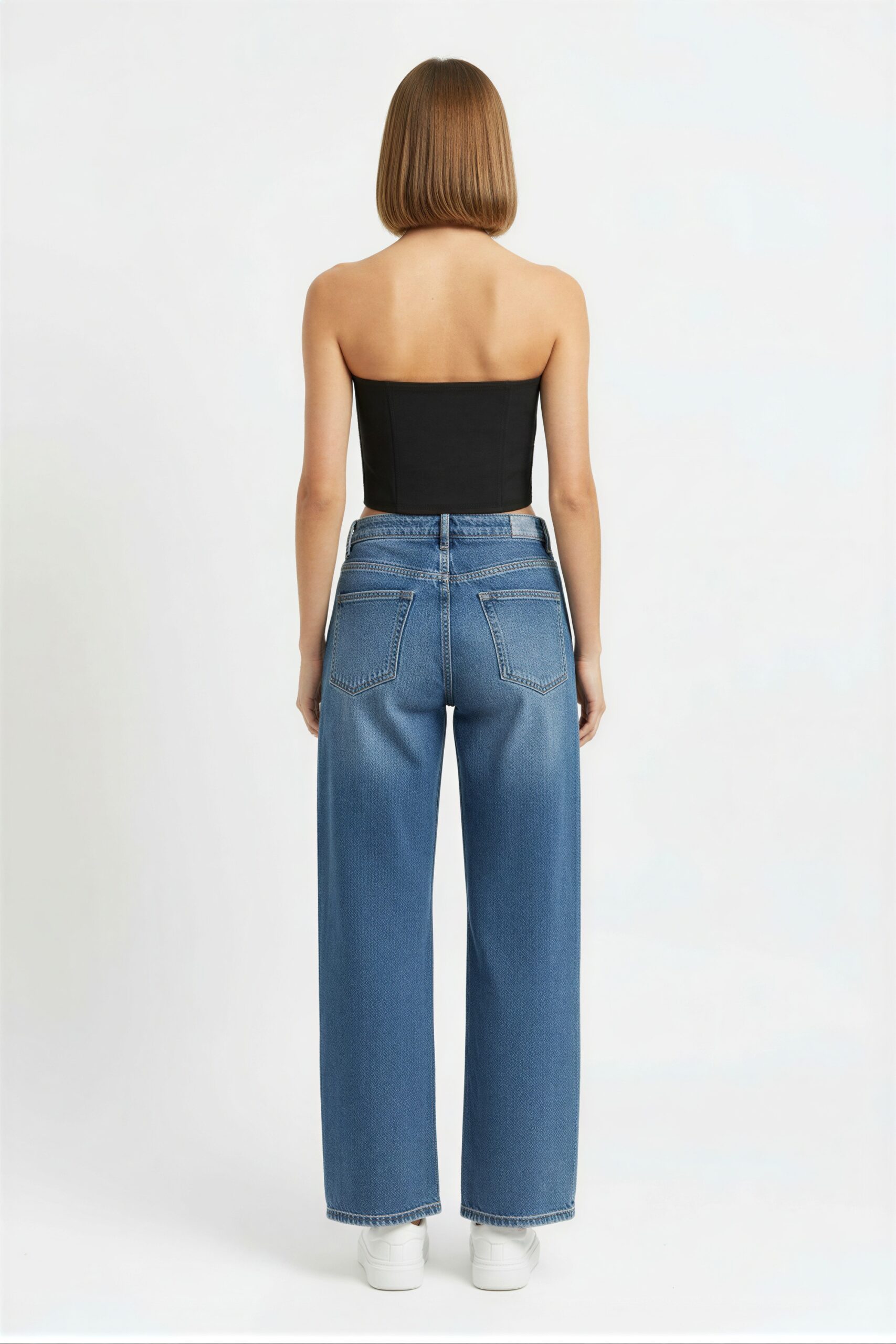 Blusa strapless, escote estructurado, botonadura frontal decorativa, corte ajustado con pinzas, terminación recta