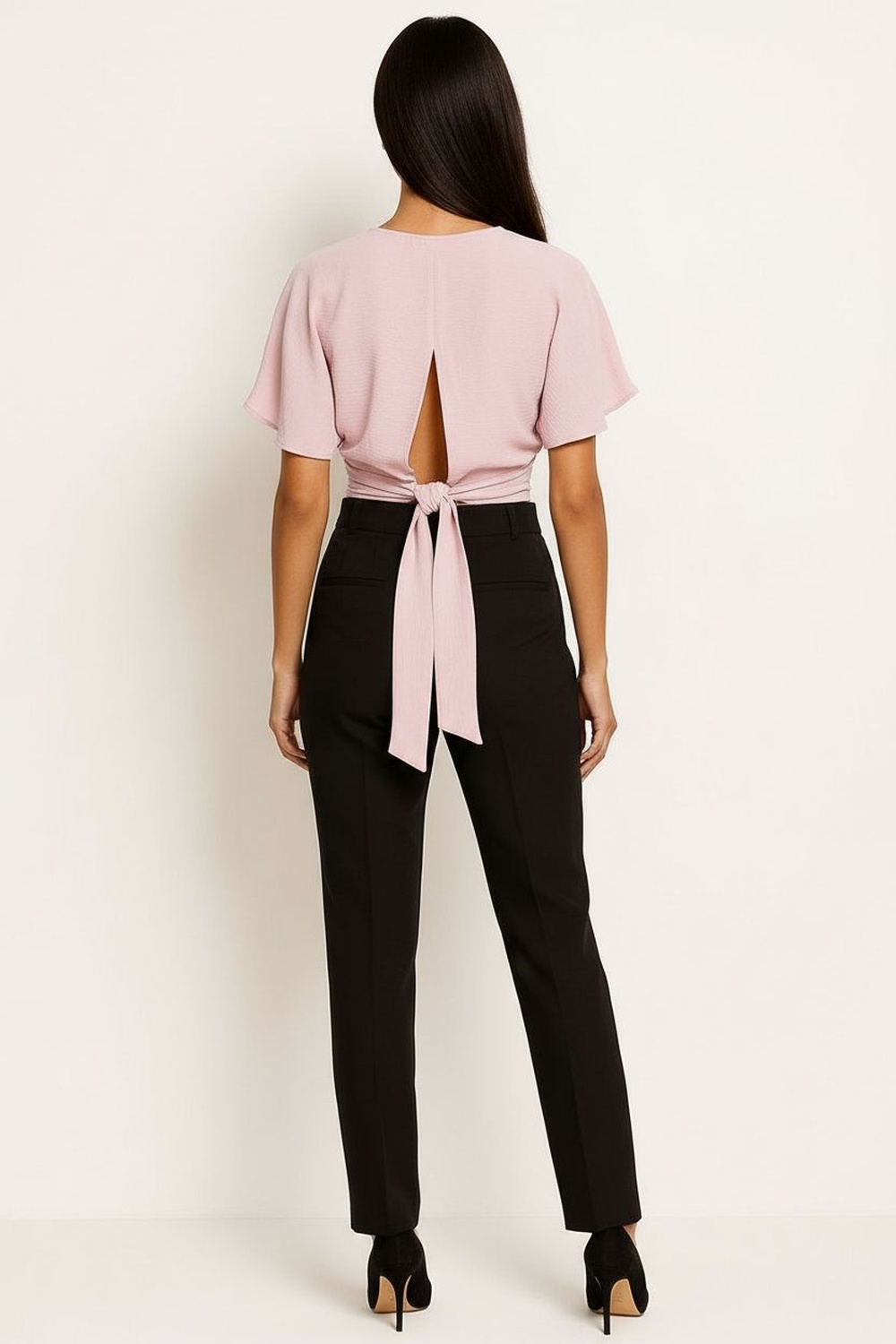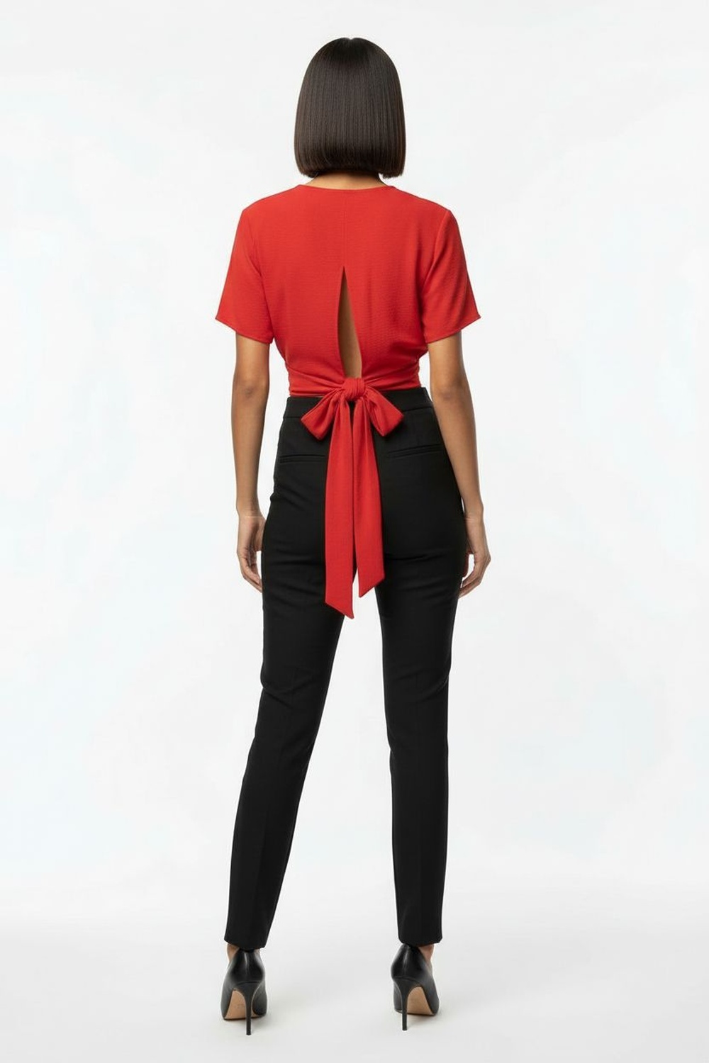 Blusa de manga corta con recogido suave en hombros, cuello redondeado con lazo frontal integrado que añade detalle distintivo, silueta relajada que brinda movilidad, confección ligera que permite frescura todo el día
