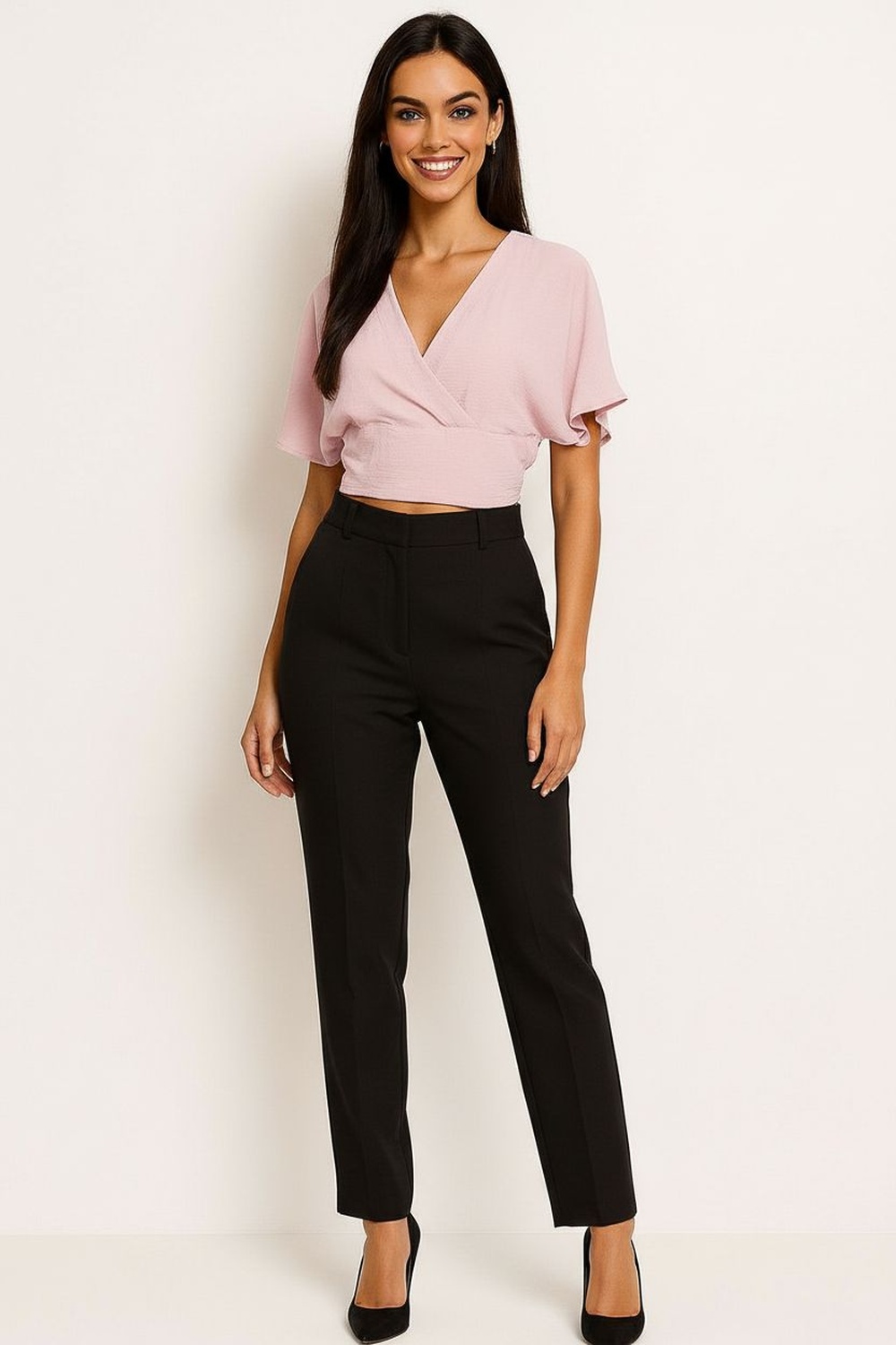 Blusa cruzada, escote en v con cruce al frente y ajuste en cintura, manga corta y diseño envolvente que brinda mejor ajuste al cuerpo