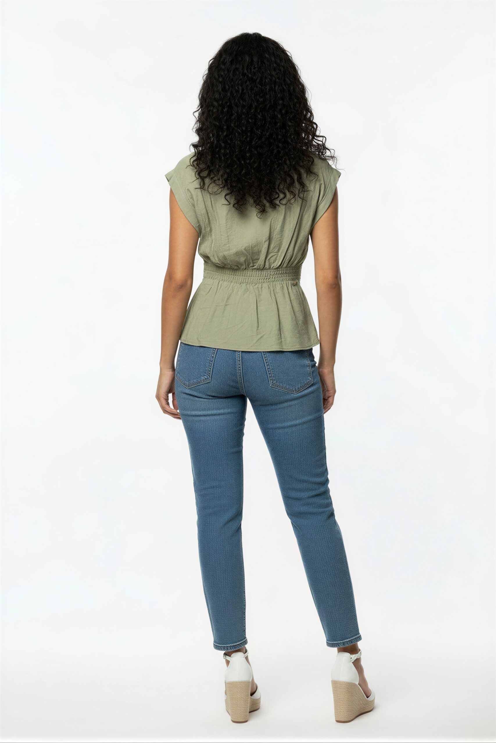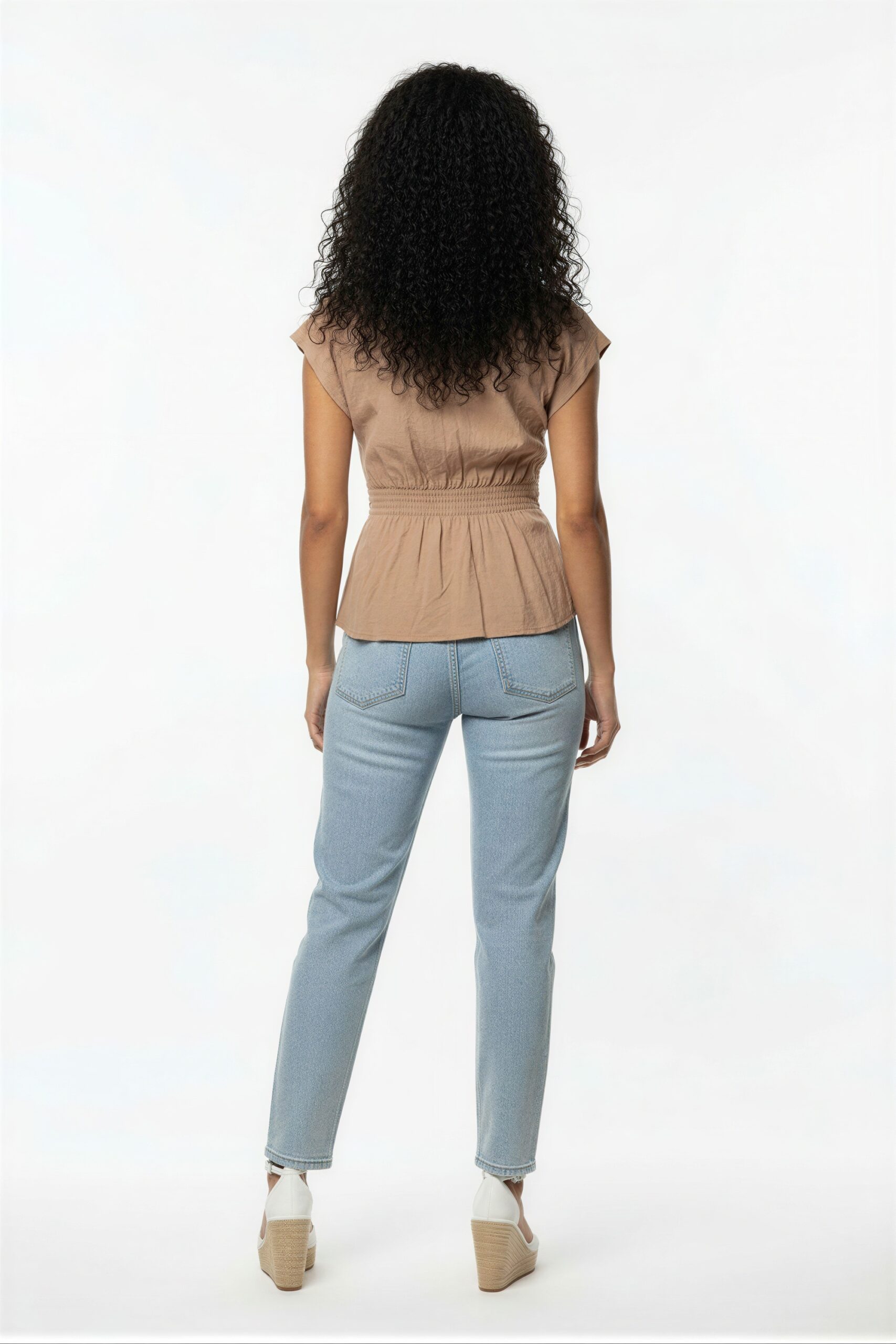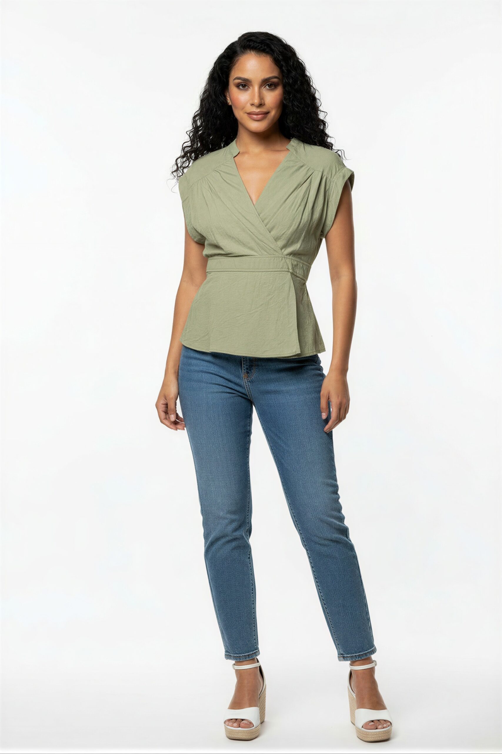 Blusa cruzada con escote en V, ajuste en cintura, corte con vuelo, estructura ligera, caída fluida, acabado suave