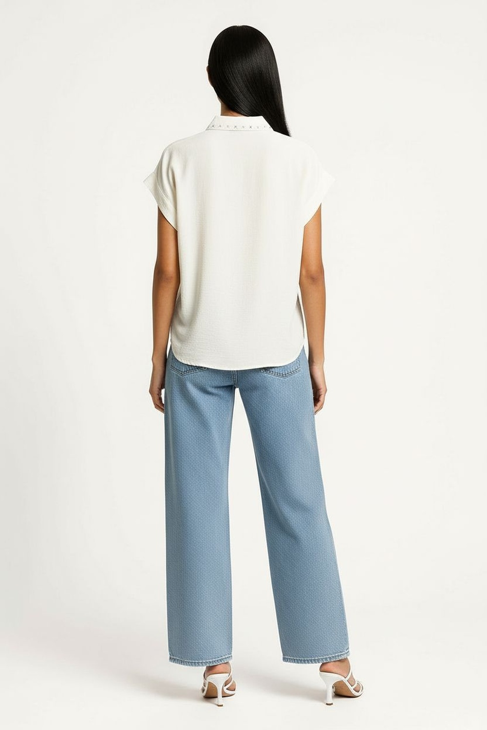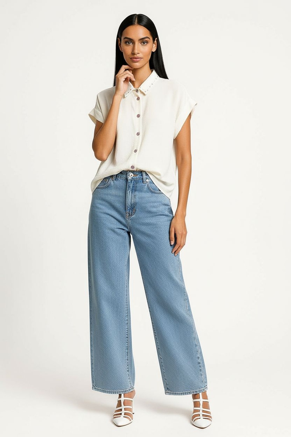Blusa de manga corta con cuello camisero estructurado y detalle bordado en solapa, cierre frontal con botonadura completa, corte recto que brinda caída ligera y cómoda, terminaciones limpias en mangas y bajo, confección en tela suave con textura ligera que aporta frescura y presentación pulida