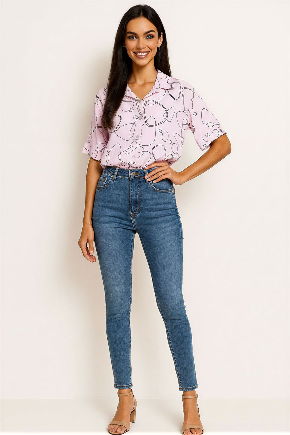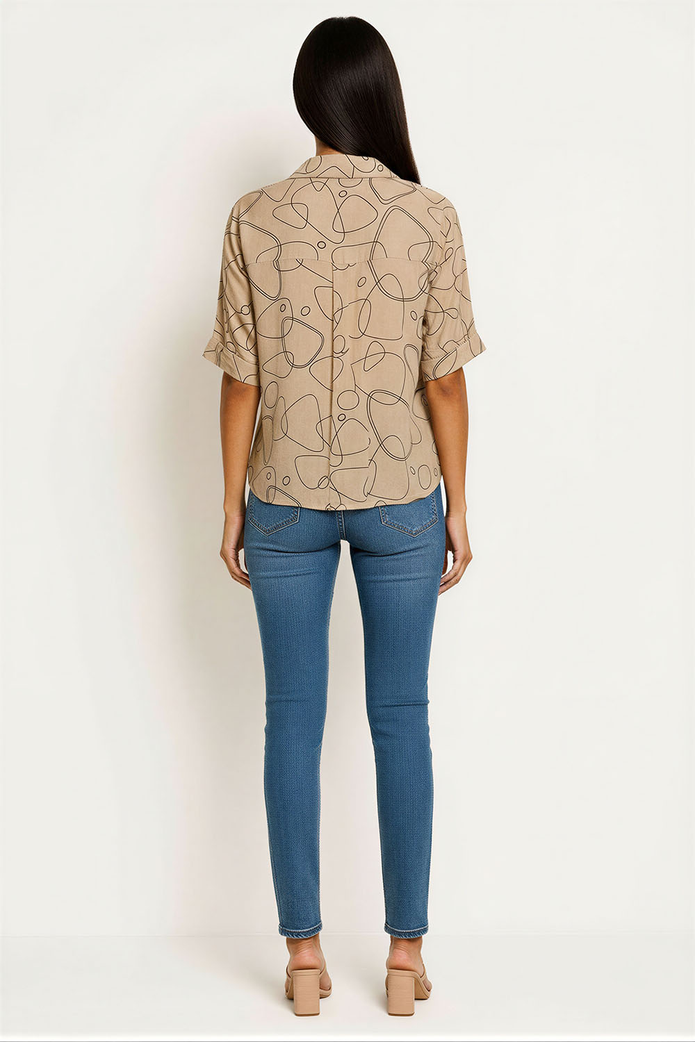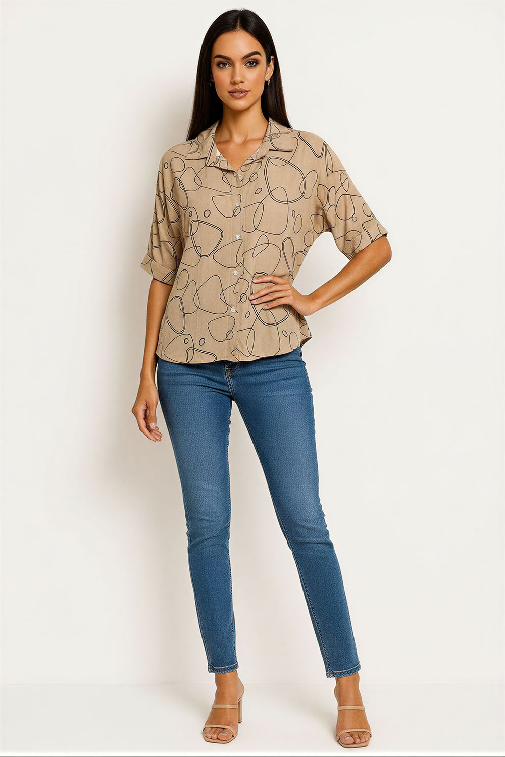 Blusa de corte recto con cuello camisero que aporta estructura, botonadura frontal que facilita el ajuste, manga corta amplia que brinda comodidad y frescura, confección en tela ligera de tacto suave que permite transpirabilidad, acabado con caída natural que favorece el movimiento