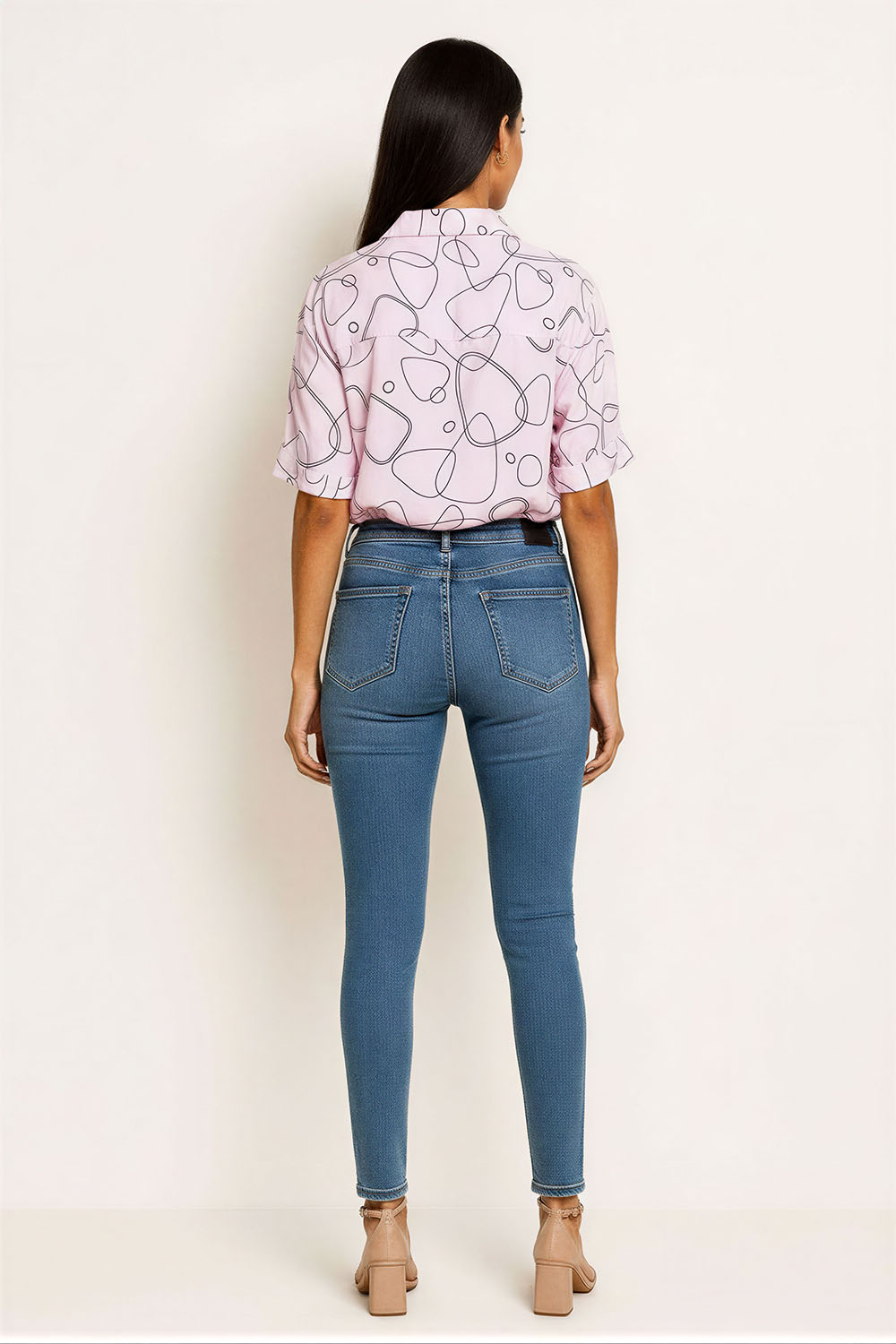 Jeans de tiro alto con pretina estructurada que brinda ajuste seguro, corte recto que estiliza la pierna, cierre frontal con botón y cremallera para mejor sujeción, confección en mezclilla resistente que aporta durabilidad, diseño de pierna amplia que permite libertad de movimiento