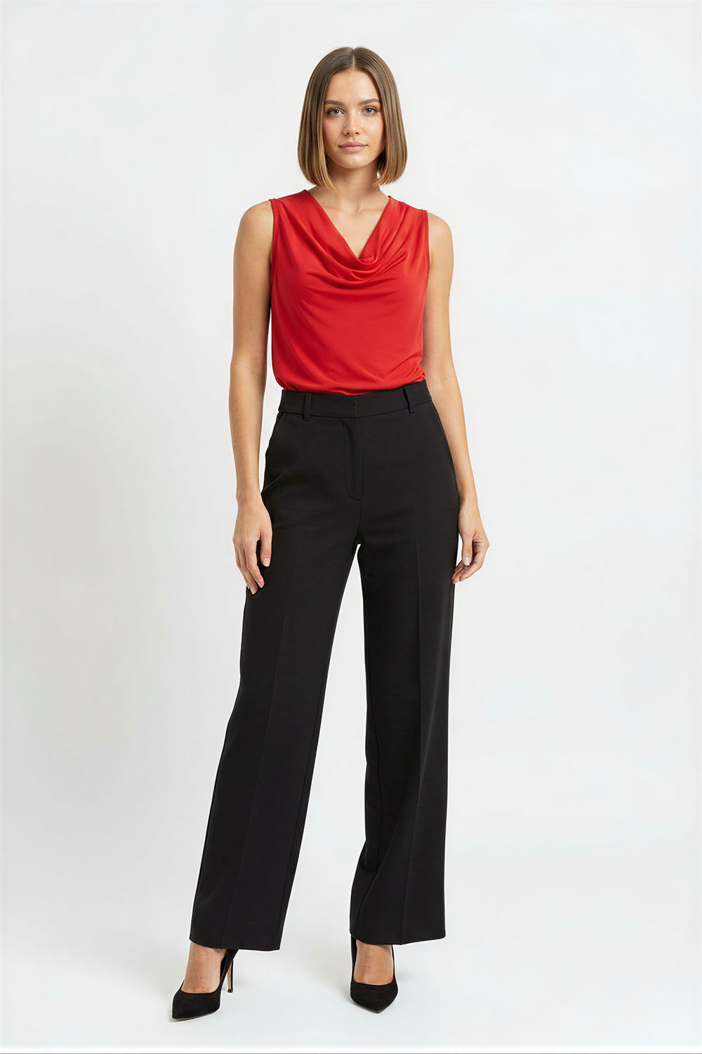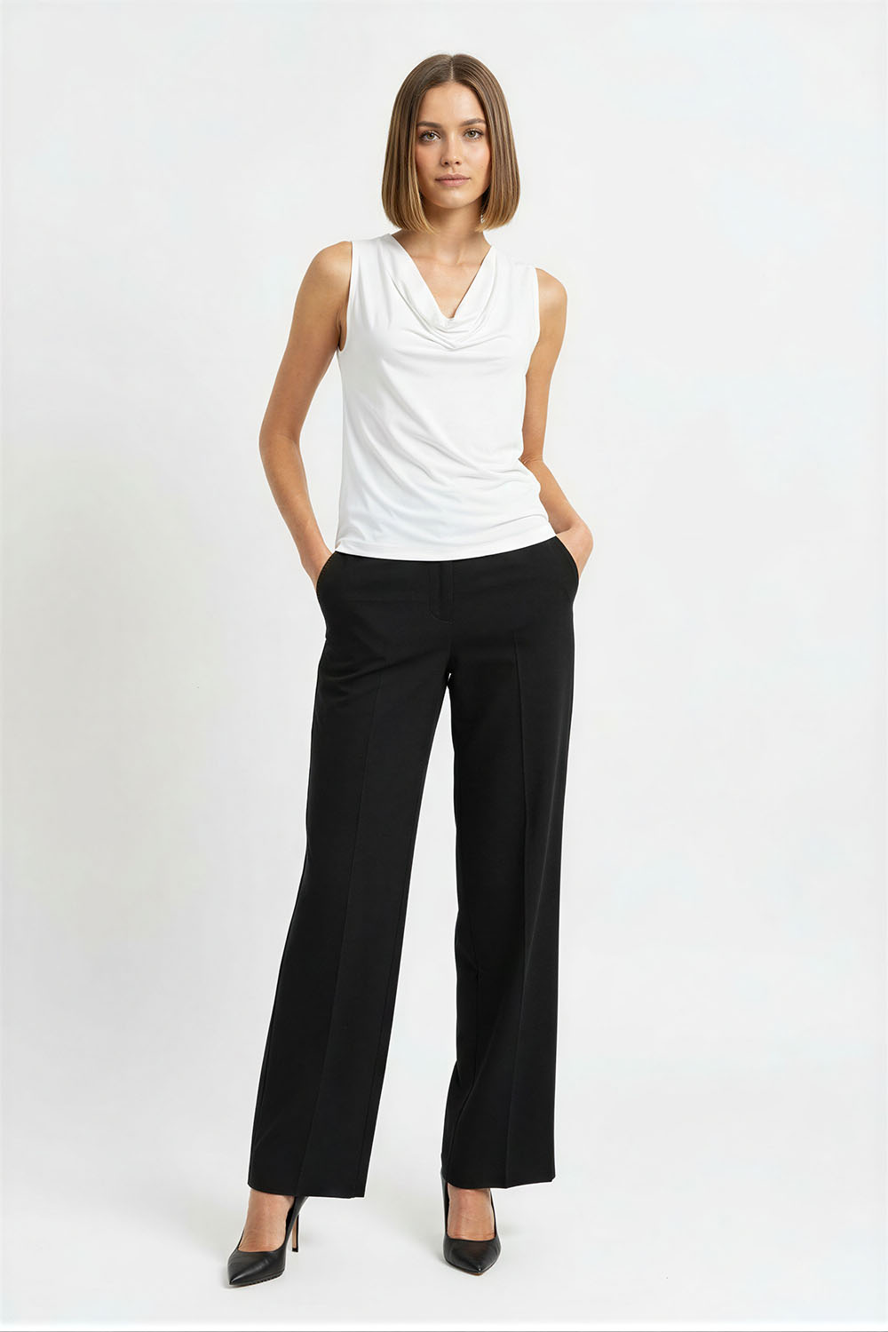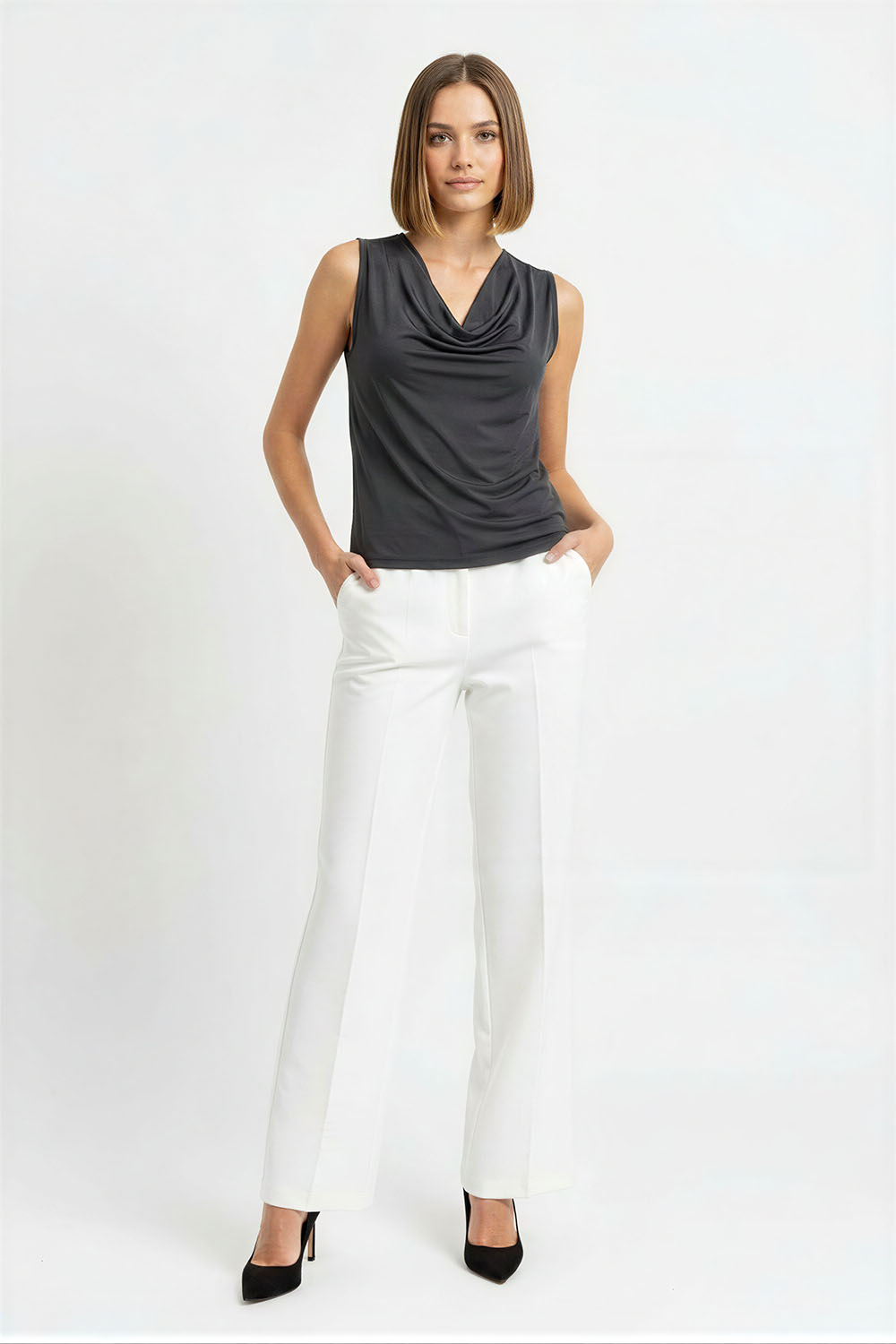 Blusa sin mangas con cuello drapeado que aporta caída suave y detalle distintivo, corte recto que brinda comodidad, confección en tejido ligero que se adapta al cuerpo, acabado fluido que permite movimiento natural
