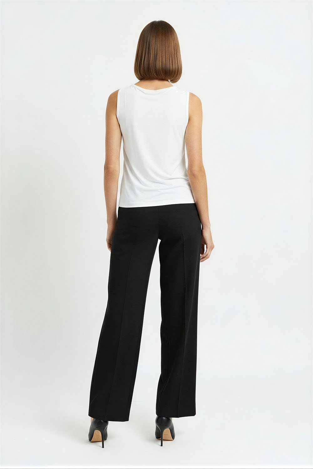 Playera sin mangas con cuello alto y diseño asimétrico con abertura frontal discreta, drapeado lateral que aporta textura y definición a la silueta, confección en tela elástica de tacto suave que se adapta al cuerpo, largo a la cadera que brinda ajuste cómodo y estructura estilizada