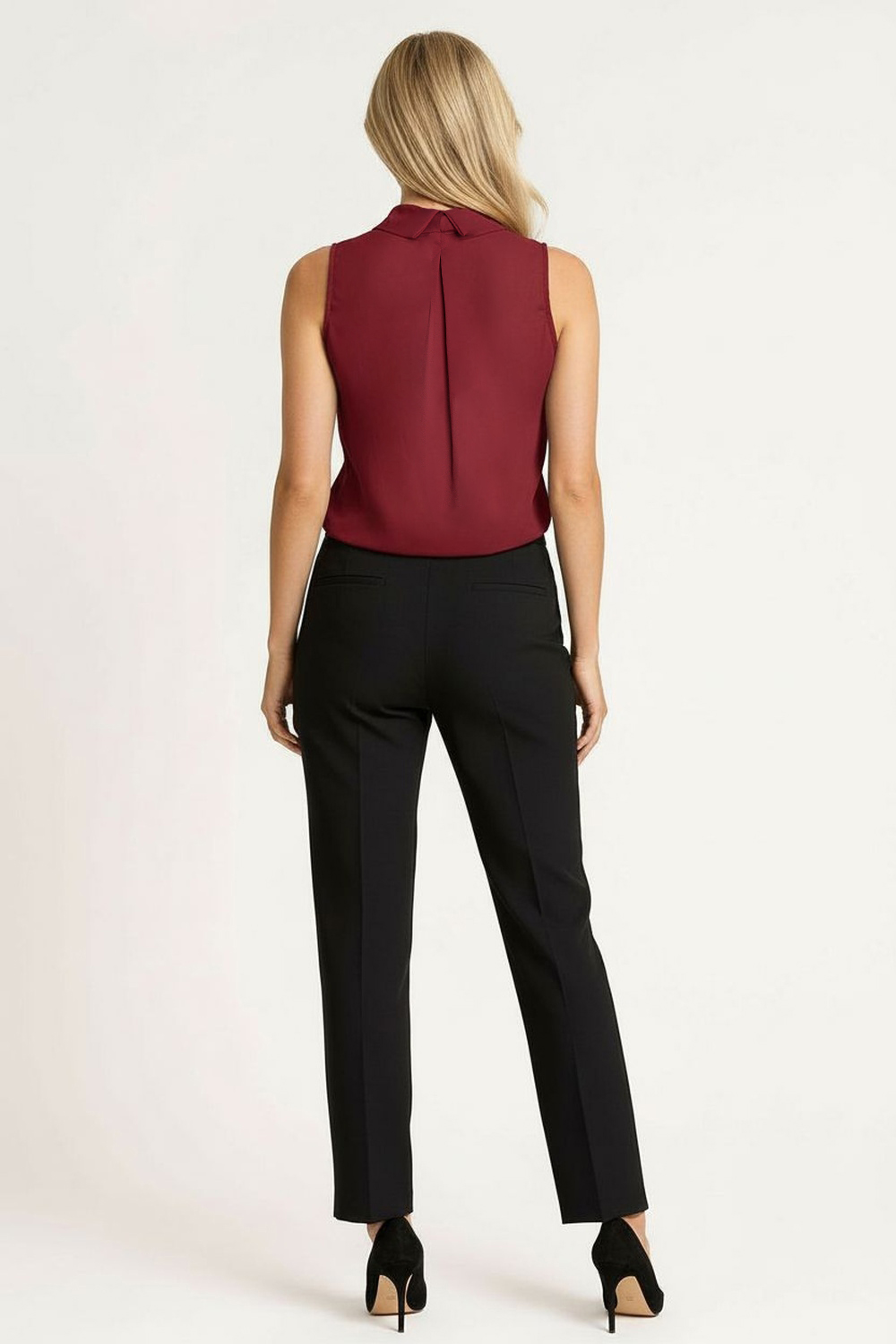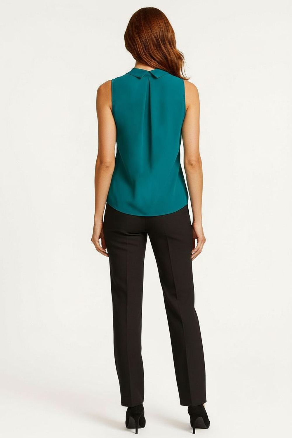 Blusa sin mangas con cuello drapeado que aporta caída elegante, diseño de espalda con pinza central que mejora el ajuste, confección en tejido ligero de tacto suave, corte recto que permite movimiento natural, terminaciones limpias que elevan la presentación