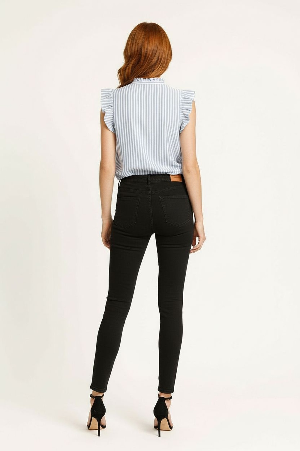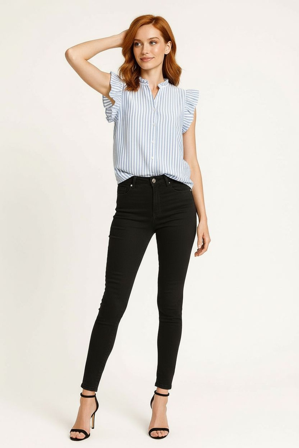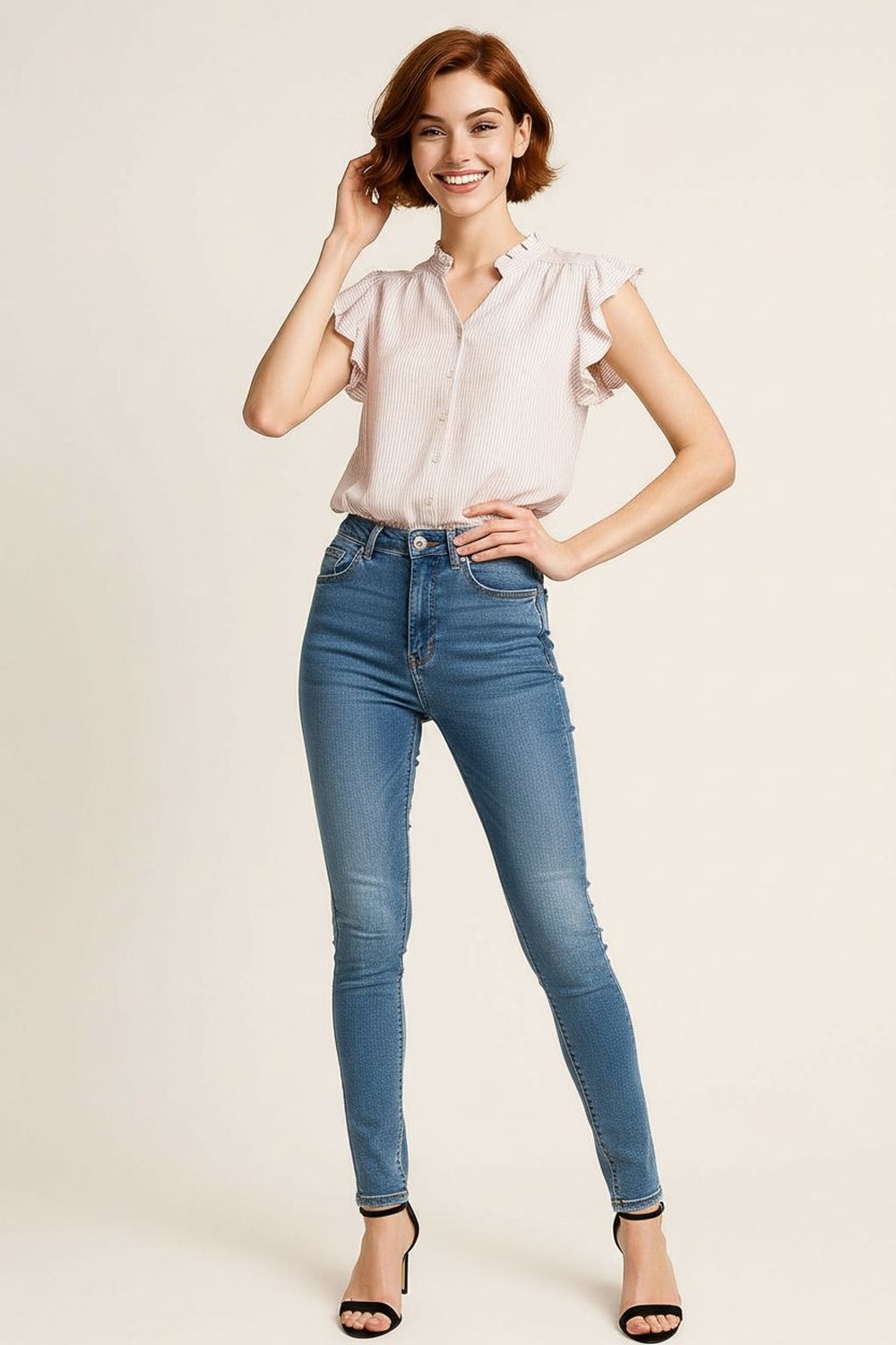 Blusa con cuello escarola, manga corta con olanes, cierre frontal con botones, estructura ligera, ajuste cómodo, caída fluida