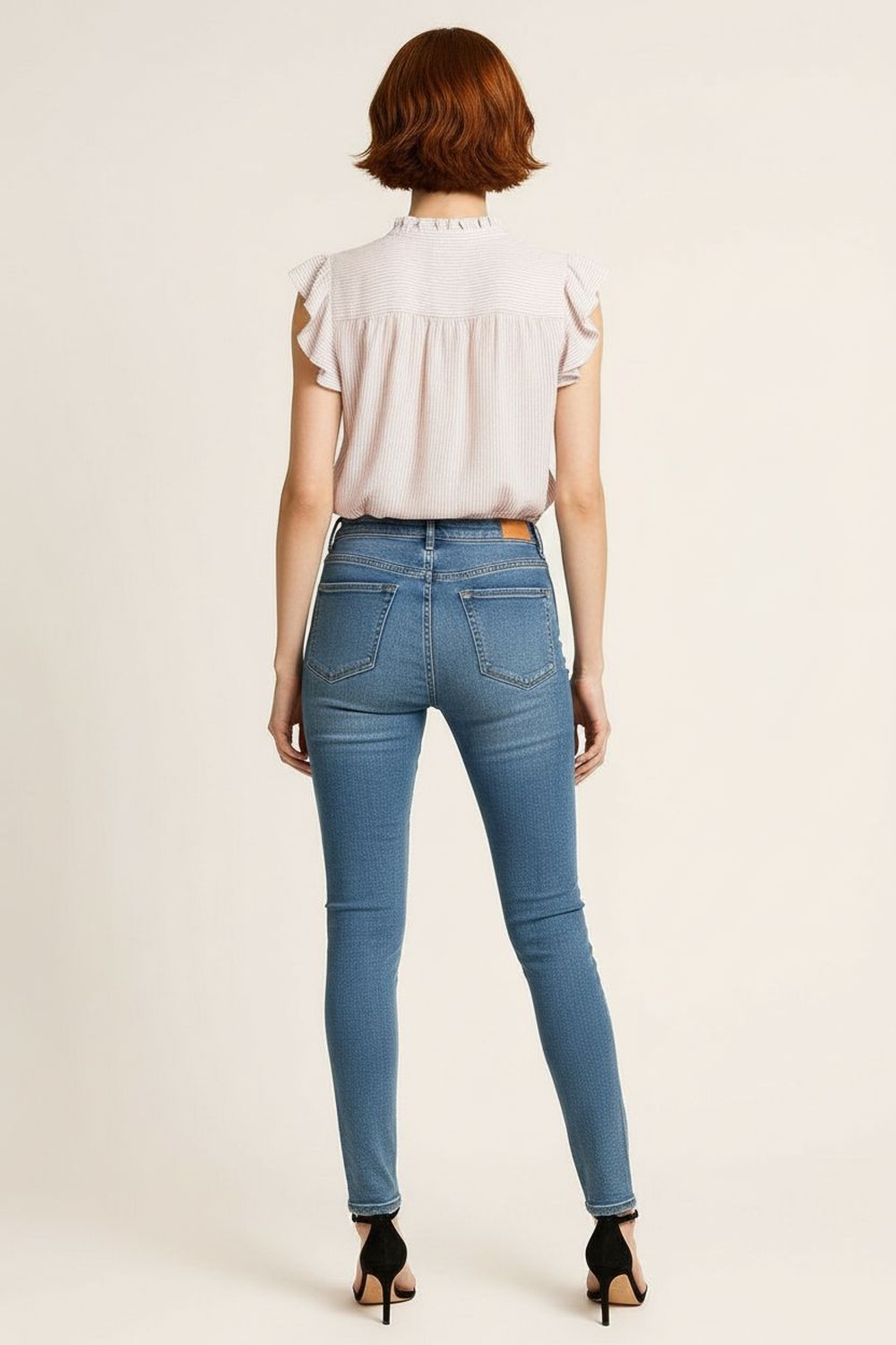 Blusa con cuello camisero y botonadura al frente, manga corta con detalle de vuelta y cierre mediante botones metálicos al tono, bolsillos funcionales en pecho que aportan estructura, dobladillo redondeado que permite un ajuste cómodo y moderno, confección en mezclilla suave con caída ligera