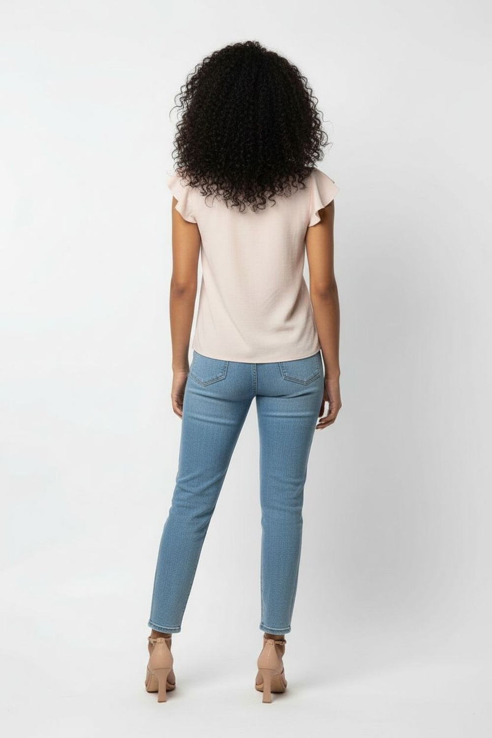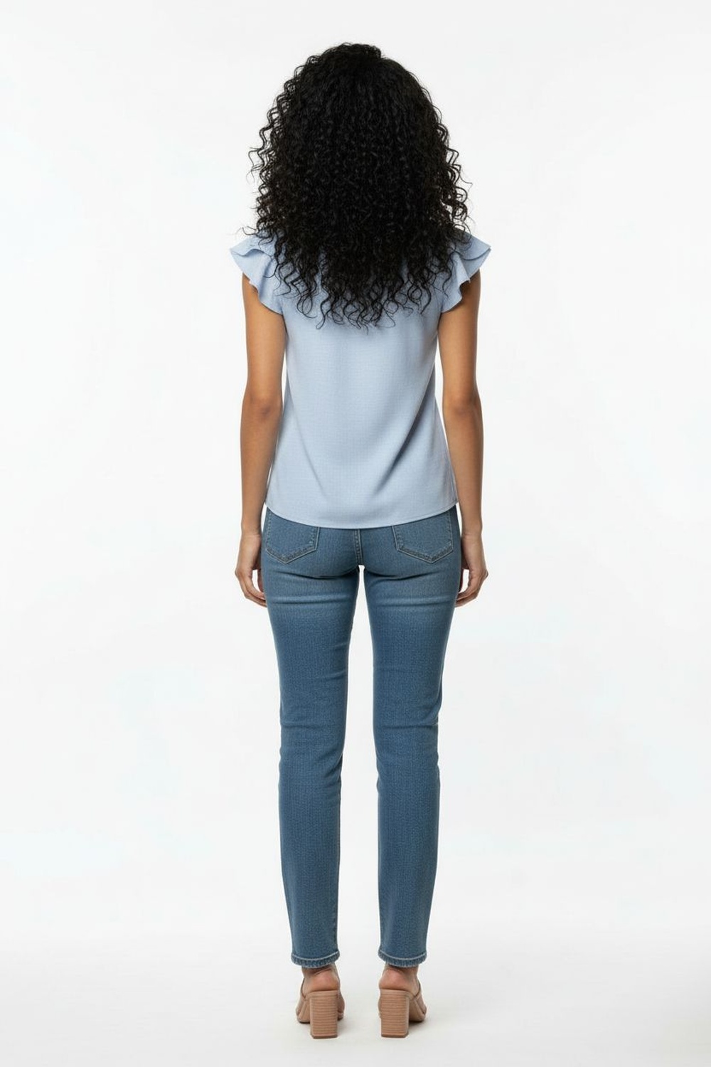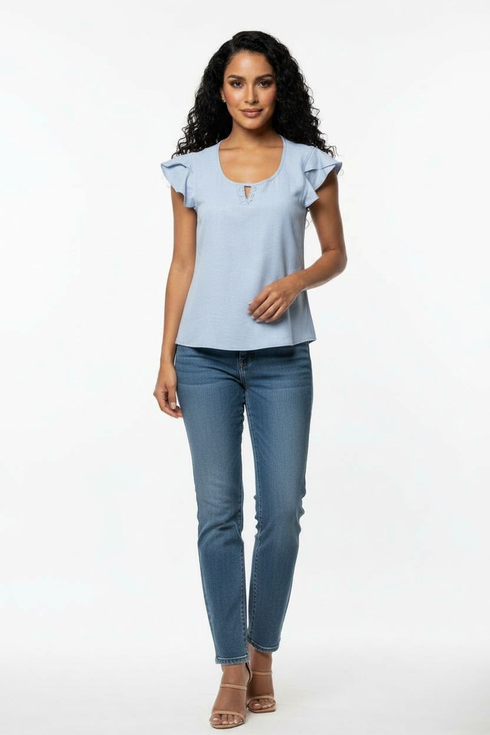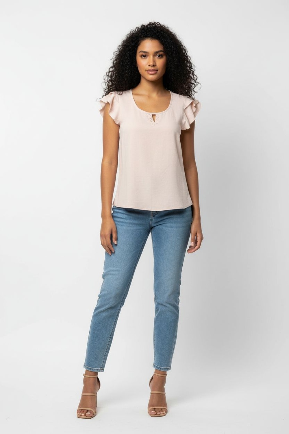Blusa con escote redondo y abertura tipo gota al frente, manga corta con ligero vuelo, estructura ligera, ajuste recto, terminación limpia