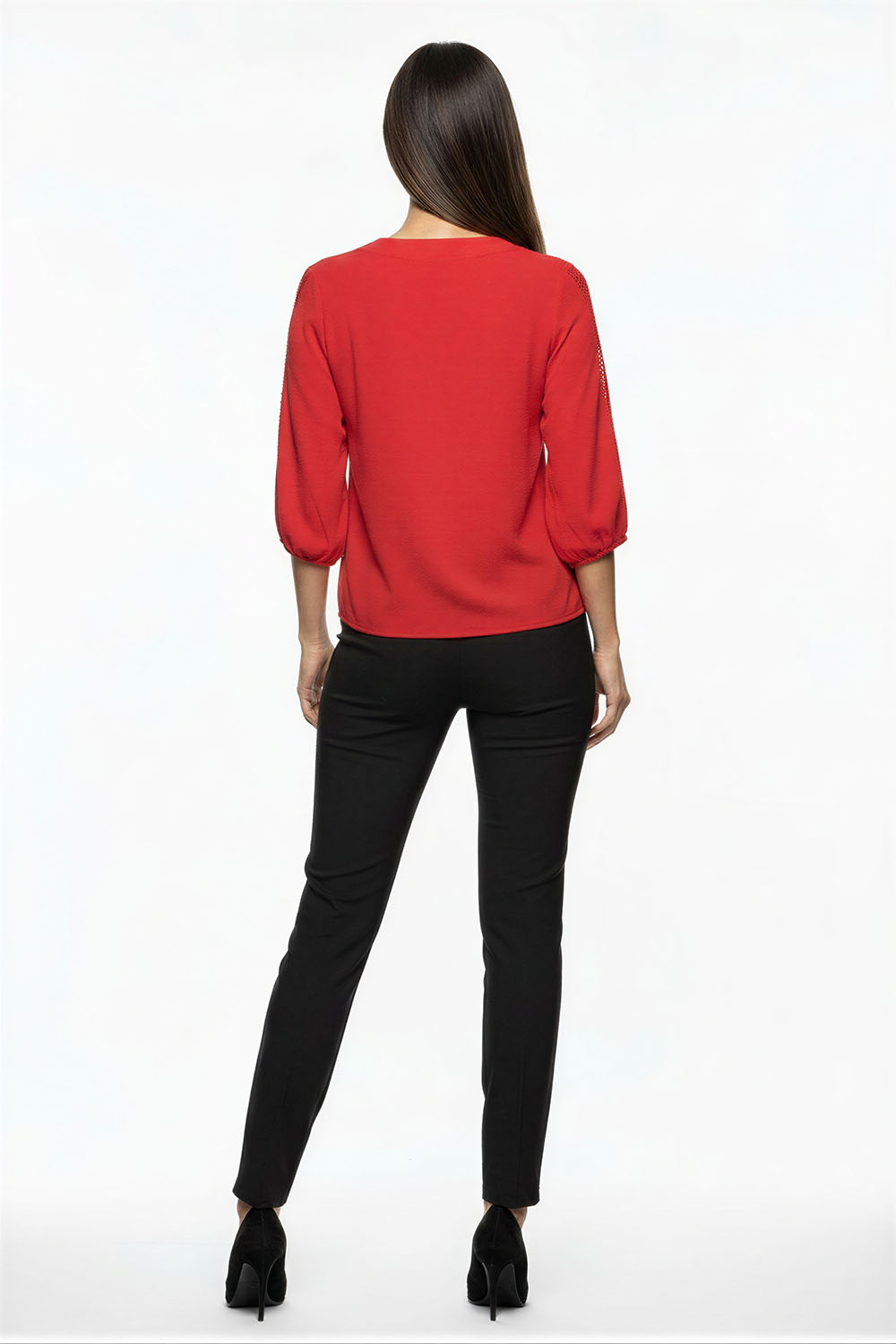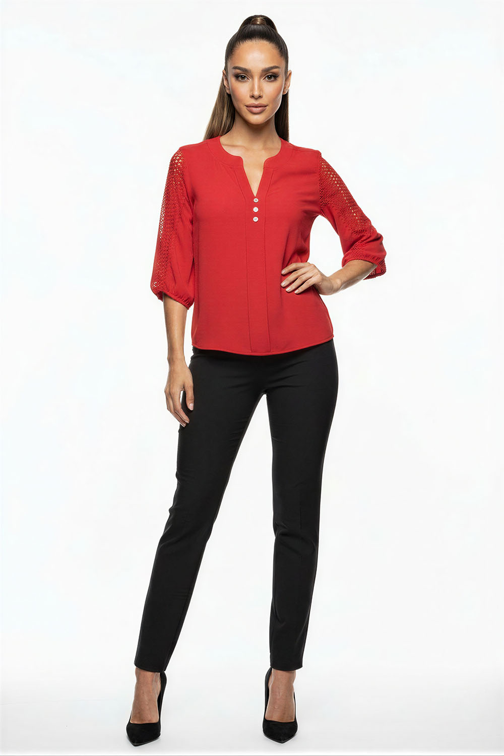 Blusa de corte recto con cuello mao que aporta una estructura limpia y estilizada, escote con abertura frontal que alarga visualmente la zona superior, botonadura decorativa al frente que añade detalle funcional, manga tres cuartos con acabado ligero que brinda comodidad en el uso diario, confección en tejido ligero que favorece la caída natural de la prenda y permite frescura durante el día