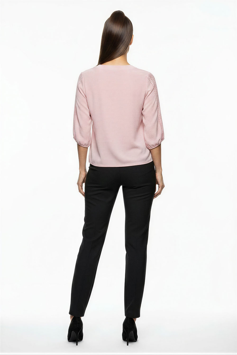 Blusa con jareta al frente que permite ajustar el escote, detalle de encaje en mangas y centro que realza el diseño, manga tres cuartos con franja decorativa que aporta elegancia, confeccionada en tejido de textura ligera con caída suave