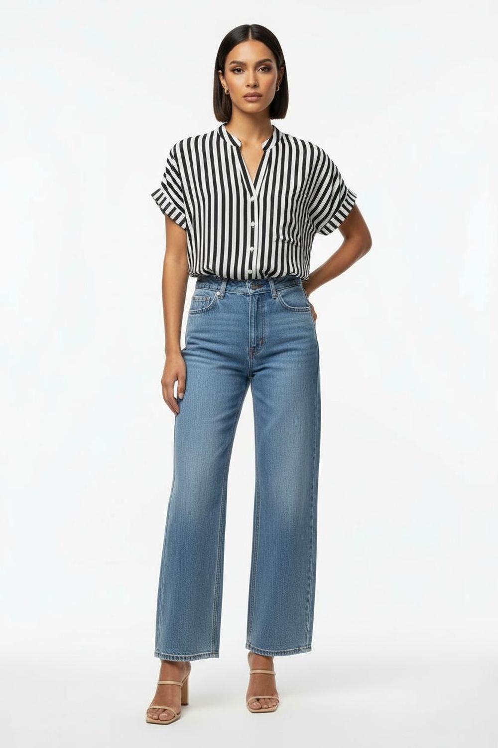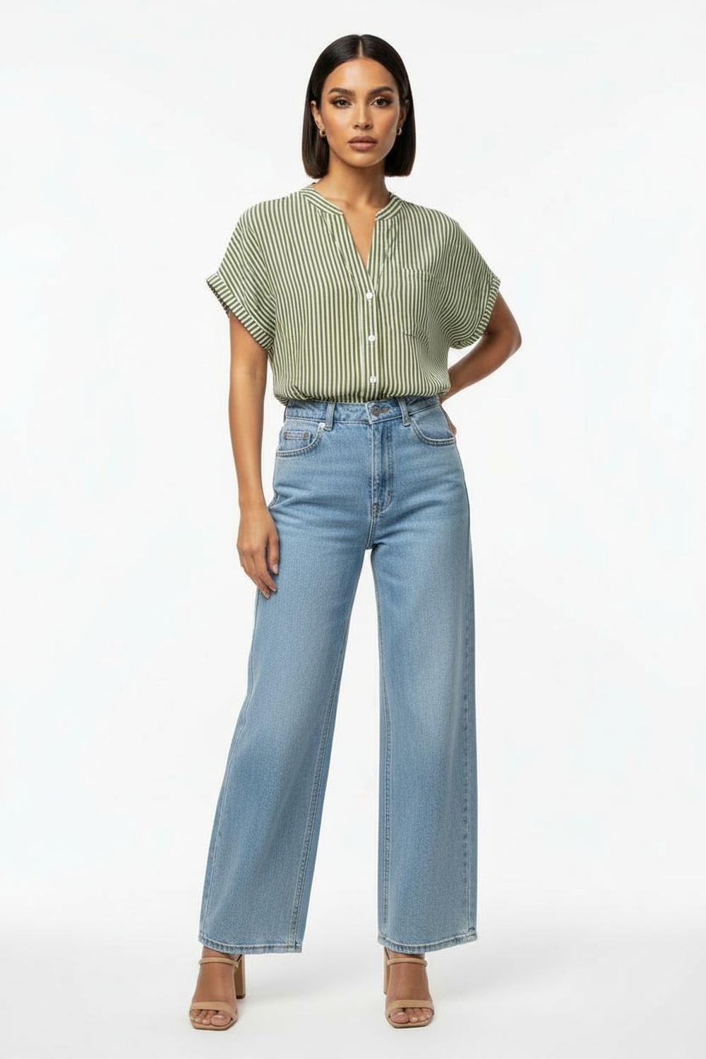 Blusa camisera de corte recto con cuello estructurado y botonadura frontal completa, manga corta con vuelta integrada que aporta definición en hombro, bolsa funcional al frente que suma practicidad, bajo ligeramente redondeado que estiliza la silueta y permite mejor caída, confección ligera de tacto suave que brinda comodidad durante todo el día