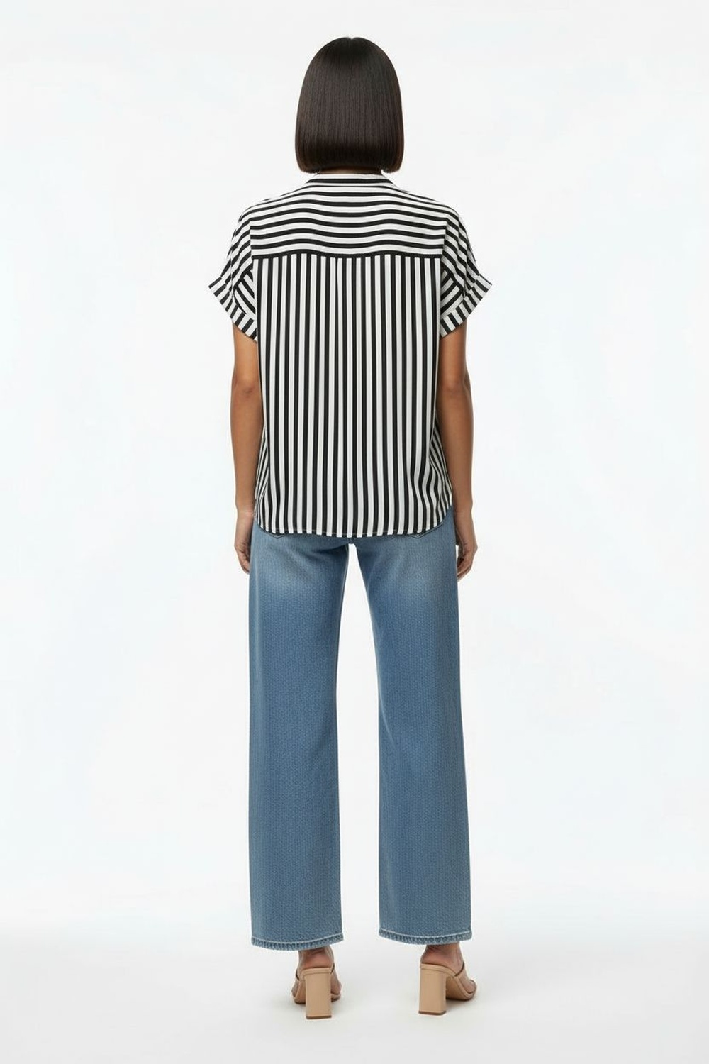 Blusa con cuello mao, manga corta, botonadura frontal, bolsillo en pecho, corte recto, ajuste cómodo