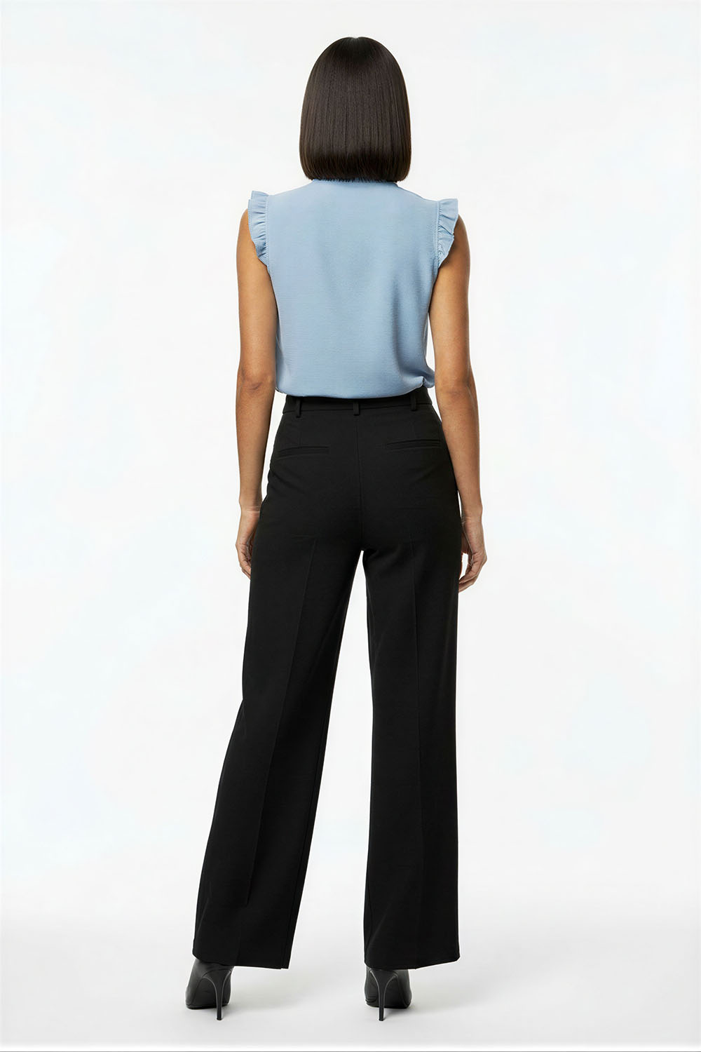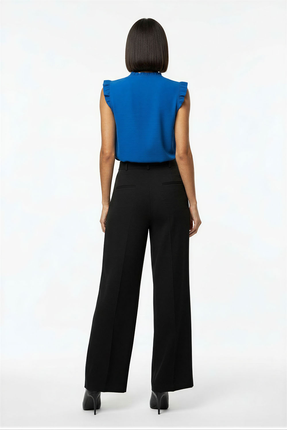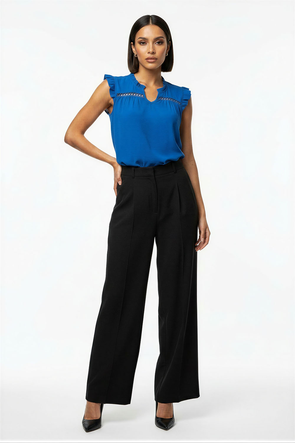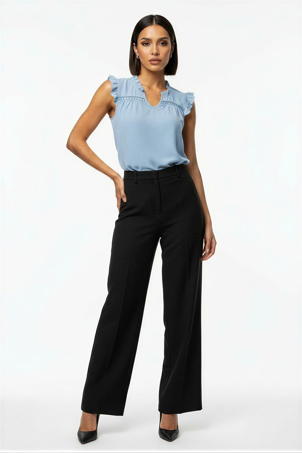 Blusa con cuello mao y abertura frontal en escote que aporta estructura, diseño sin mangas con olanes en hombros que brindan volumen, detalle calado en la parte superior que agrega textura visual, confección en tejido suave de buena caída que favorece el ajuste, largo regular de uso versátil