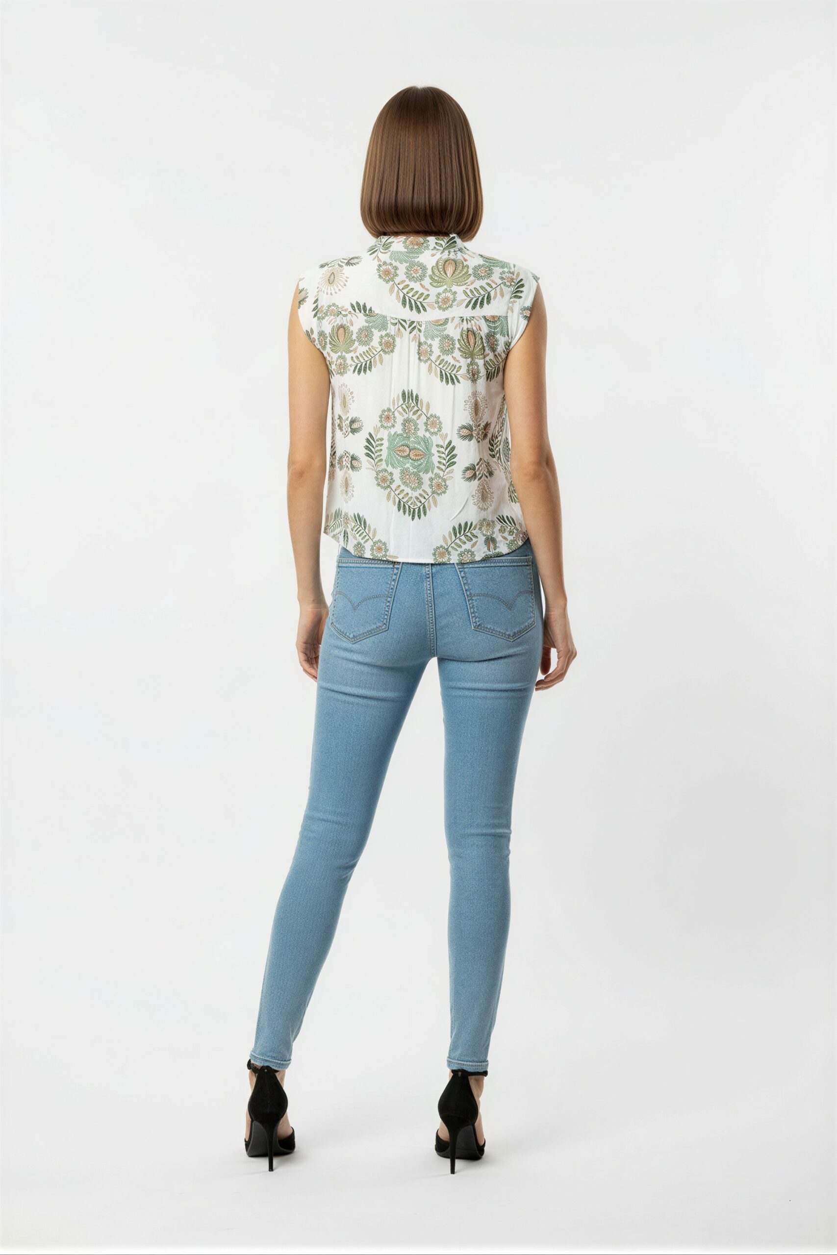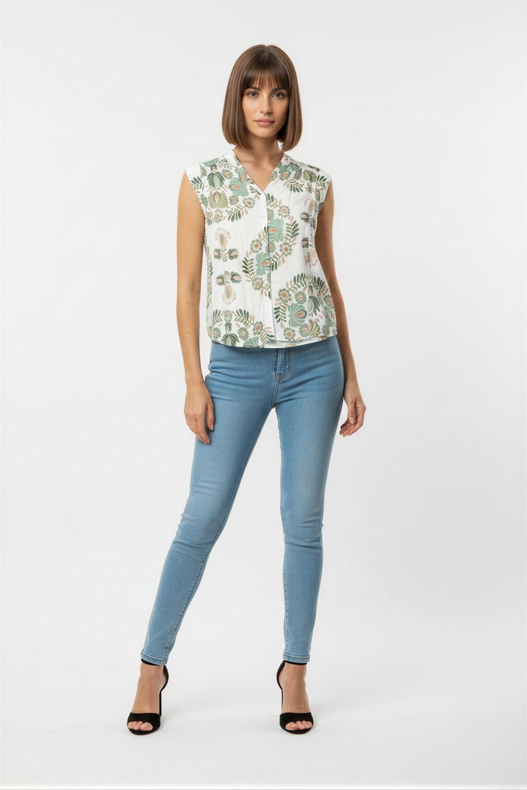 Blusa con cuello mao, sin manga, cierre frontal oculto, corte recto, caída ligera, ajuste cómodo
