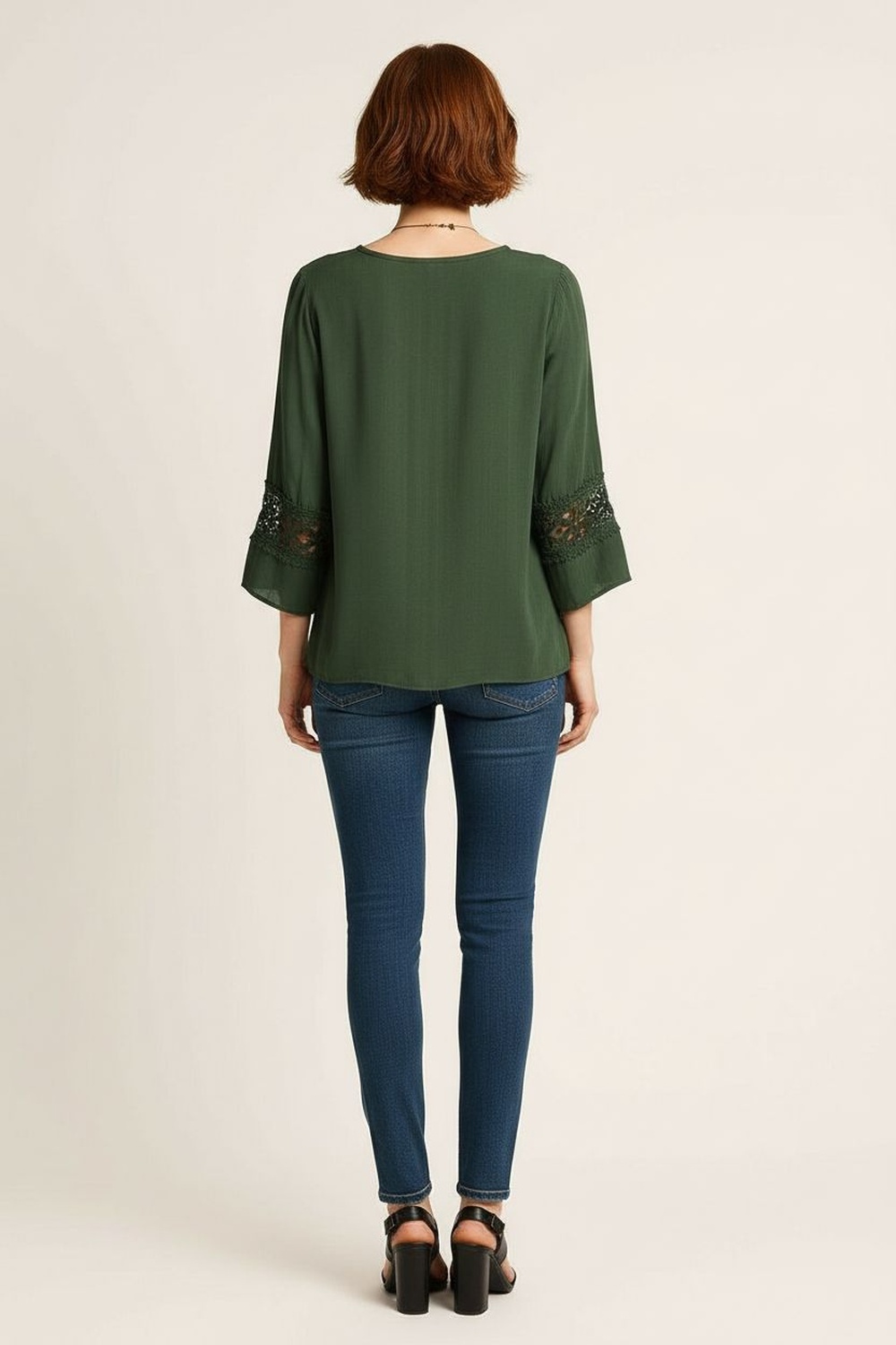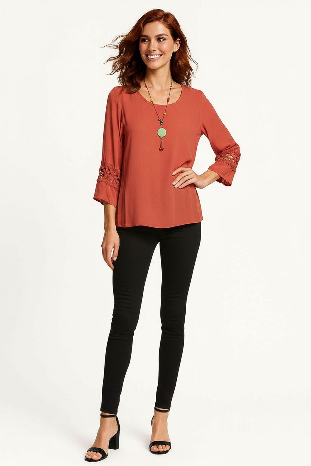 Blusa de cuello redondo amplio con manga tres cuartos y detalle calado integrado en el brazo, corte recto que brinda libertad de movimiento, largo medio que cubre la zona de la cadera, confección con textura visible y caída ligera que aporta comodidad durante el uso