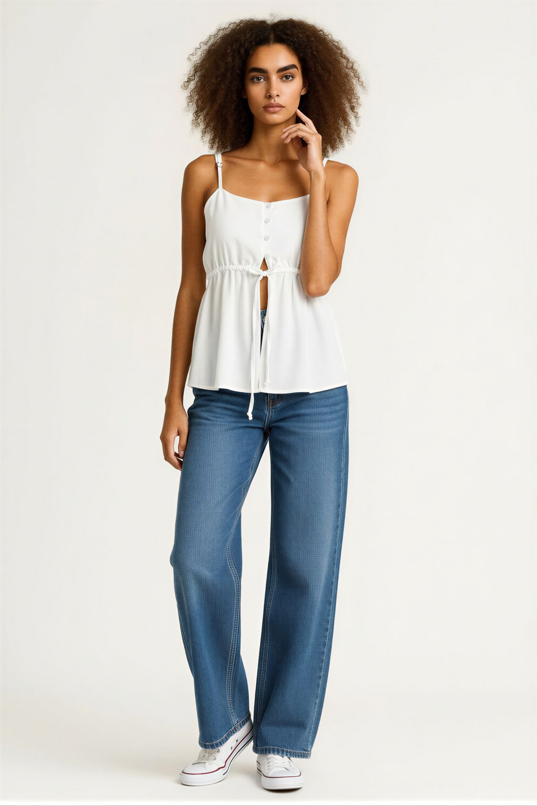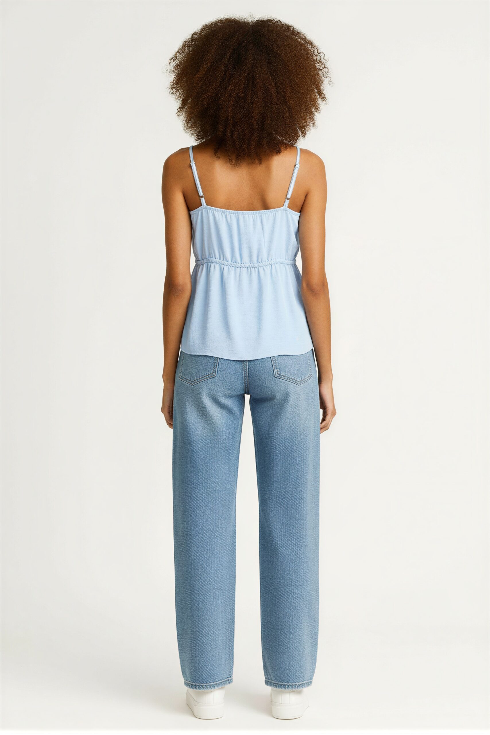 Blusa de tirantes delgados con escote recto, botonadura frontal funcional, ajuste mediante jareta en cintura que estiliza la silueta, corte suelto que brinda comodidad, confección ligera para uso continuo