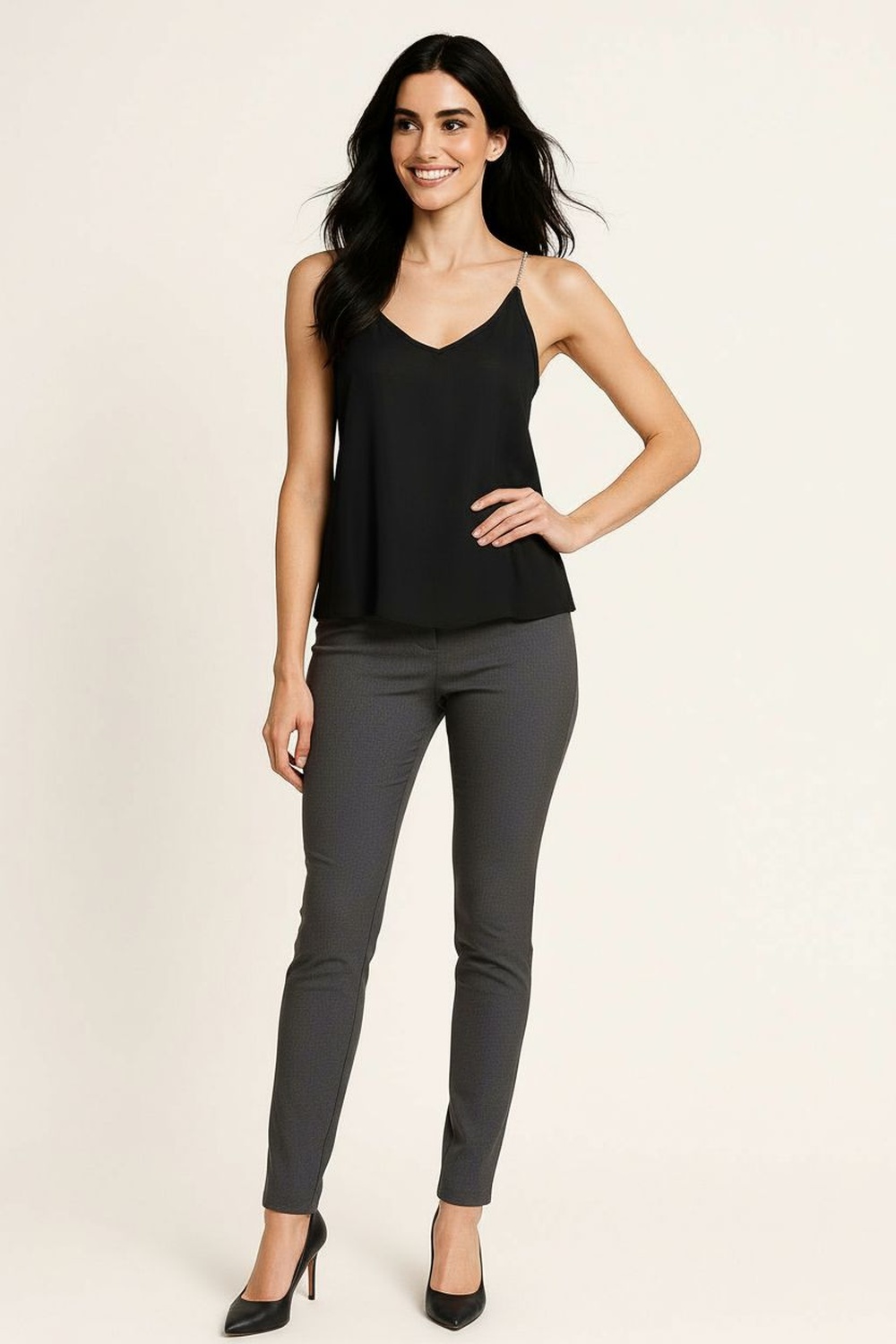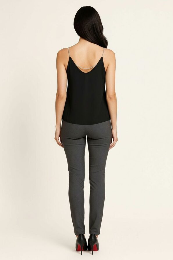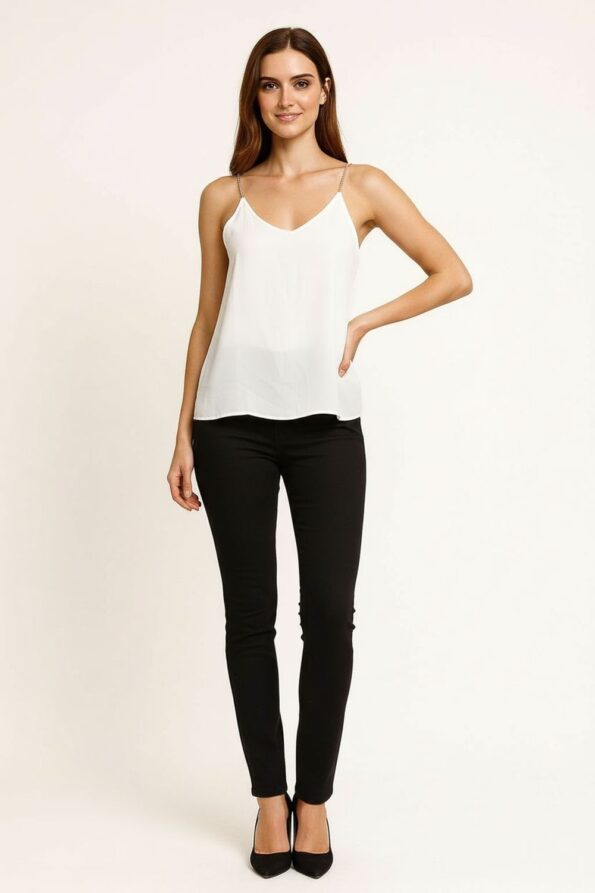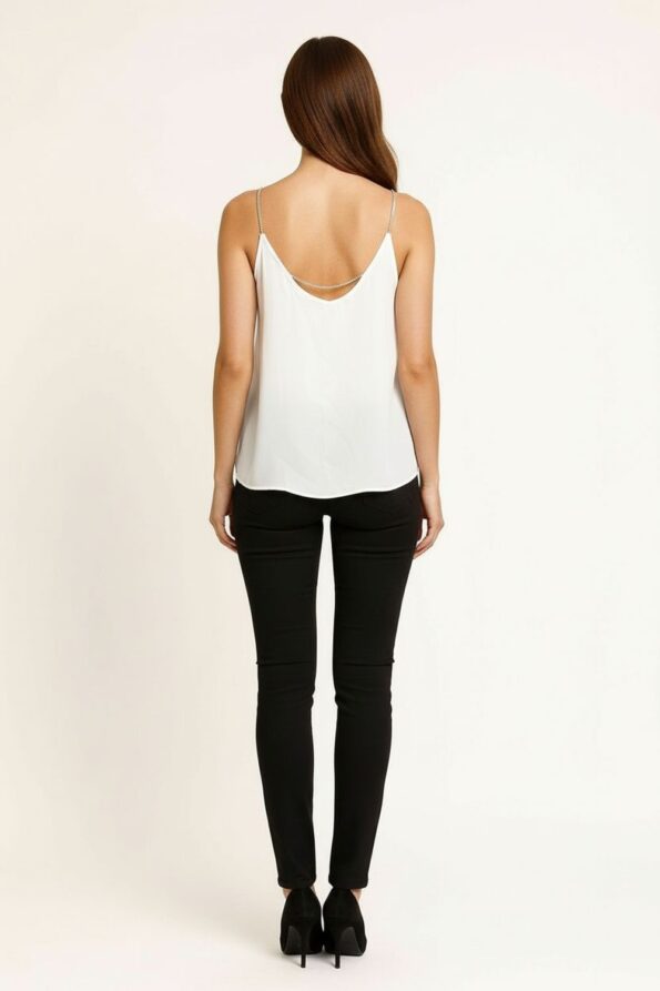 Blusa de tirantes delgados adornados con pedrería que aporta un toque sofisticado y brillante, escote en V delantero y trasero que realza la silueta con delicadeza, silueta recta y ligera que favorece la comodidad y versatilidad en combinaciones, confección en tela suave que brinda frescura y libertad de movimiento