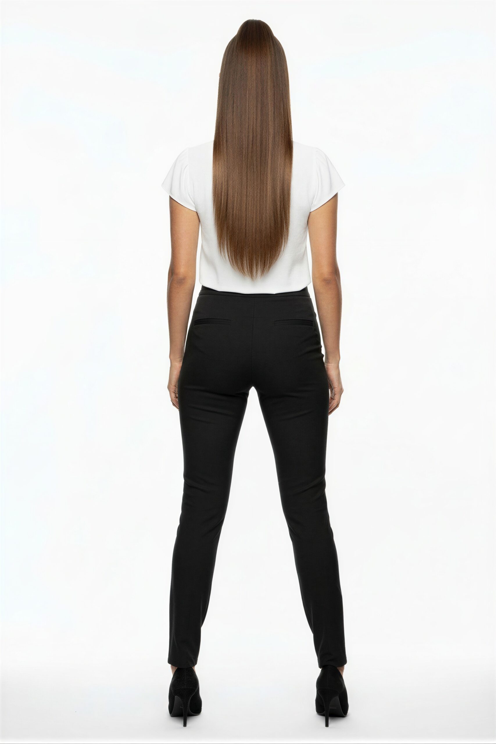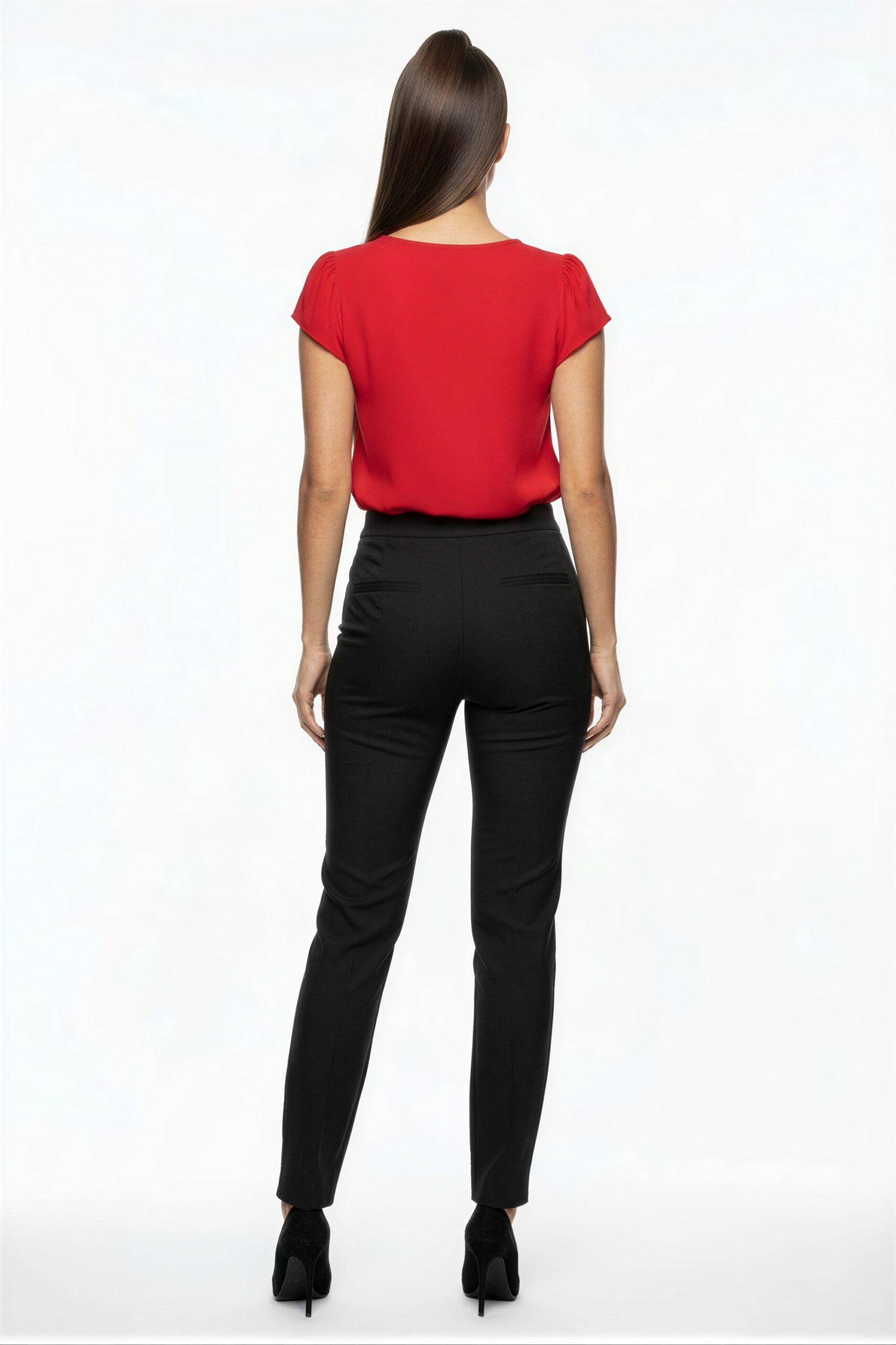 Pantalón acampanado con cierre frontal y botón, diseño de tiro medio, costuras definidas, corte que estiliza la silueta, ajuste cómodo